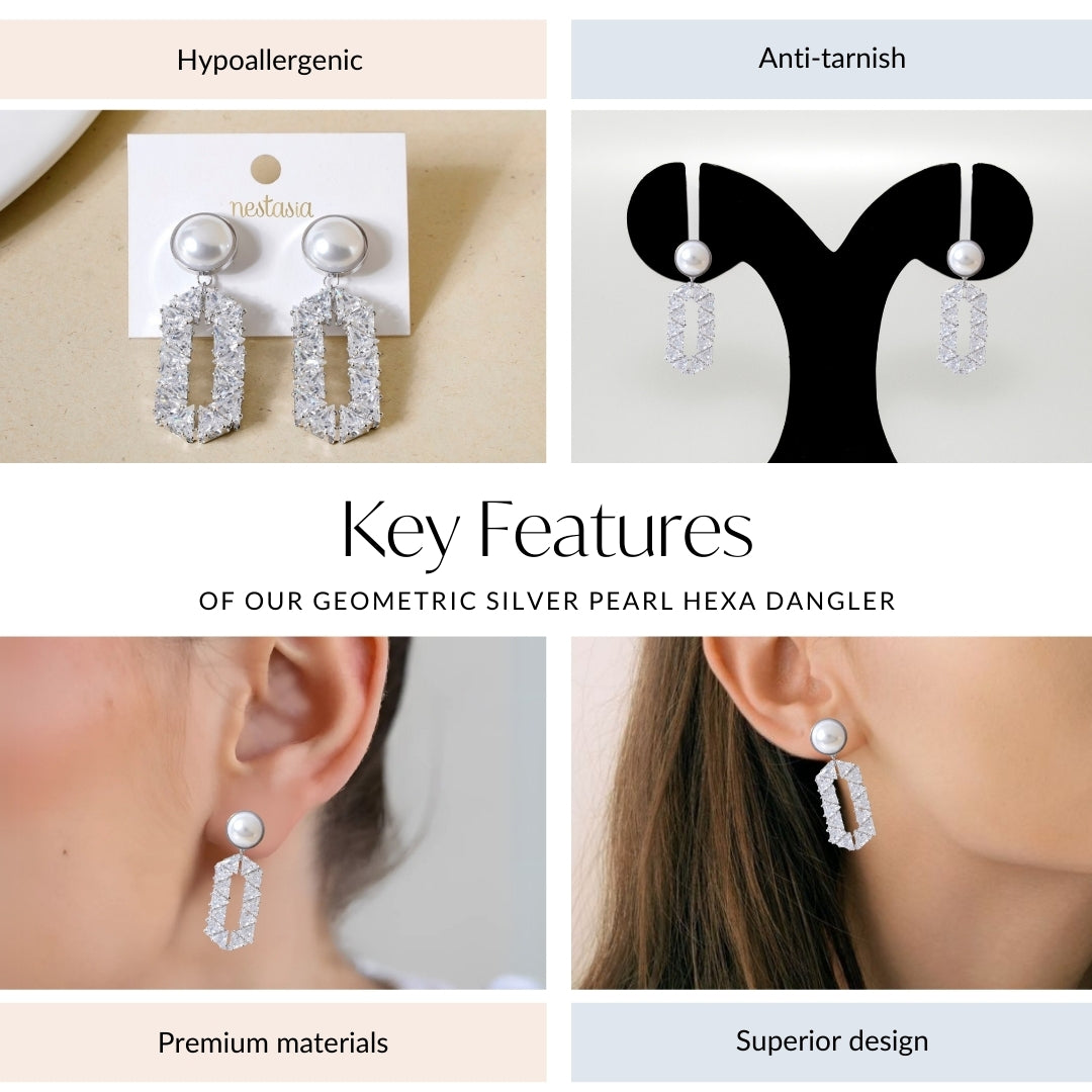 Geometric Silver Pearl Hexa Dangler