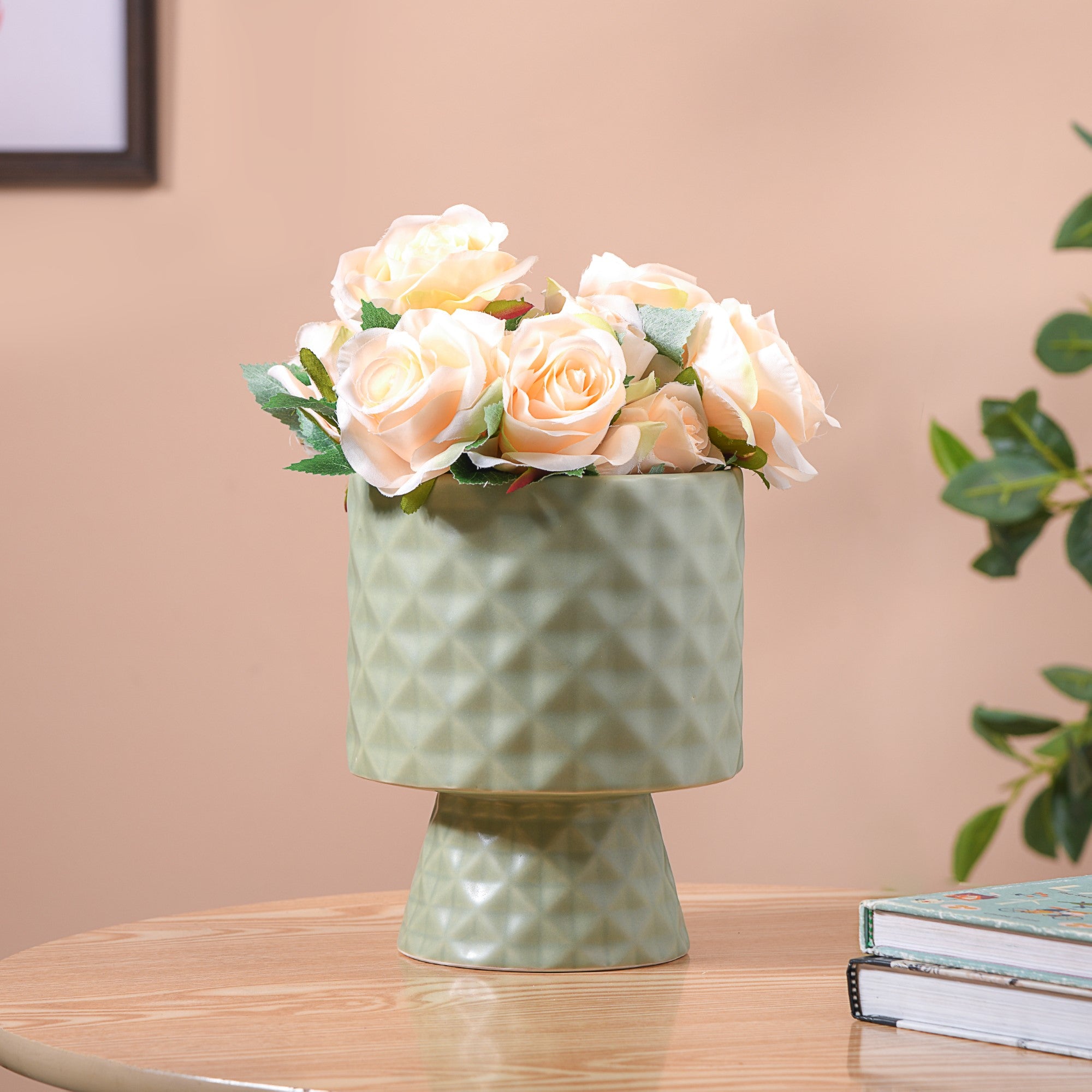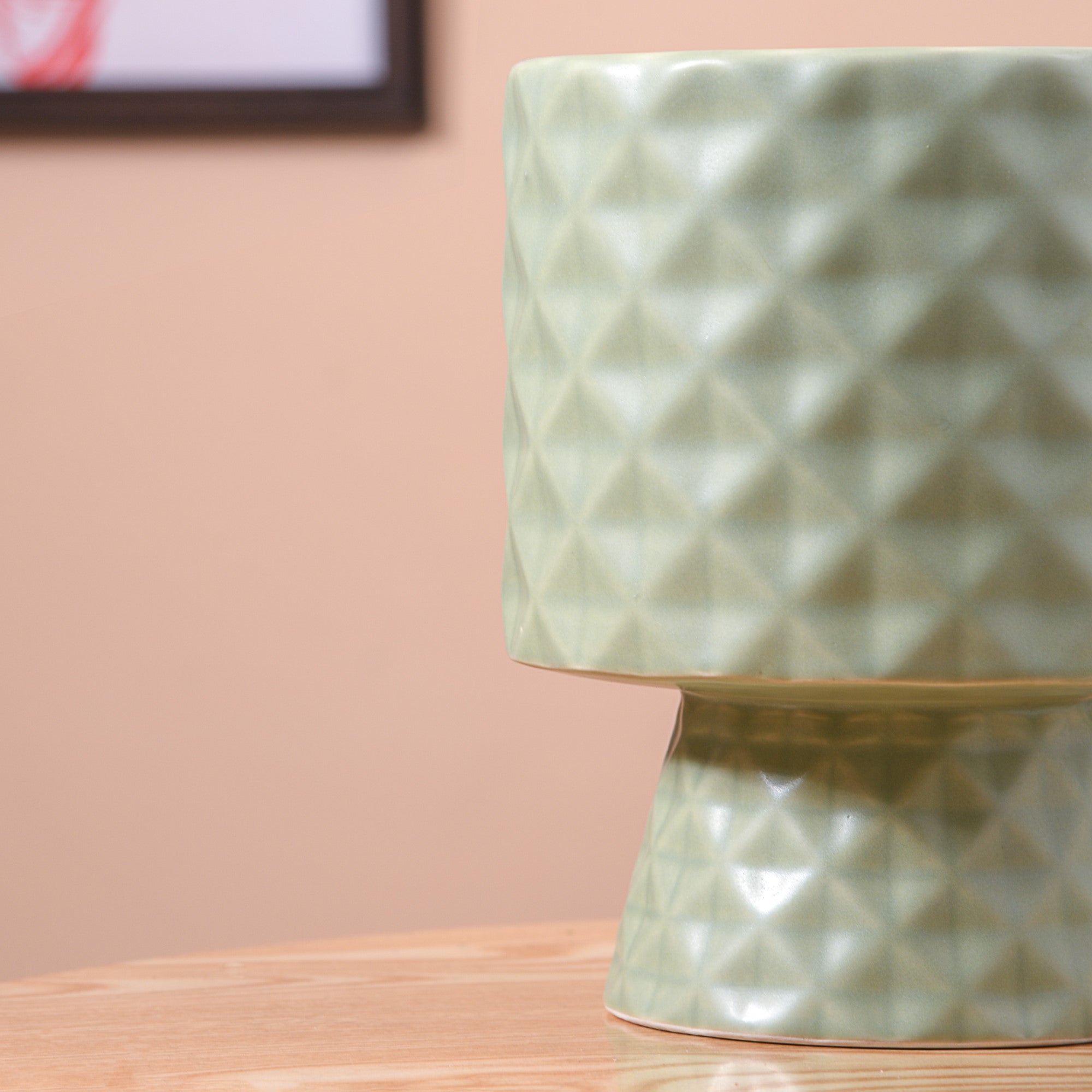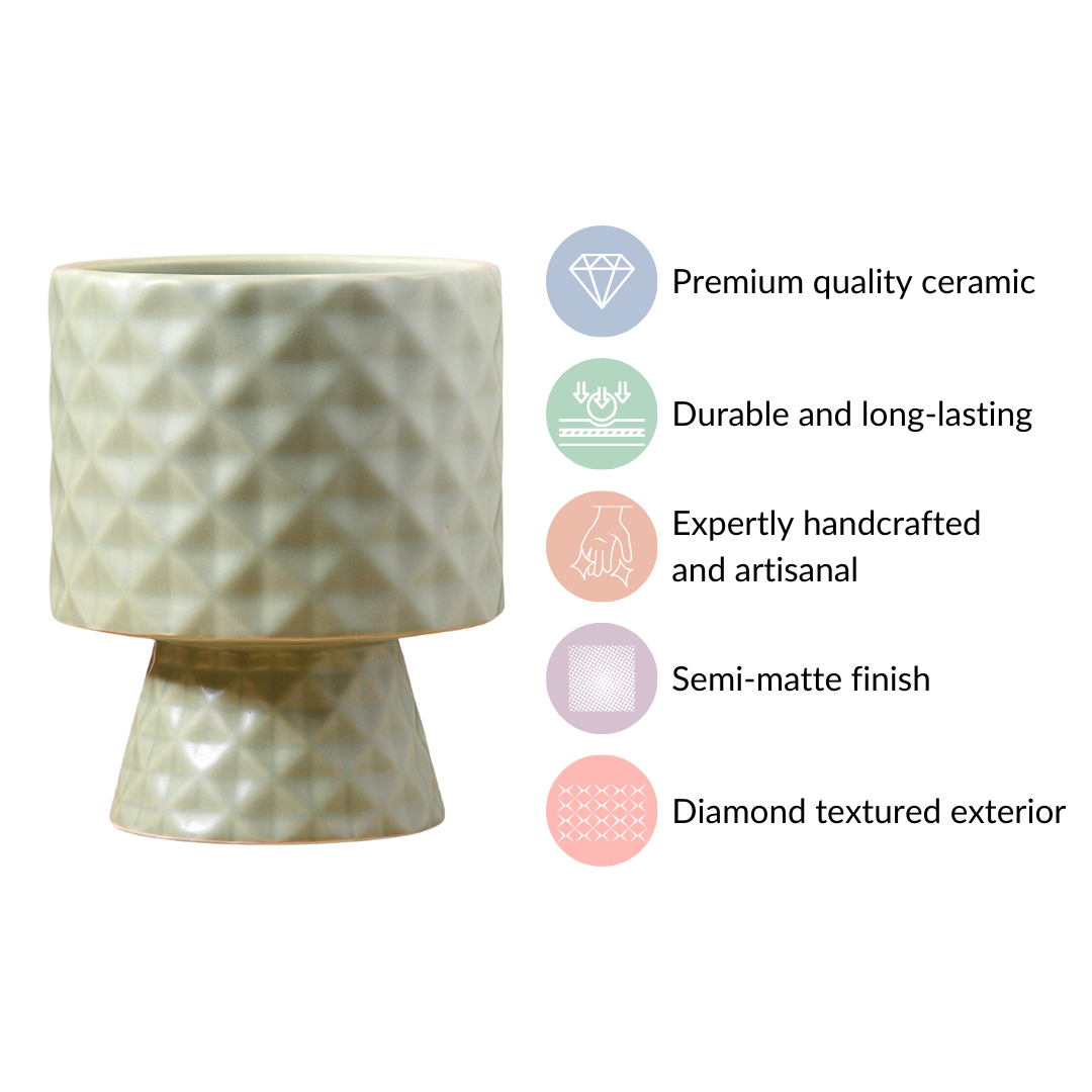 Elevate your home decor with our ceramic pot - the perfect fusion of nature's serenity and contemporary design. The exceptional flower vase boasts a unique diamond texture, meticulously crafted to bring a touch of sophistication and modernity to your home decor. With both the top and base adorned in a soothing sage green hue, this flower pot is an inviting and versatile addition to any living space. The earthy and muted green tone brings a touch of the outdoors into your indoor space, making it a perfect addition for all nature enthusiasts. The design provides a balanced and seamless look, allowing the piece to effortlessly integrate into your existing decor.