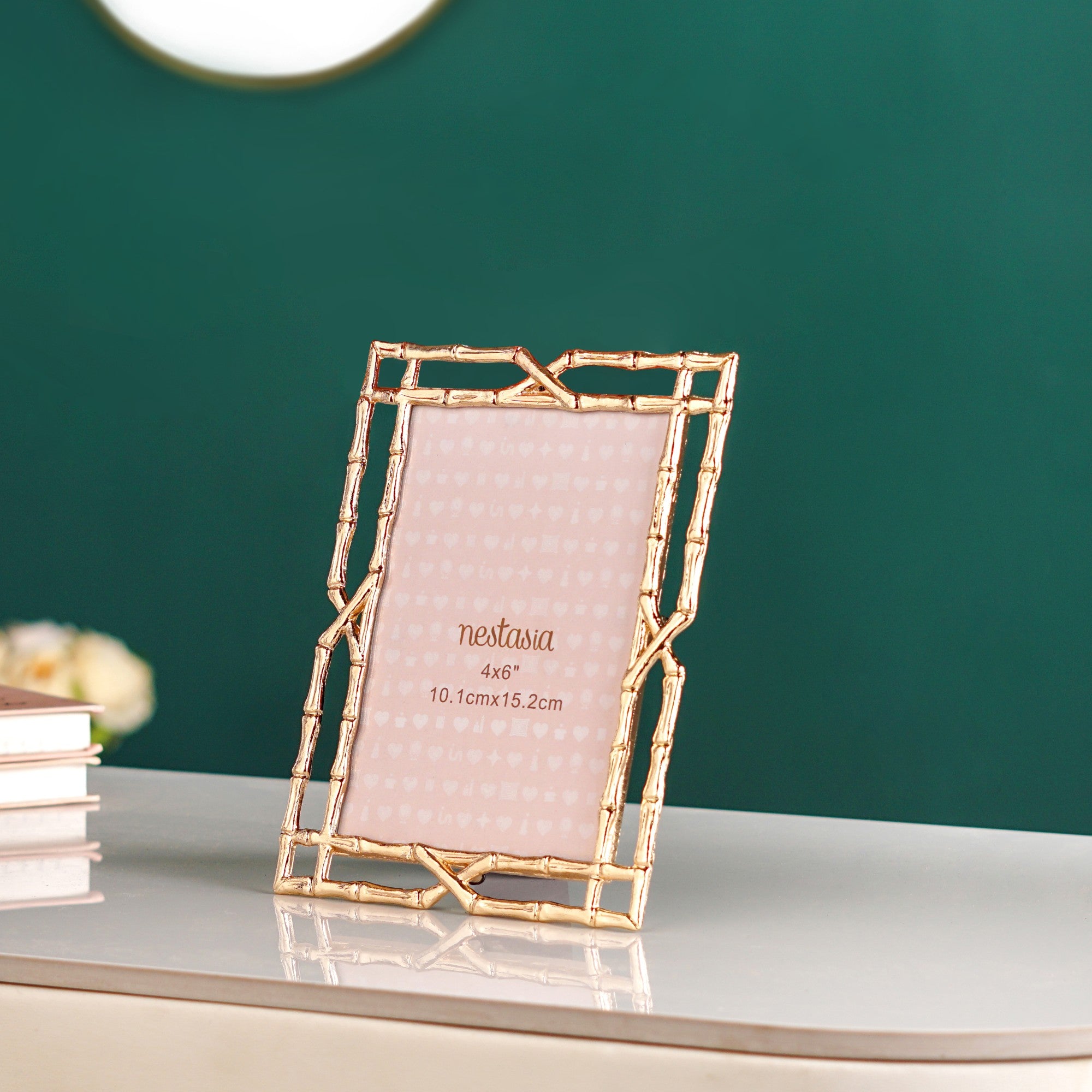 Design: Inspired by nature, this frame showcases an intricate golden bamboo-inspired design that lends an elegant, organic feel to your decor. The sleek rectangular shape boasts a high-sheen gloss finish, making it a truly eye-catching accent. Your photo is secured behind transparent acrylic photo frame material set in a metal rim, all built into a sturdy frame that ensures both beauty and lasting quality.