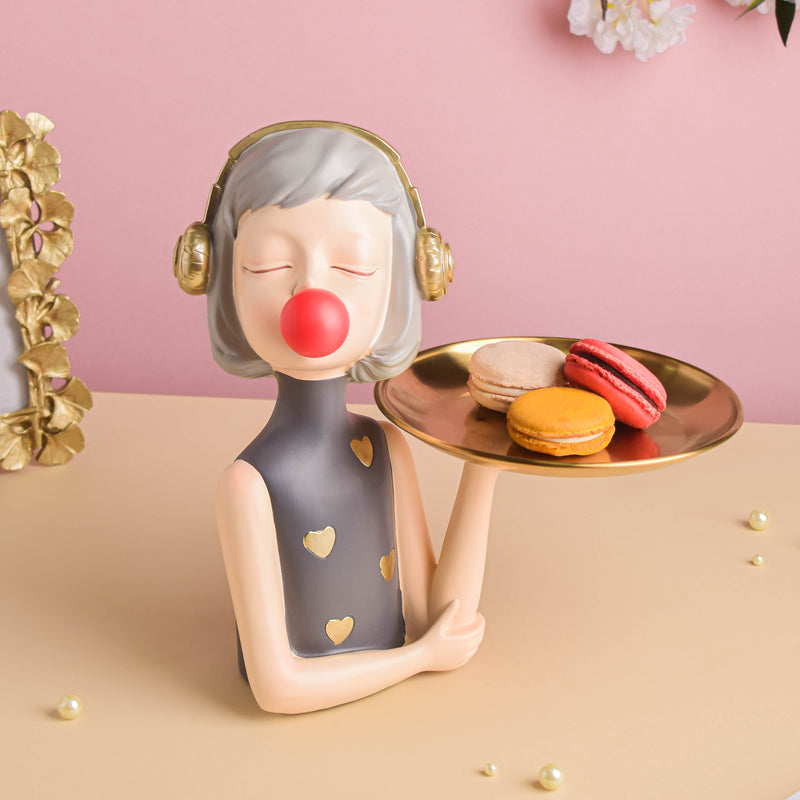 Introducing the unique and fascinating centrepiece, "Girl With Headphones Platter." This one-of-a-kind work of art adds a captivating twist to contemporary design, making it a visually attractive and lively addition to any room. The centrepiece is a gorgeously sculpted girl figurine wearing headphones that exudes originality and modernism. A platter is balanced in the girl's extended hands, creating an unanticipated element of surprise. This showpiece seamlessly combines artistic appeal with a dash of whimsy thanks to its complex details and brilliant colours, making it the ideal centrepiece for home décor or an eye-catching accent in cafes, studios, or offices.