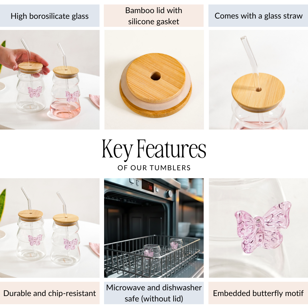 Design: The tumblers are crafted from clear borosilicate glass with a smooth transparent finish. Each piece features a decorative butterfly motif along the surface and a lightweight design that sits comfortably in the hand. The bamboo lids include a silicone gasket for a secure seal, while the reusable glass straws complete the set. The butterfly detailing enhances presentation, and the open design makes cleaning simple.