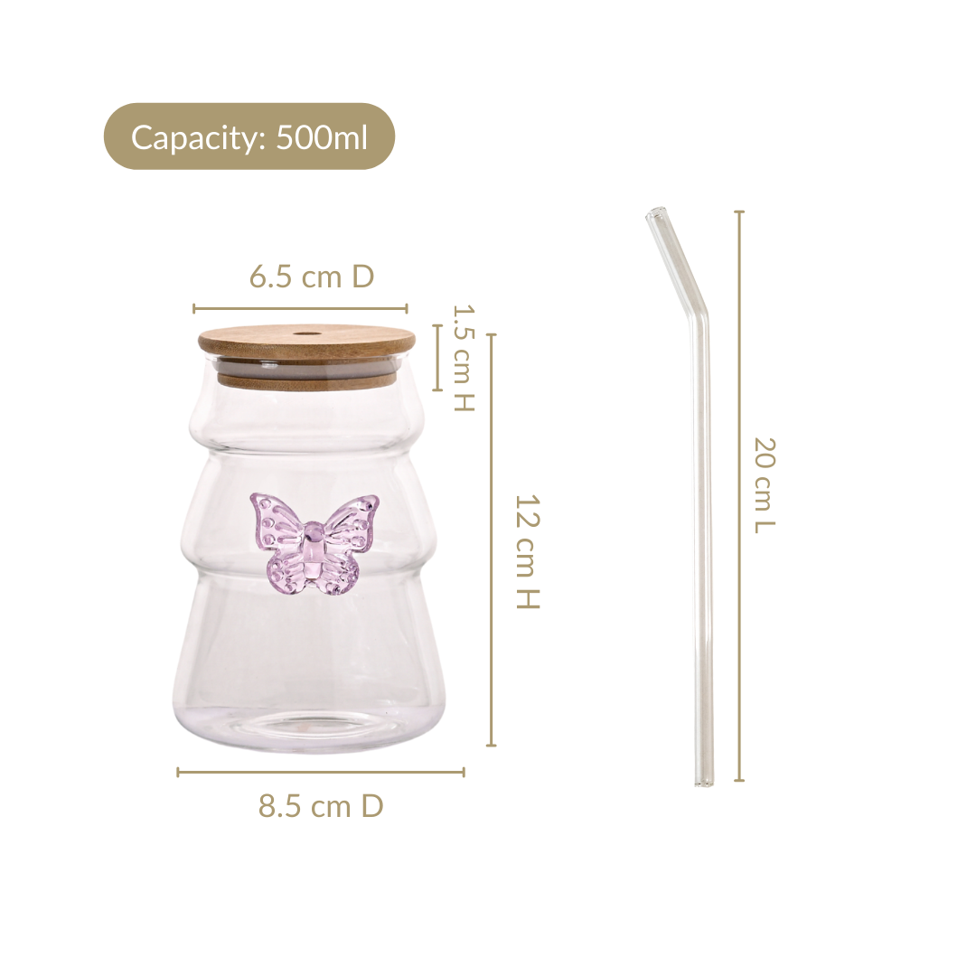 Girlie Butterfly Glass Tumbler With Straw Set Of 2 500ml