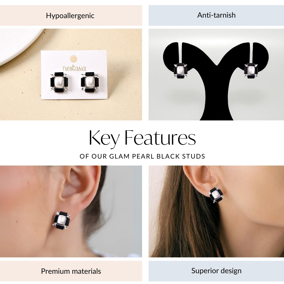 Refined and elegant, these stone studs are designed to captivate. Four black resin pieces form a sleek square pattern, accented by sparkling transparent stones. At the heart of the design, a luminous faux pearl adds a classic touch, making these earrings a perfect blend of the modern and the timeless.