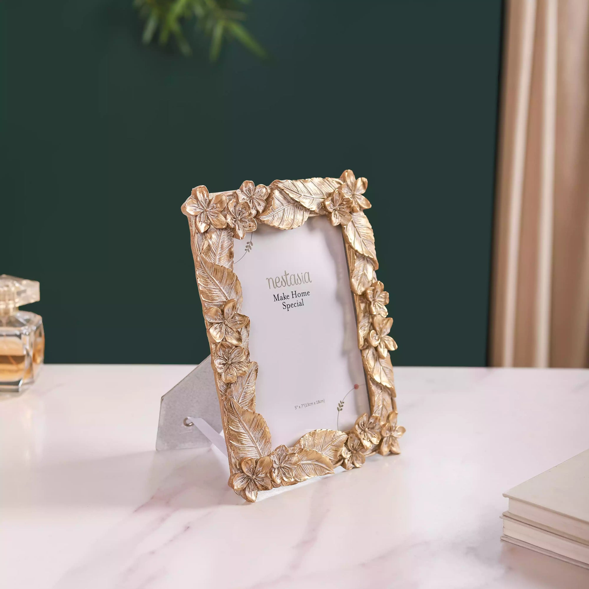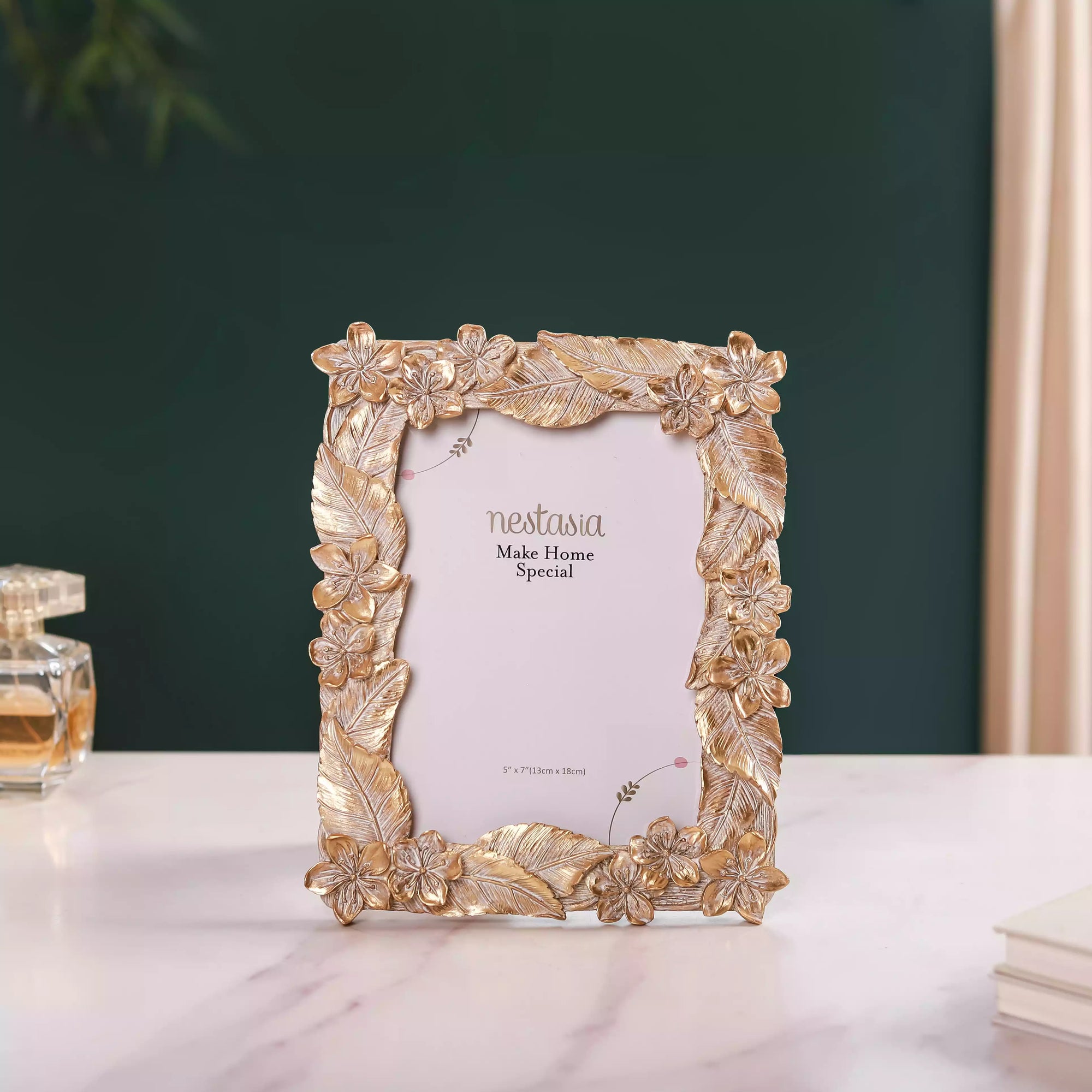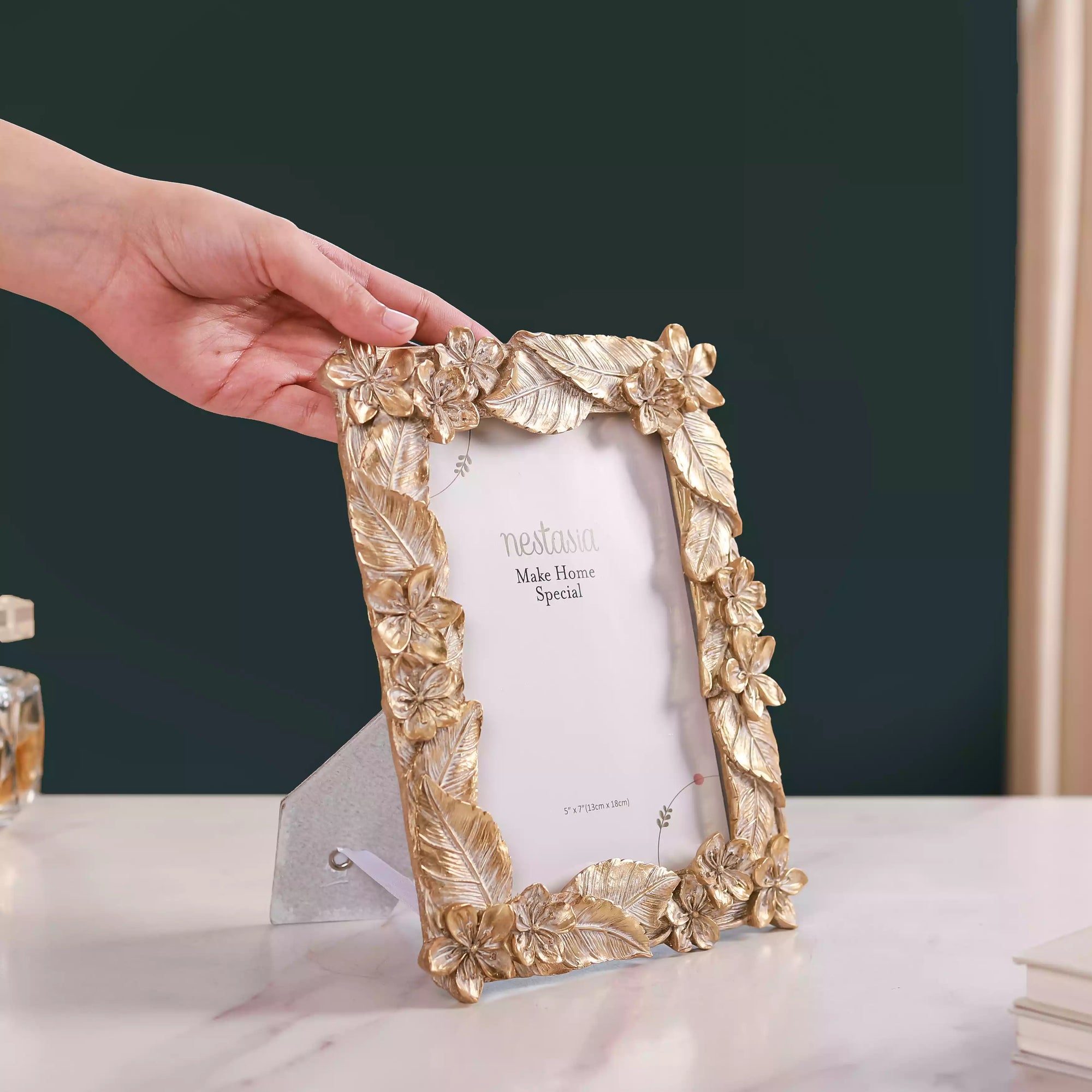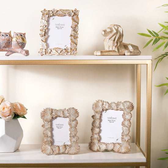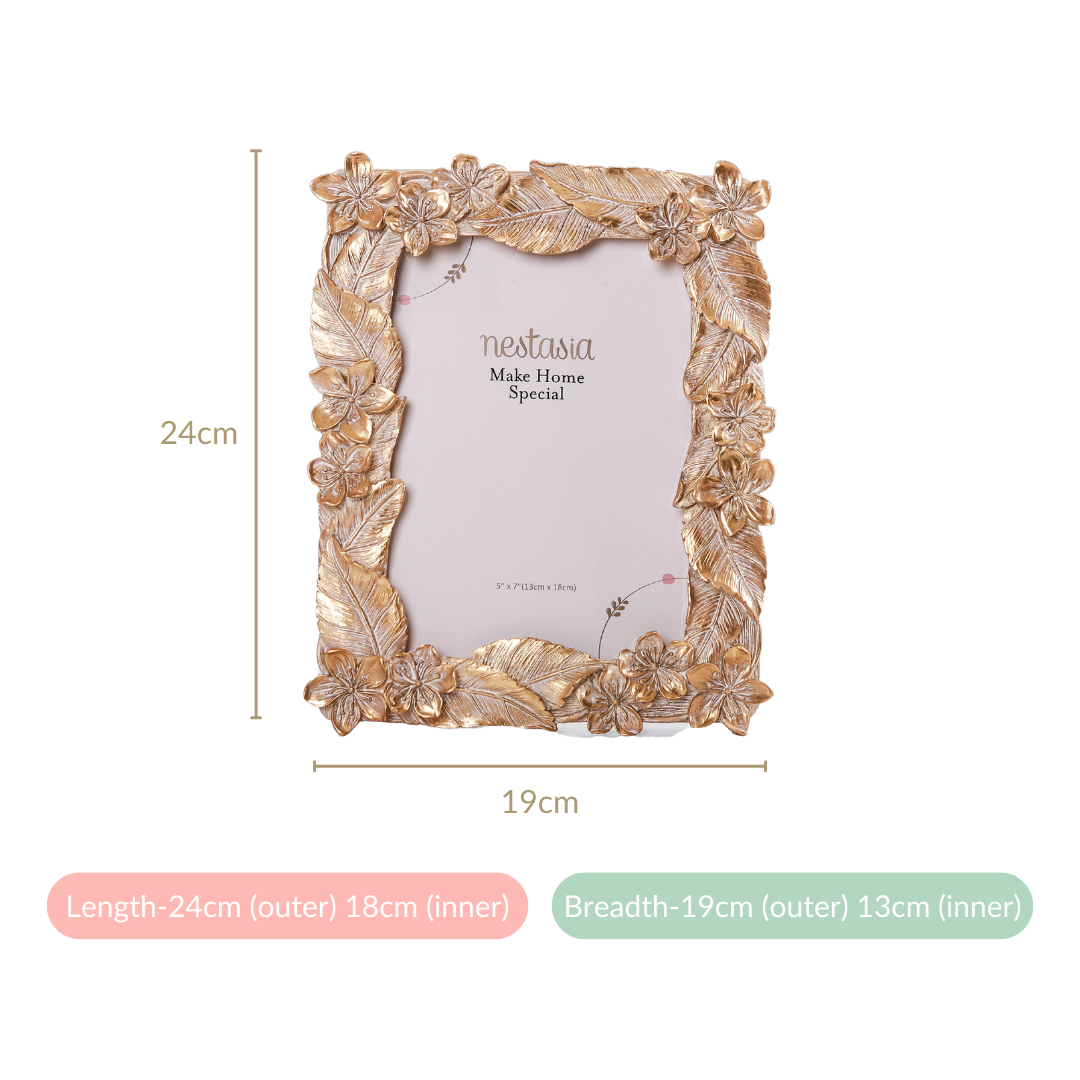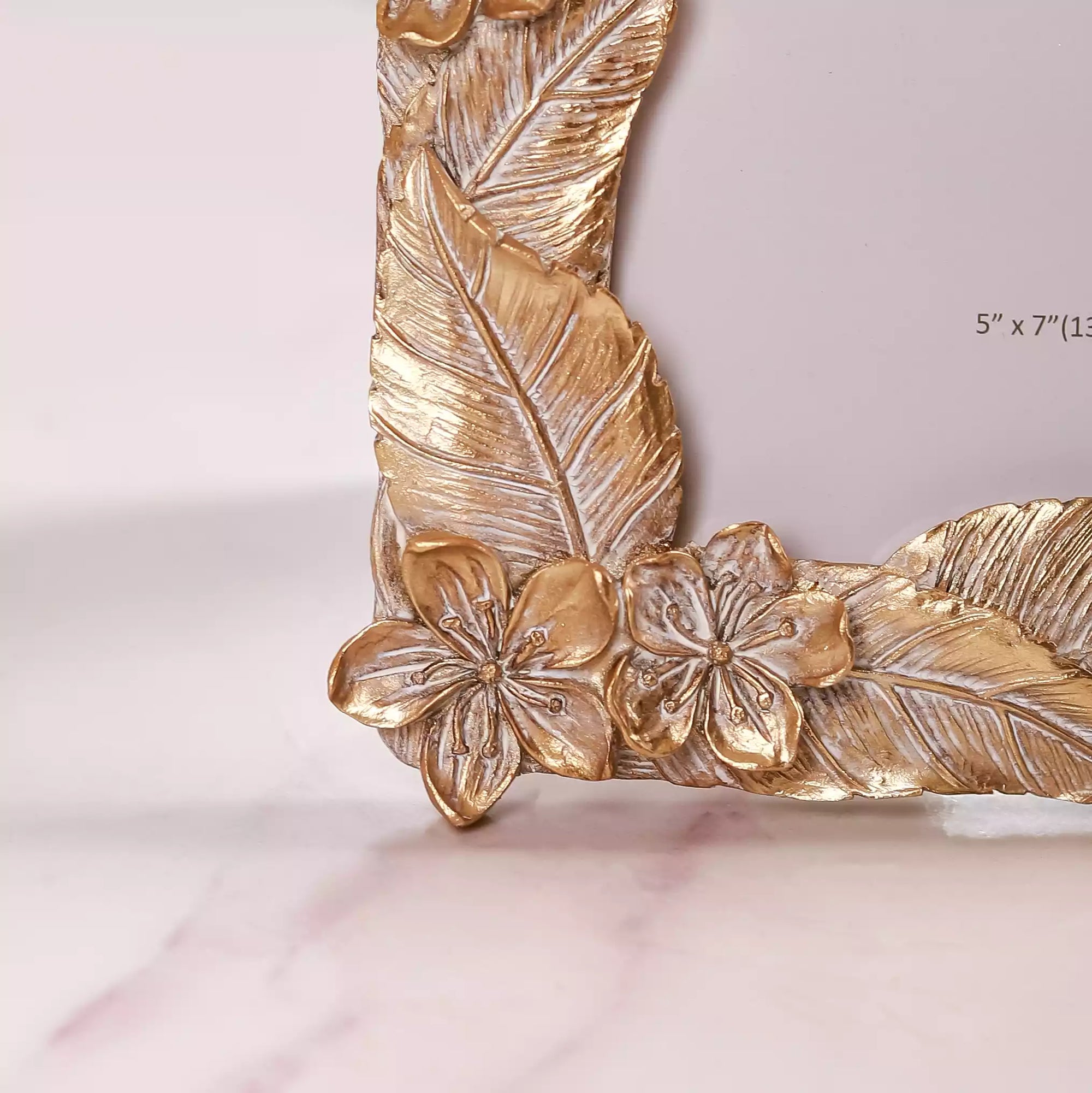Transform your cherished memories into stunning works of art with our golden tropical photo frame, meticulously crafted from premium resin. Delicate embossed flowers and leaves showcase intricate artistry, elevating your photographs to new heights of sophistication. This frame seamlessly blends timeless design with intricate craftsmanship, making it a captivating addition to your decor. Whether displayed on a mantelpiece, bedside table, or gallery wall, it promises to become a cherished home decor accent, enveloping your space with warmth, beauty, and a touch of tropical luxury.