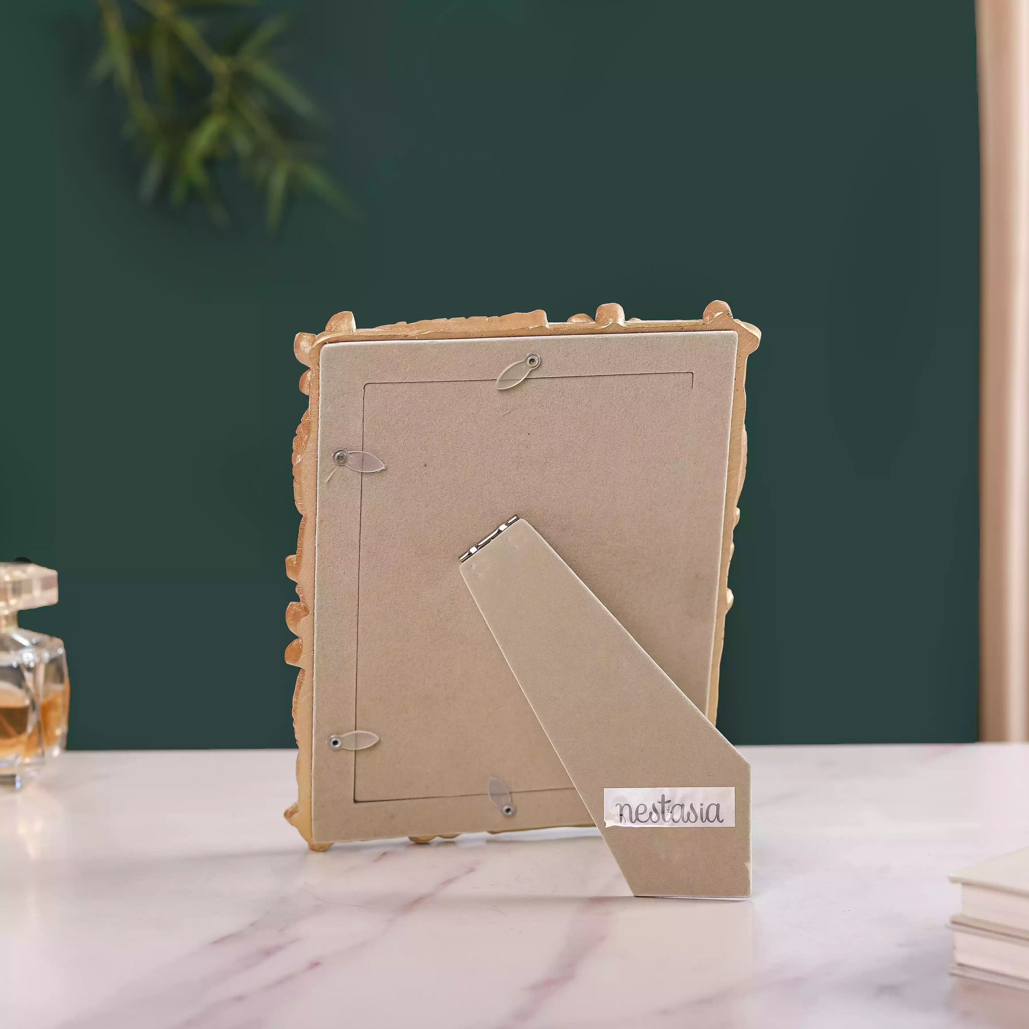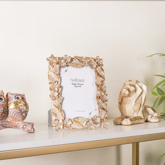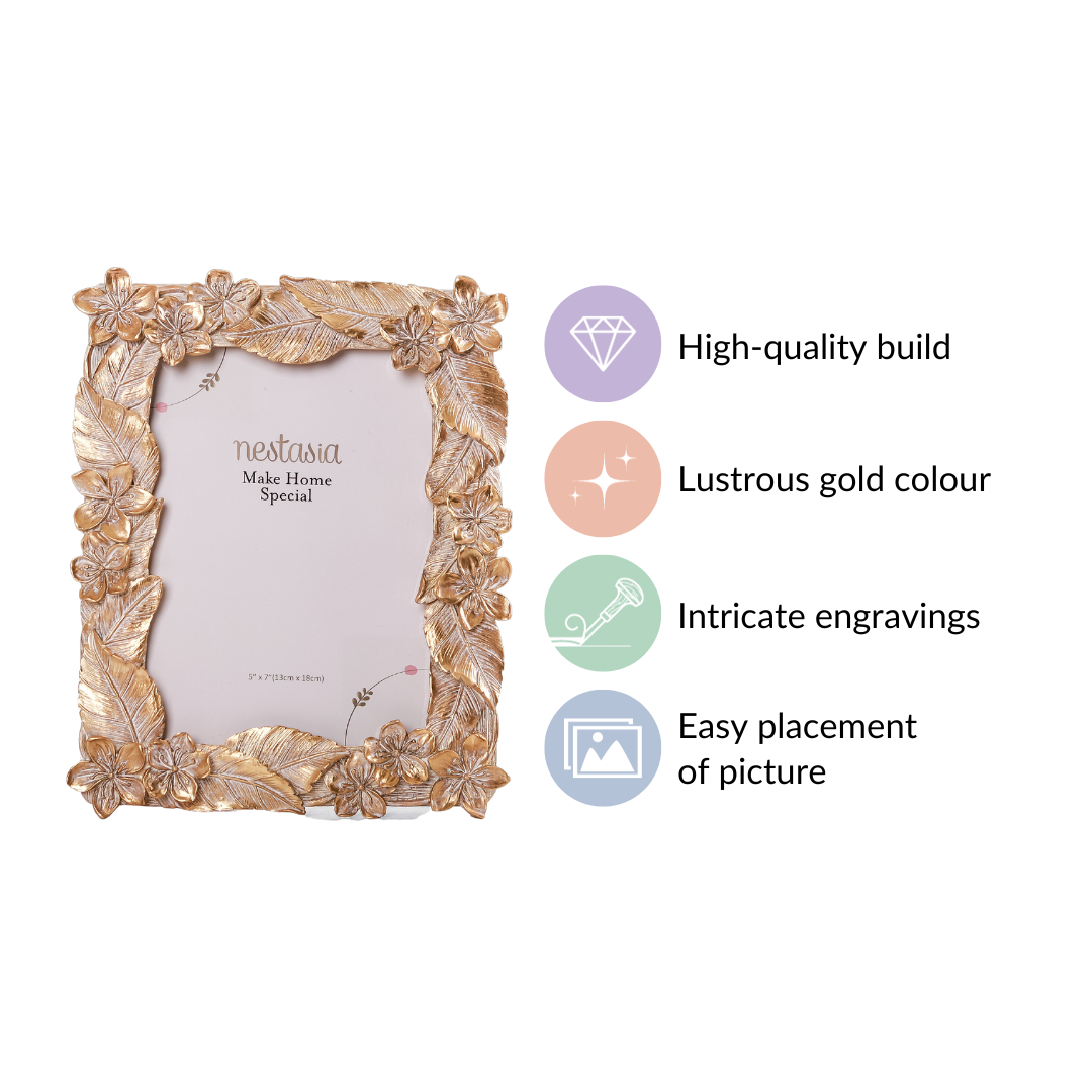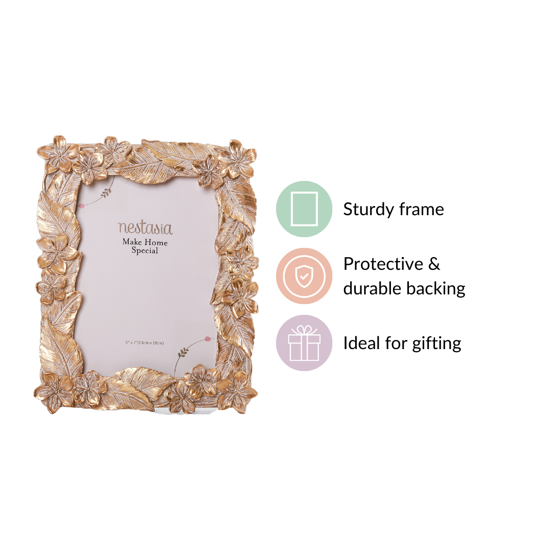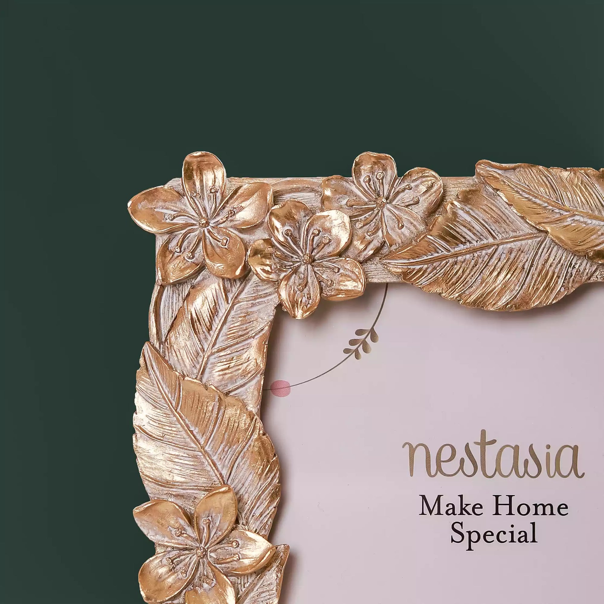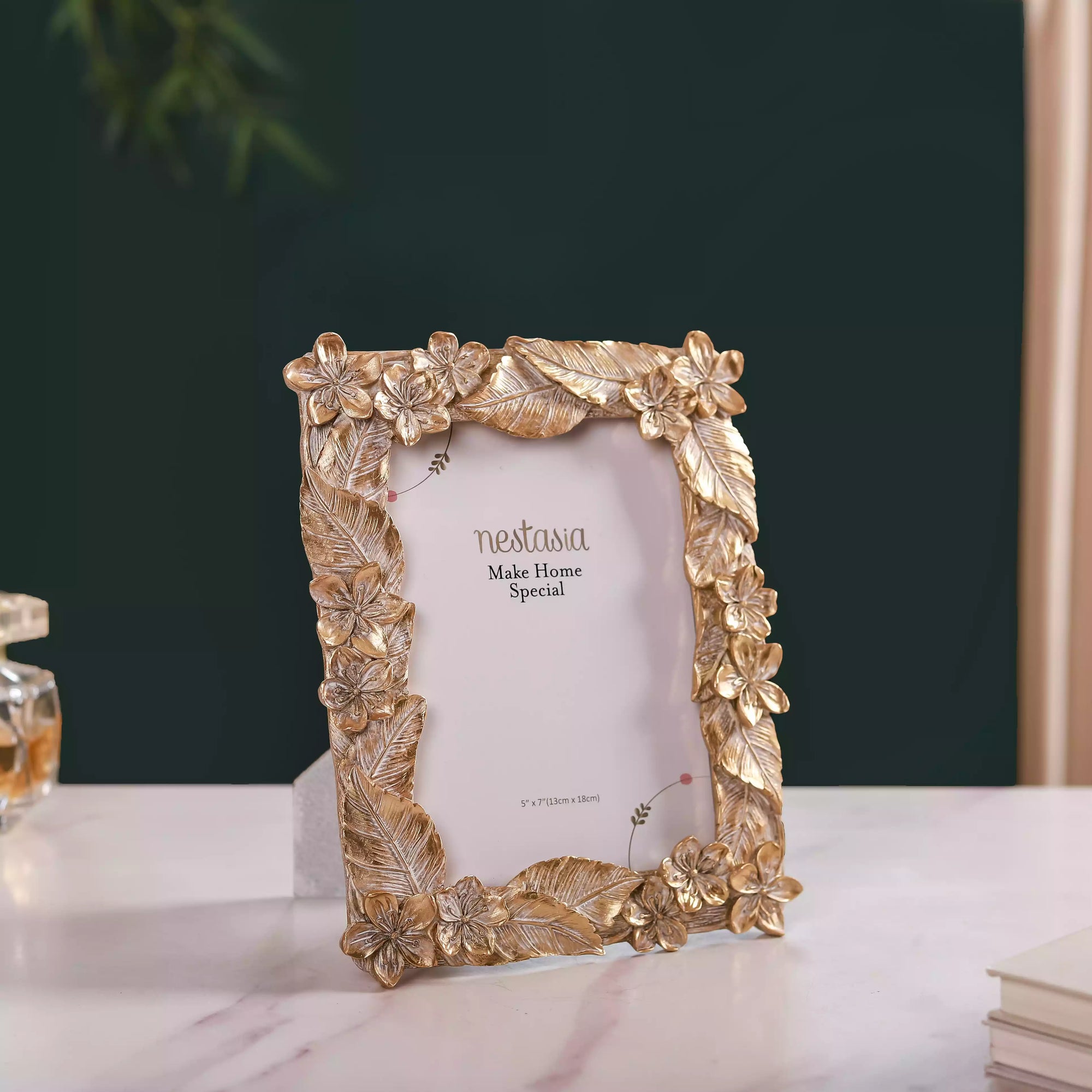 Transform your cherished memories into stunning works of art with our golden tropical photo frame, meticulously crafted from premium resin. Delicate embossed flowers and leaves showcase intricate artistry, elevating your photographs to new heights of sophistication. This frame seamlessly blends timeless design with intricate craftsmanship, making it a captivating addition to your decor. Whether displayed on a mantelpiece, bedside table, or gallery wall, it promises to become a cherished home decor accent, enveloping your space with warmth, beauty, and a touch of tropical luxury.