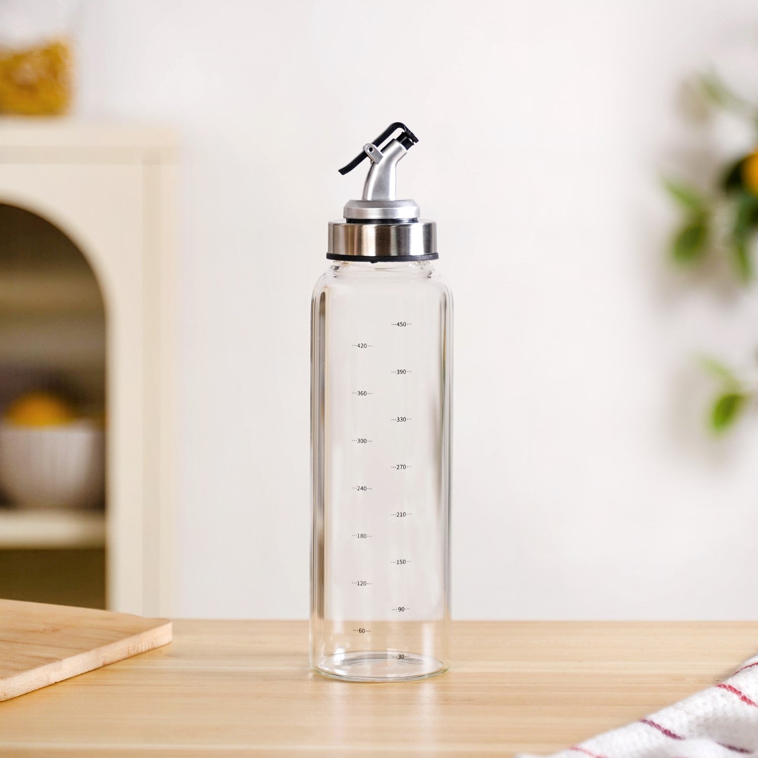Design: Give your minimalist kitchen an upgrade with this borosilicate glass oil dispenser set. Its clear, cylindrical body boasts a smooth, glossy finish, complete with precise black measurement markings for easy, accurate use. A polished, airtight stainless steel cap with an extra gasket adds a modern edge, while the ergonomic stainless steel spout features a slim, smartly designed nozzle for controlled pouring. The nozzle is paired with an attached stopper, blending functionality with contemporary elegance in one stylish kitchen essential.