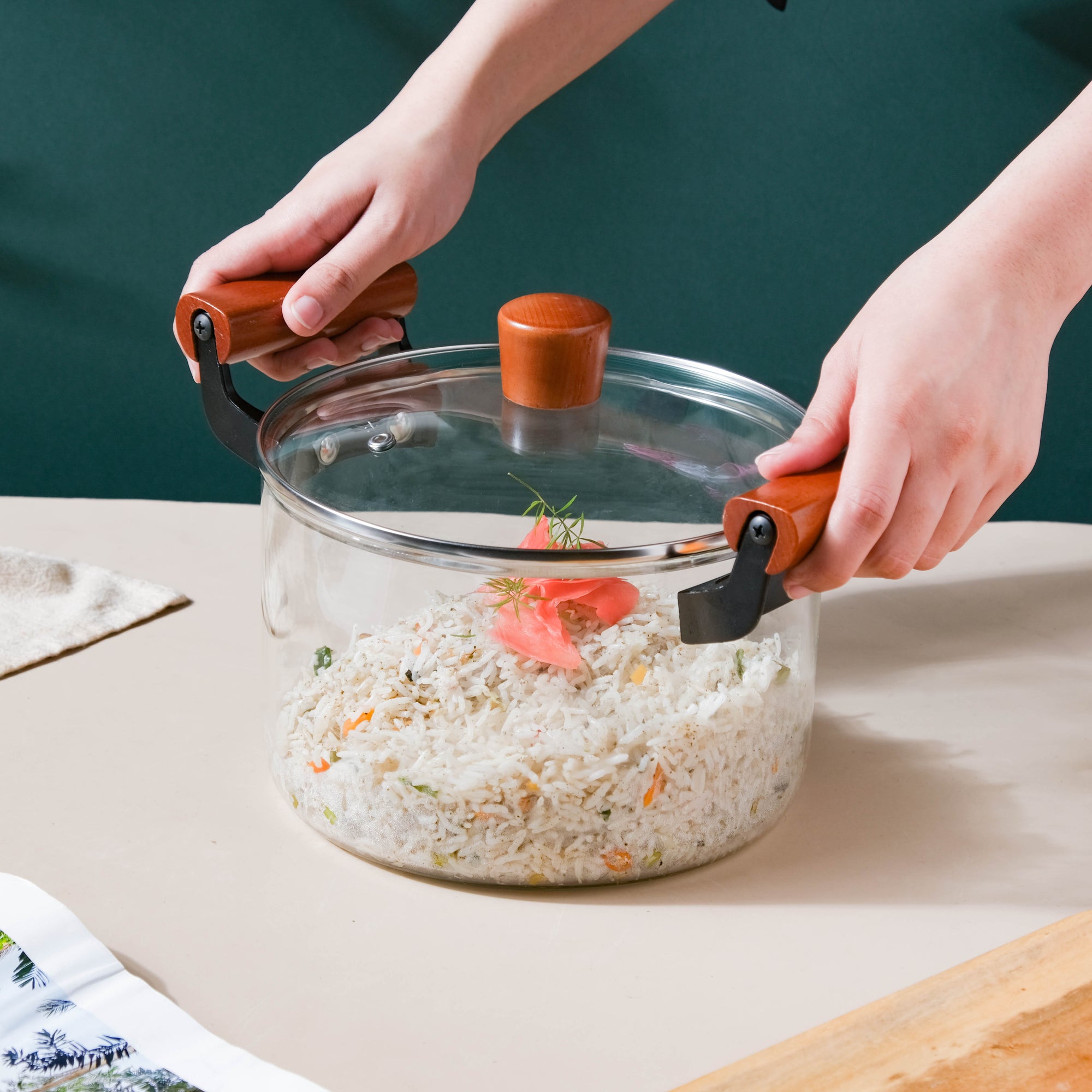 Cook and serve food easily and in a hassle-free way with the glass cooking pot. The clear glass body of the utensil enables one to keep an eye on the components. The pot has wooden handles on either side, to provide ease of carrying. The pot also features a glass lid with a wooden handle and a small outlet, so that the steam gets out.
