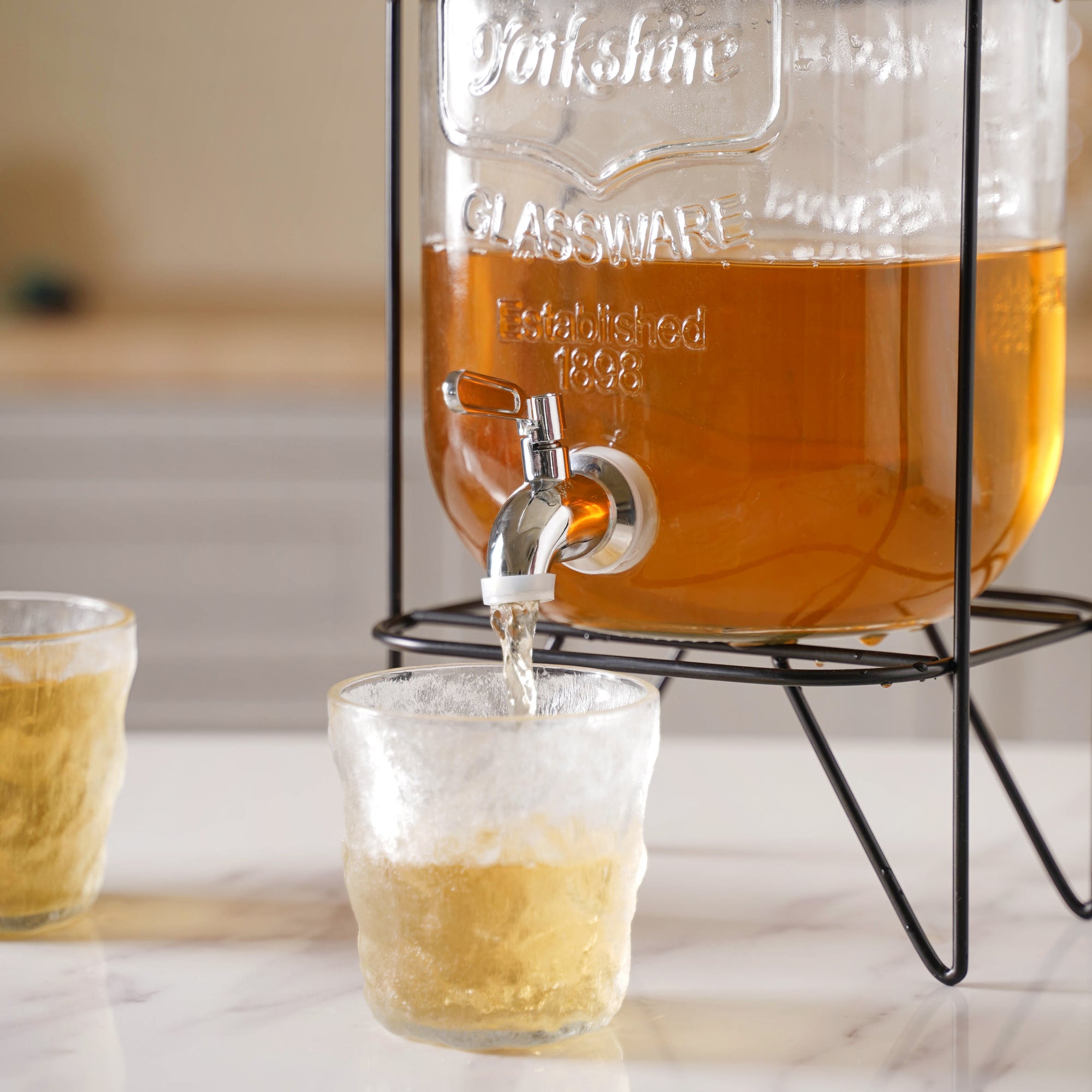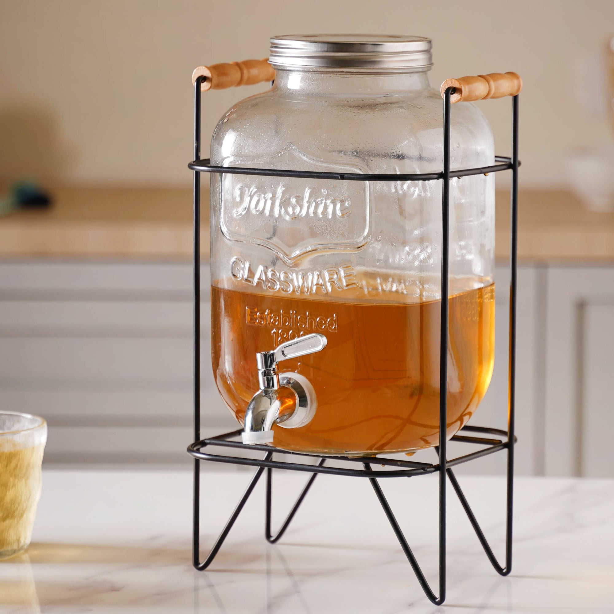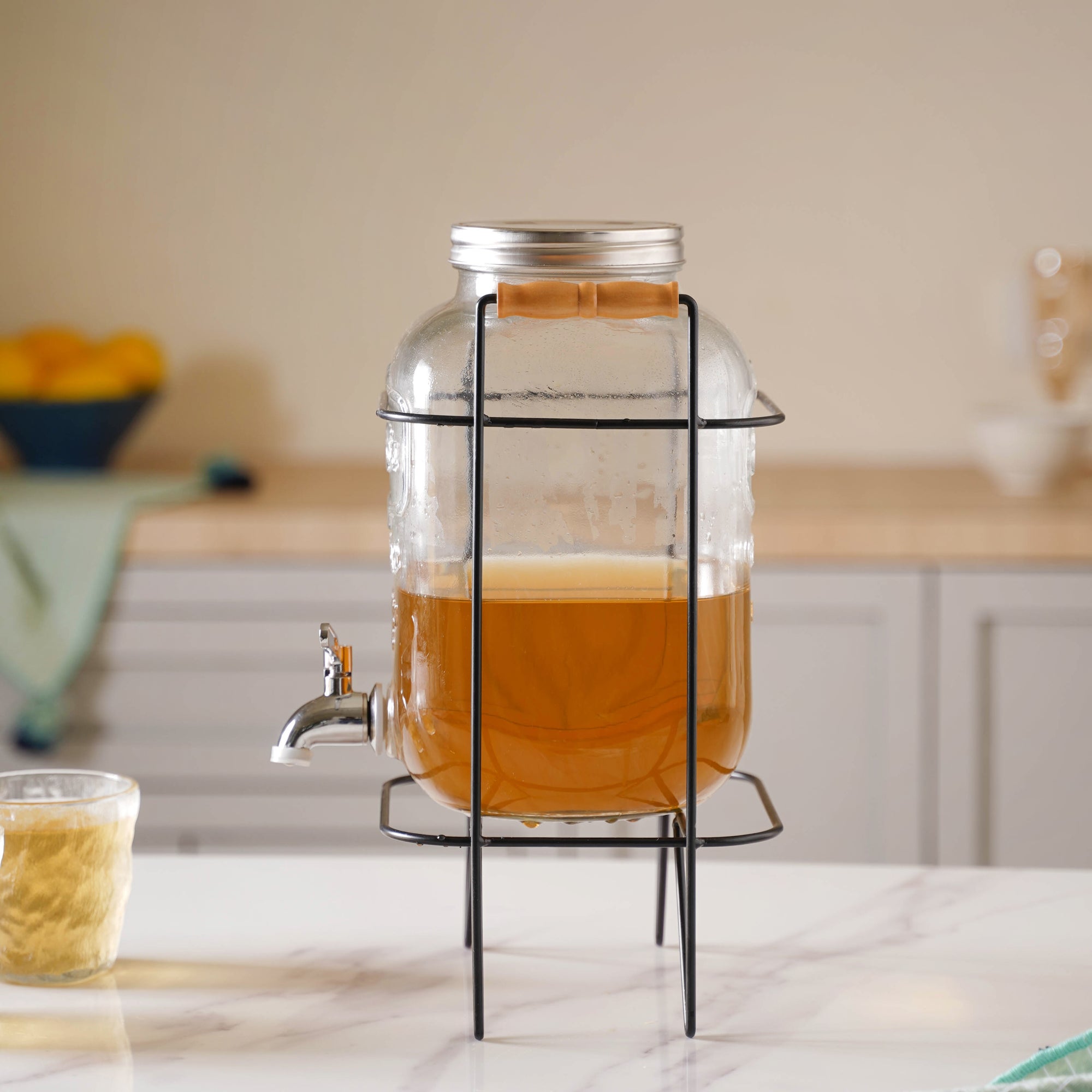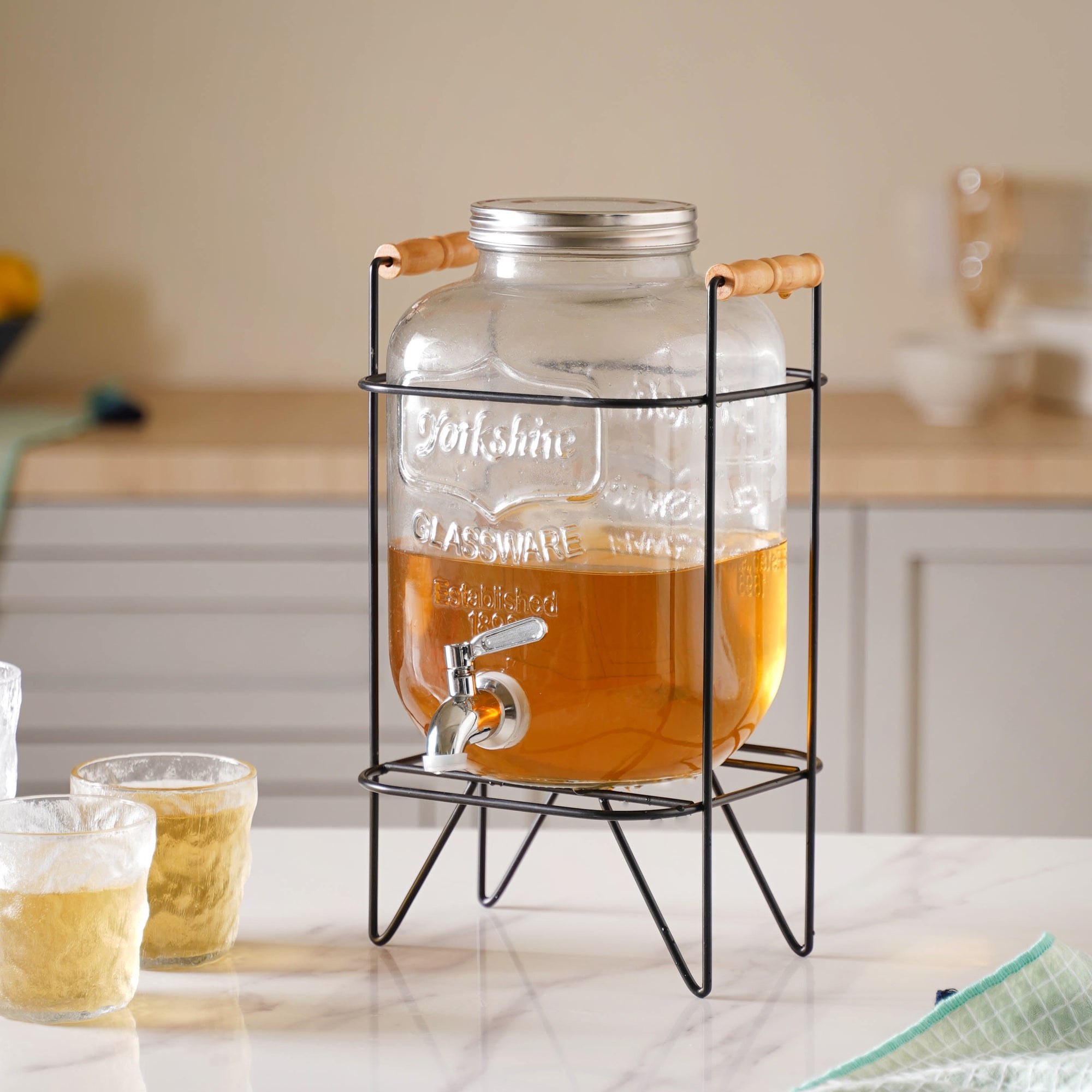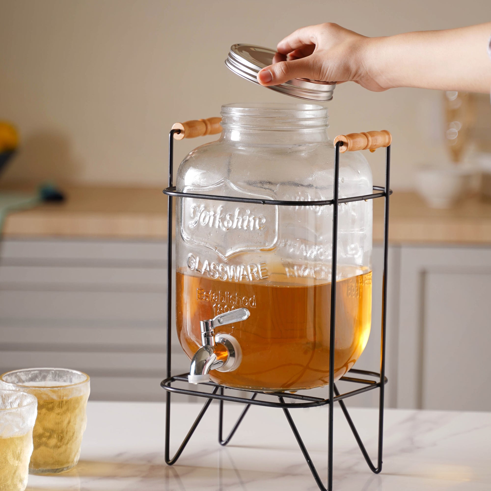 Shaped like a jar, the glass beverage carrier comes with an adjustable faucet. The beverage dispenser graces a design that promotes ease of use in everyday modern life. The glass barrel comes with a wide mouth and a fitting metallic rim. This enables one to fill it with fruits of any kind or size and pieces of ice conveniently. Moreover, the cleaning process of the barrel becomes easier. The faucet is made of stainless steel, which stabilizes the flow of water to a steady stream. The glass beverage carrier is also provided with a metal rack with two wooden handles at its uppermost ends which makes it easier to carry around. With perfectly transparent walls, one can use it to keep an assortment of colorful fruit juice, lemonade, infused water and even wine and use it as a beverage dispenser at parties, cookouts, and buffets. The engravings on the outer surface make it an excellent addition to the house.
