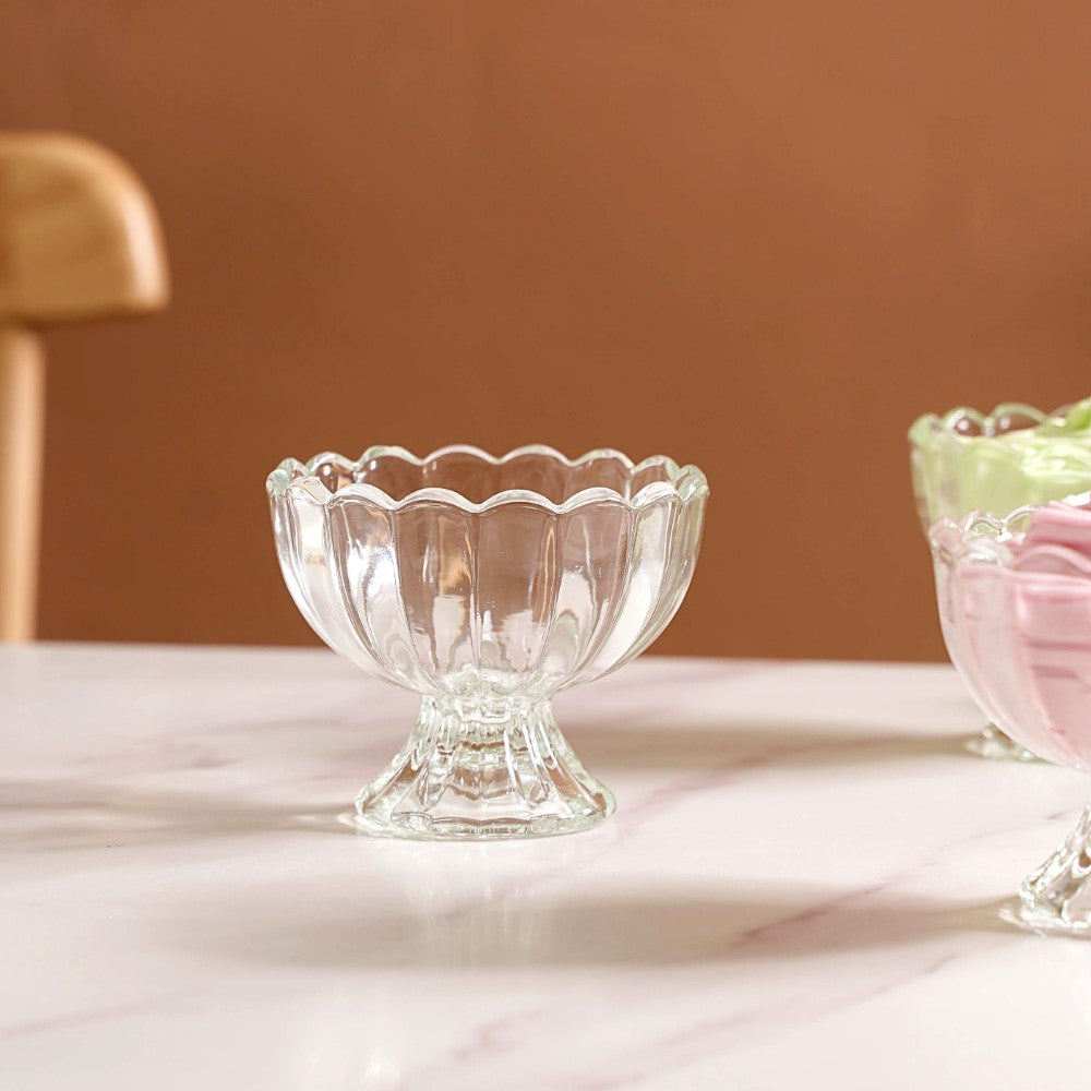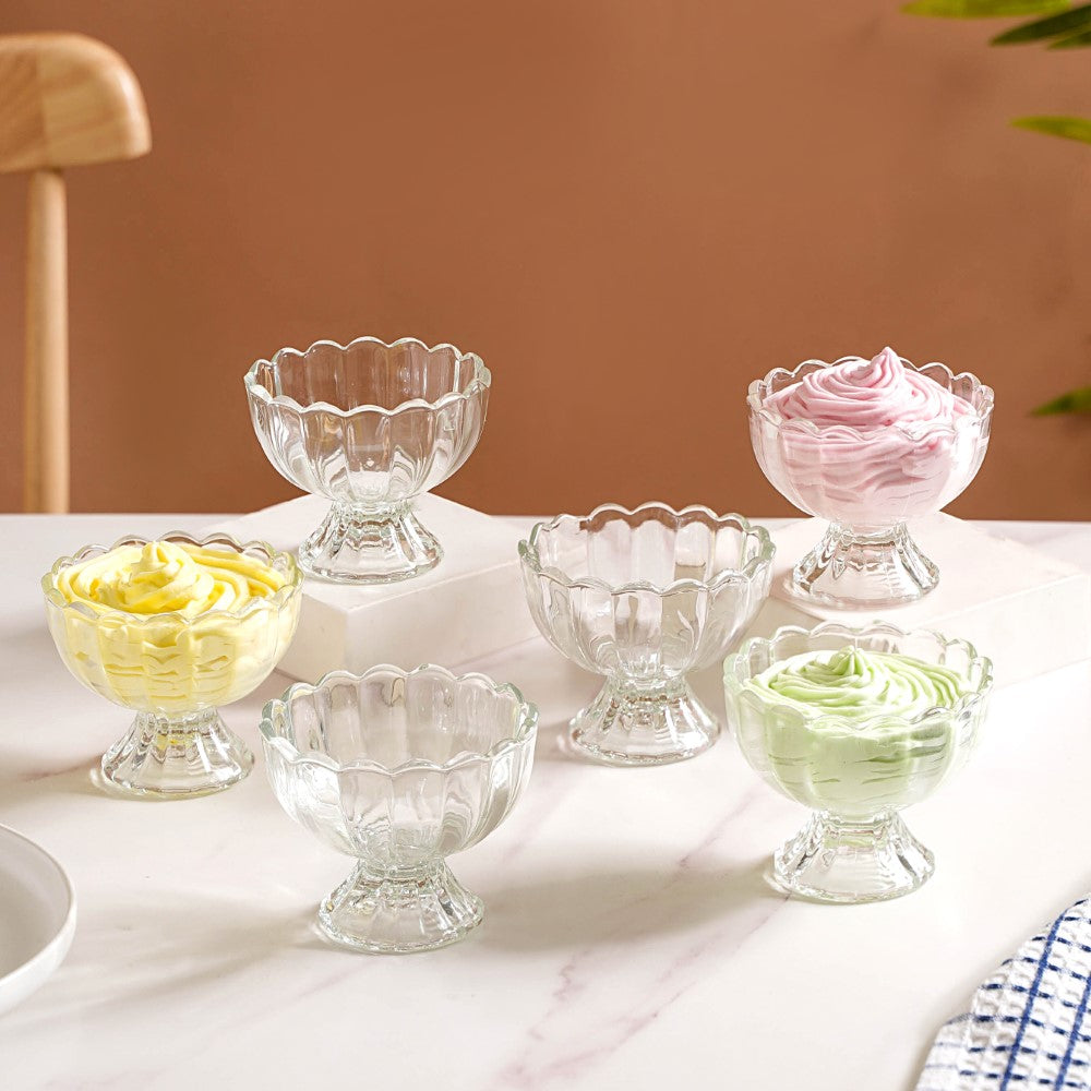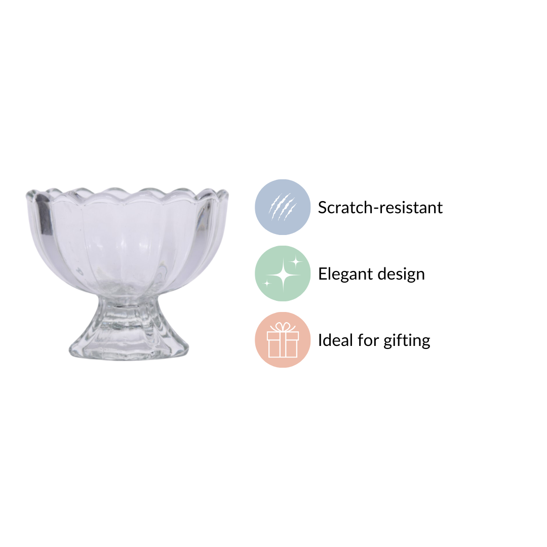 Indulge in dessert perfection with our set of 6 stemmed glass ice cream bowls. Crafted with precision and artistry, these exquisite bowls elevate your ice cream experience. Their captivating textured surface adds elegance and enhances your sensory delight with every bite. The sturdy stems provide a stylish foundation and a comfortable grip. Perfect for ice cream, sorbet, or sundaes, these bowls offer both a pleasure and a visual delight, making dessert moments truly special.