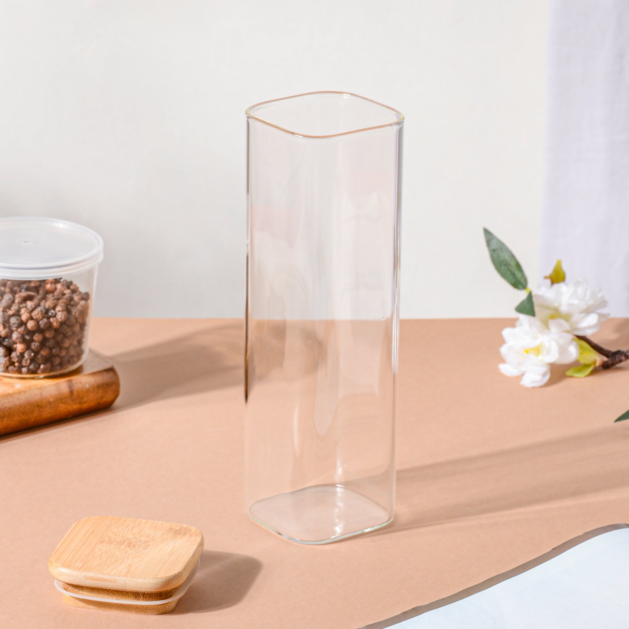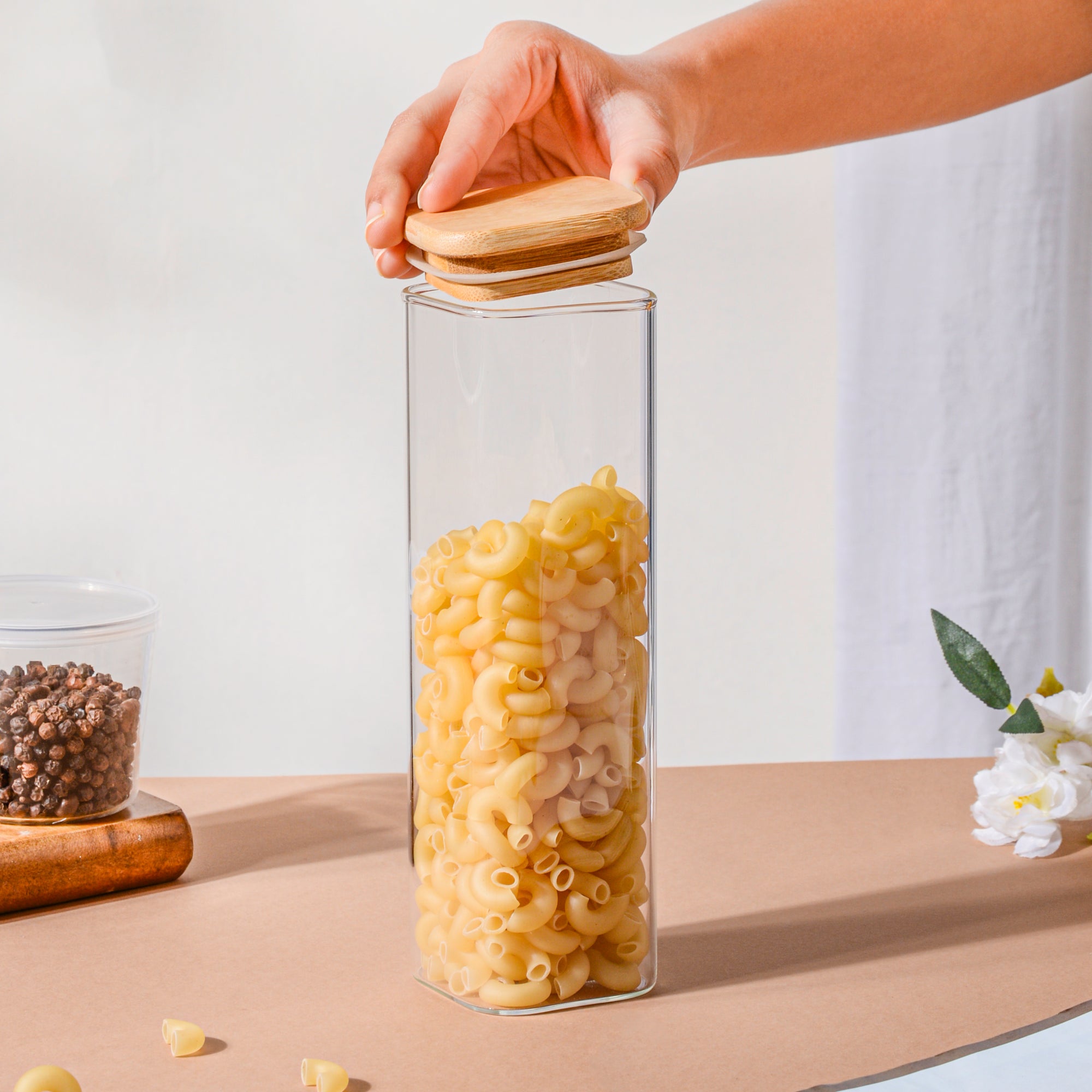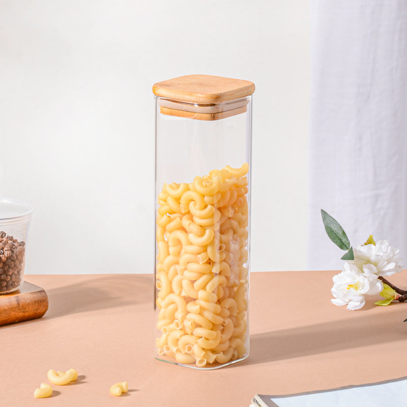 The glass jar is simple to clean and can be reused multiple times. Glass does not discolour, retain odours, or leach chemicals into food in the same way that plastic does. Because the glass container is transparent, one never has to guess what has been stored inside it. The jar has an airtight wooden lid which keeps the spices and condiments in it dry and fresh. The glass jar can be placed in the microwave without the lid.
