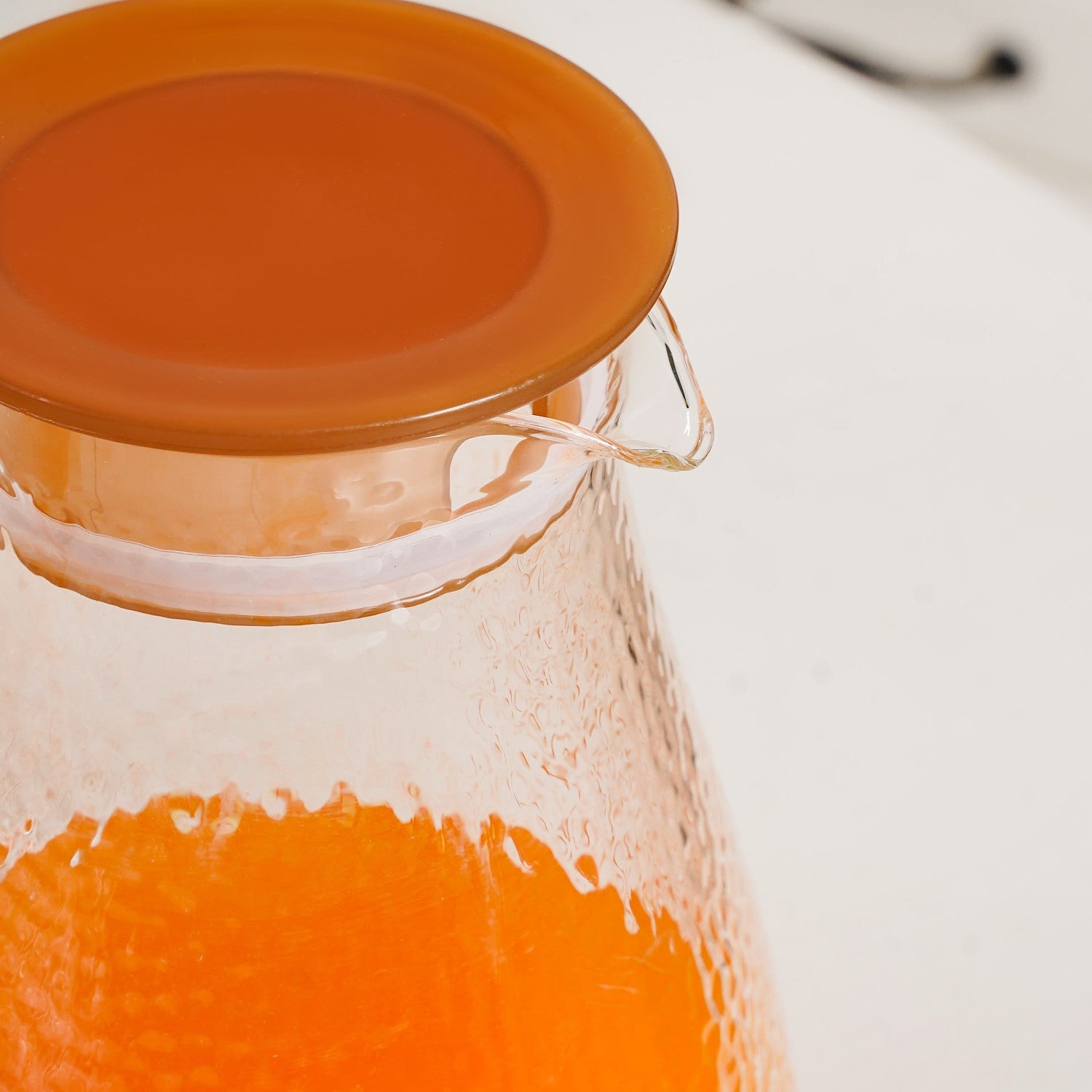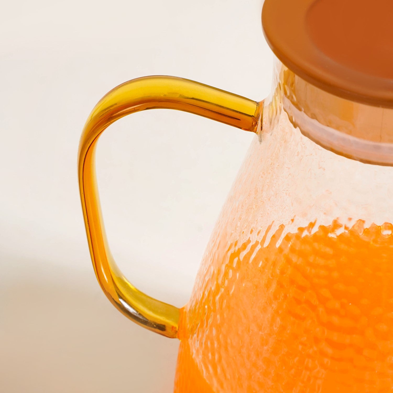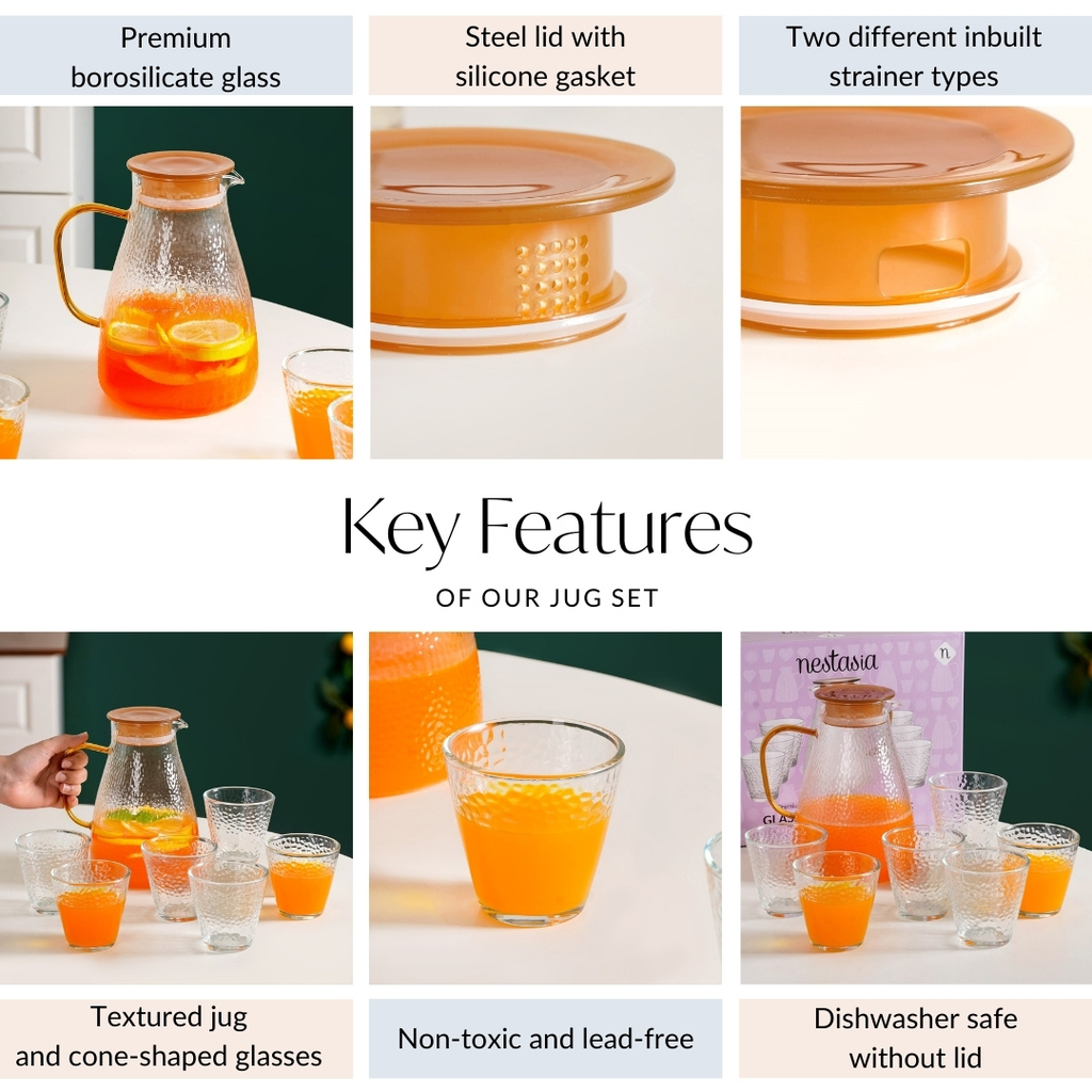 Design: Crafted from premium borosilicate glass, this set includes one jug and six uniquely designed drinking glasses. The jug features a hammered design and a sleek shape that gently tapers toward the top. It is topped with an amber lid that includes a built-in strainer and is secured with a silicone gasket for a tight seal. The rounded, spacious handle ensures a comfortable grip while pouring. Each of the six glasses showcases a hammered texture and a distinctive cone-like shape, narrow at the base and wide at the top, offering both style and easy handling.
