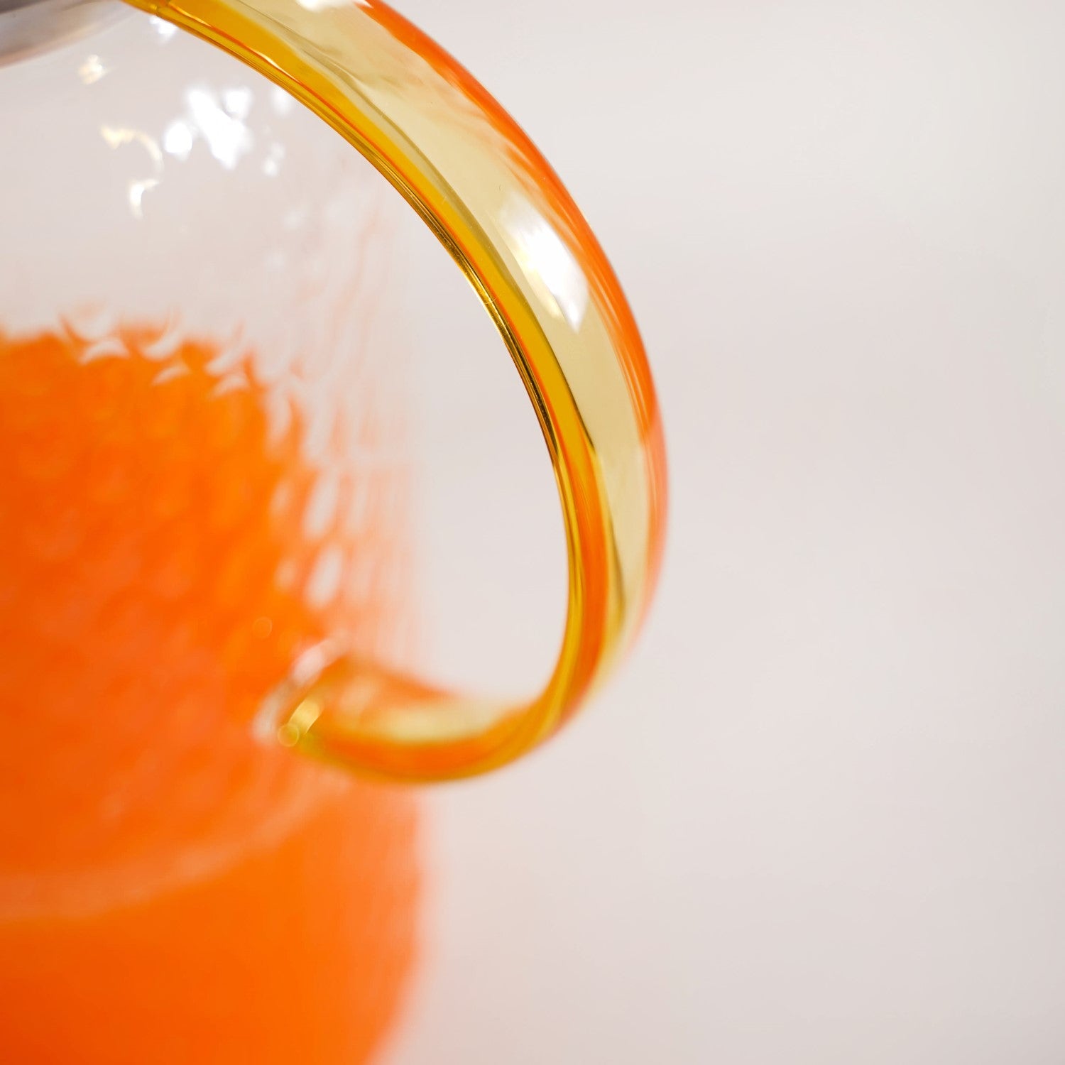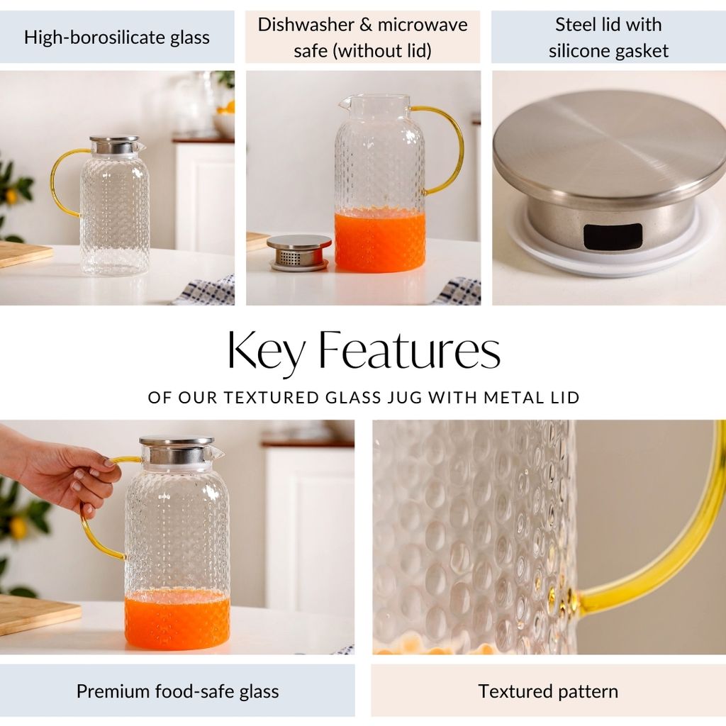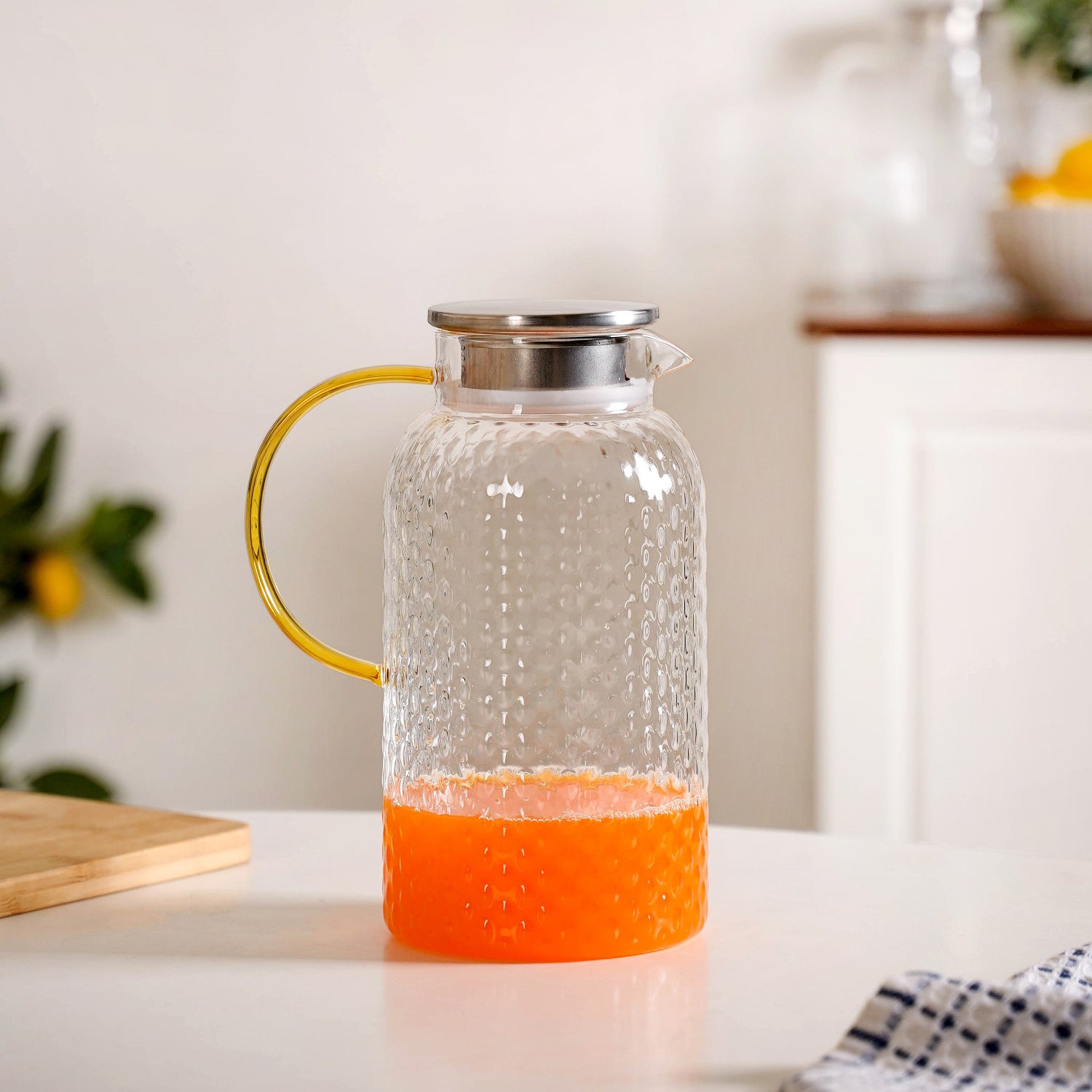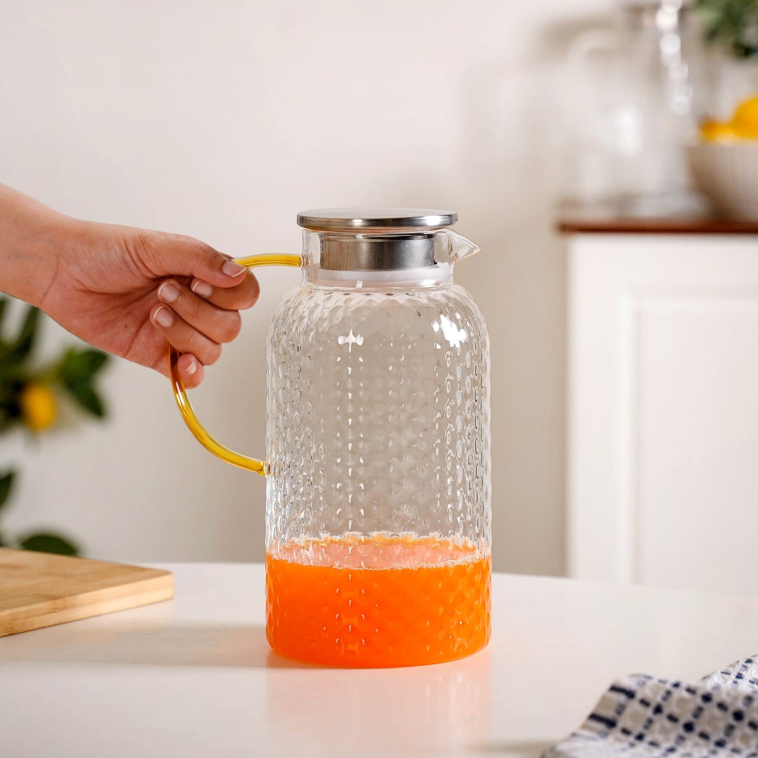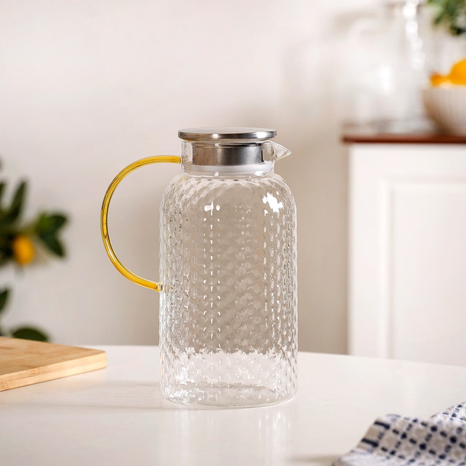 Design: Made from premium borosilicate glass, this tall jug showcases an elegant abstract pattern with delicate oval textures for added style. Its vibrant yellow-tinted handle adds a modern touch and makes it perfect for any setting. A sleek steel lid with a snug silicone band ensures a secure seal. The lid has an integrated strainer and offers two openings, one with fine holes and the other with a wide spout.