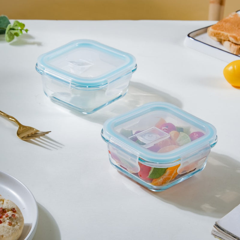 The set of 2 high-quality food containers has been made of borosilicate glass and keeps the components secure for subsequent use. The leak-proof and air-tight glass lunch boxes are the perfect kitchen and food storage essentials. The glass containers are made of borosilicate glass and have a PVC clip-lock lid to increase their durability and sturdiness. These glass tiffin containers can be conveniently used for kitchen and food storage. Whether you need to use the glass storage containers as kitchen organisers, fridge/freezer storage containers, or even to reheat and serve food items, they are perfect for the job. Features: - Clip lock lid - Unbreakable PVC lid - BPA-free lid - Airtight lid with silicone gasket- Steam release opening- Leak-proof container - Food-grade glass - Crack-resistant glass - Microwave-safe - Easy to clean Nestip: As the containers are leak-proof, they can be used for carrying soups or curries while travelling. Size: 12.5cm L x 6cm H Capacity: 250ml Colour: Transparent, mint green Material: Glass, PVC Products included: 1 set of 2 glass food containers with PVC lids Style: RHG122G39