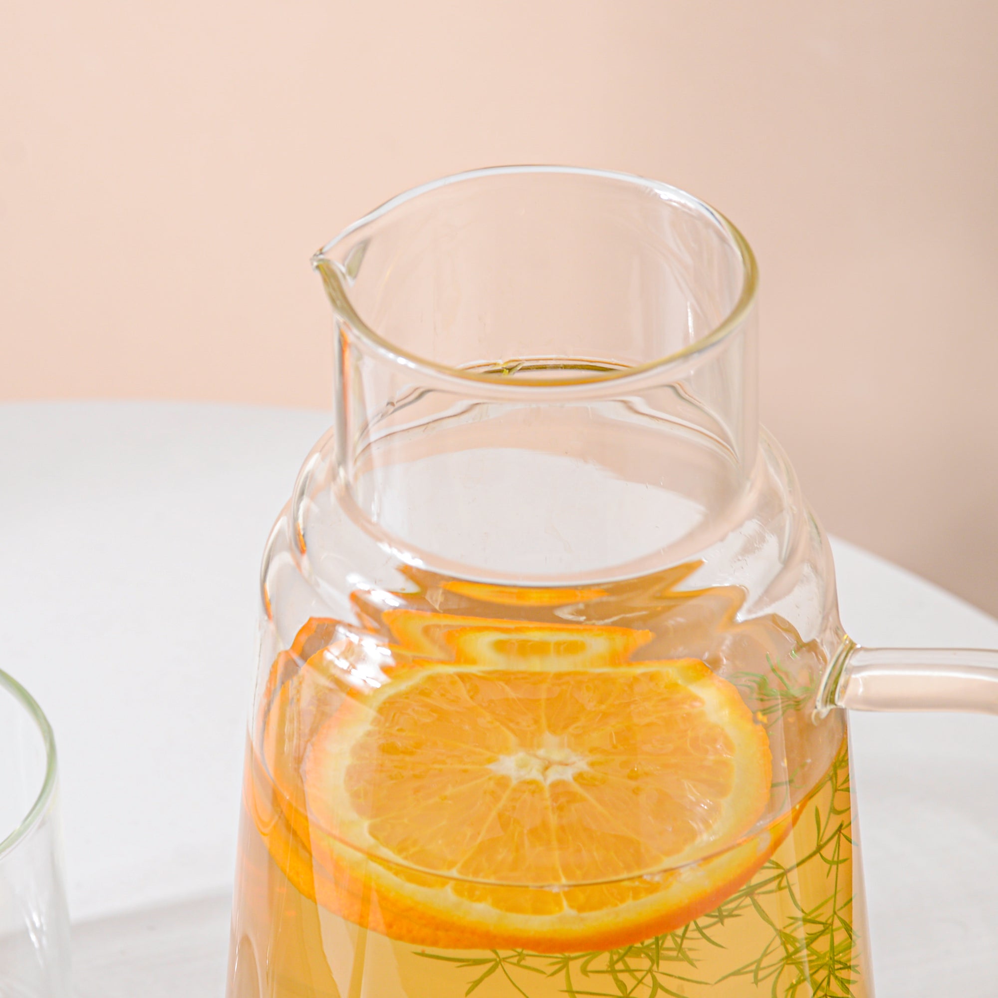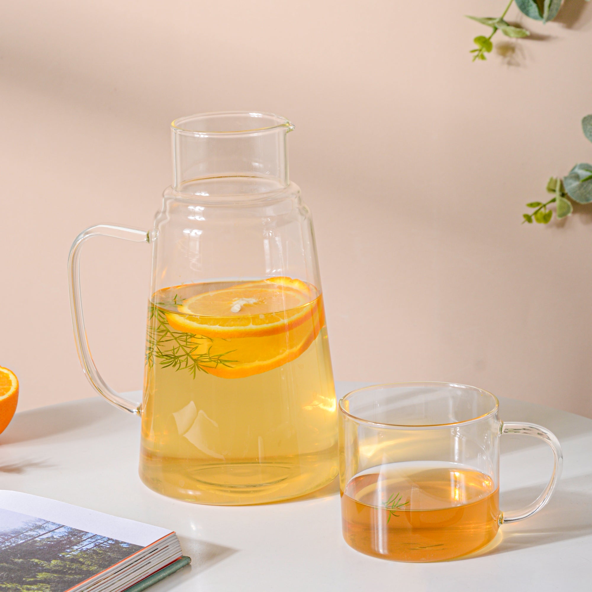 A glass jug to store deliciously concocted beverages and an elegant cup to pour it in. The transparent glass jug has an elegant structure and highlights the vibrant beverages in it. The glass cup has a broad robust structure which makes it ideal for daily usage, whether it be for drinking morning tea or hydrating oneself with some fresh lemonade.