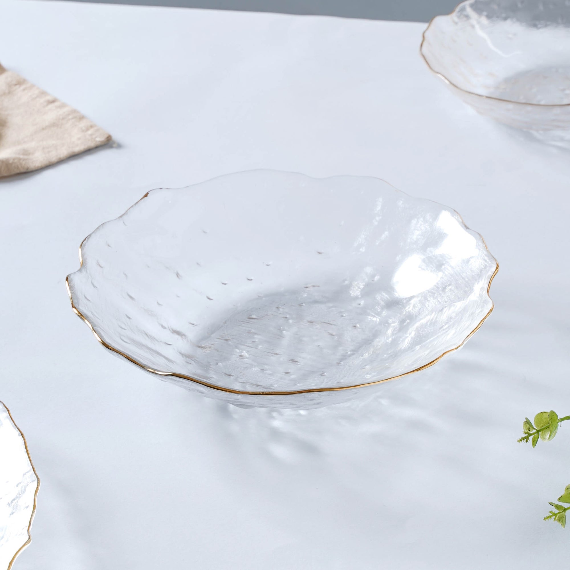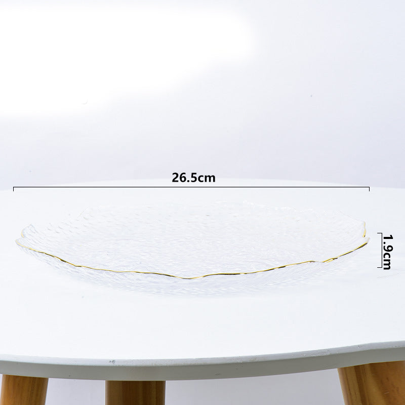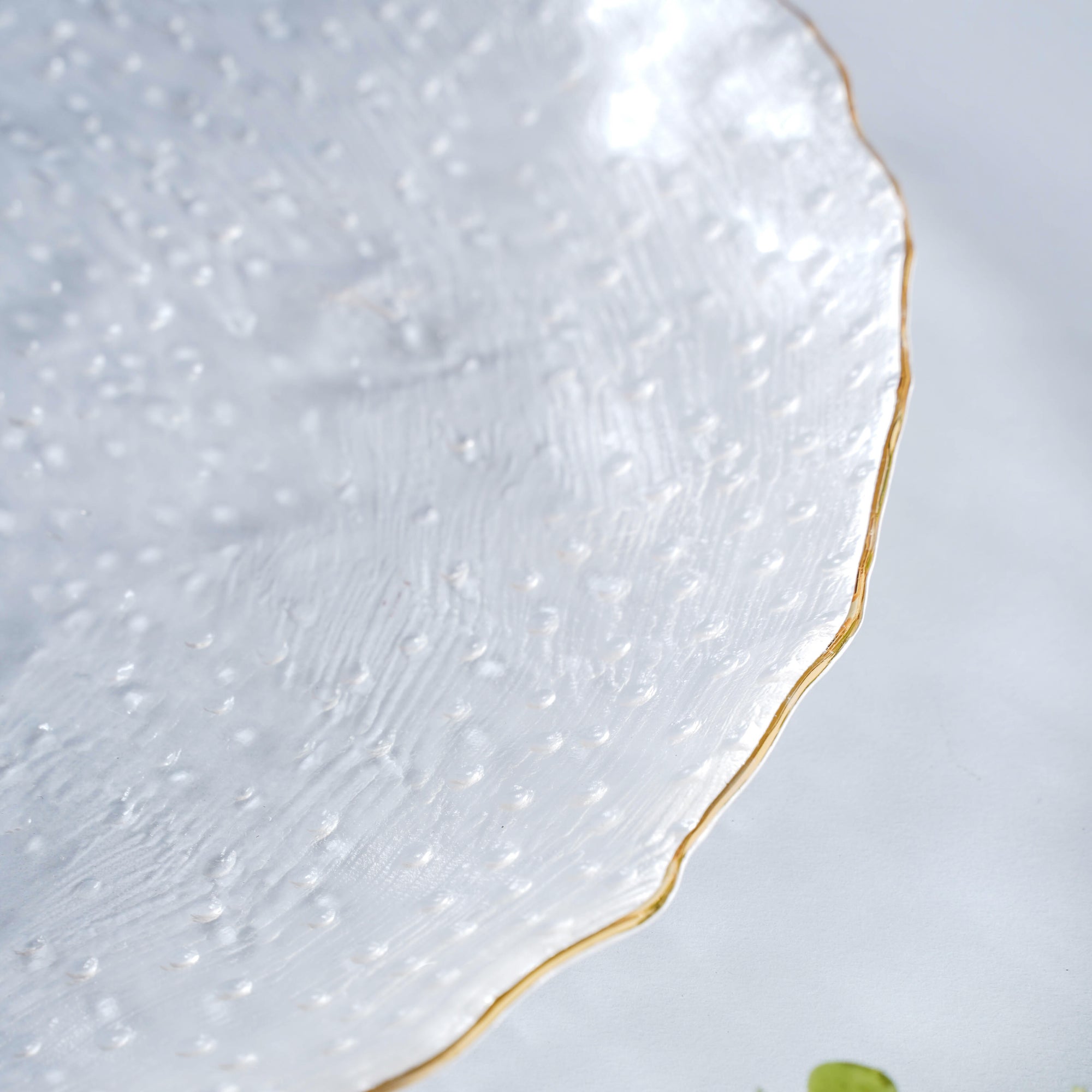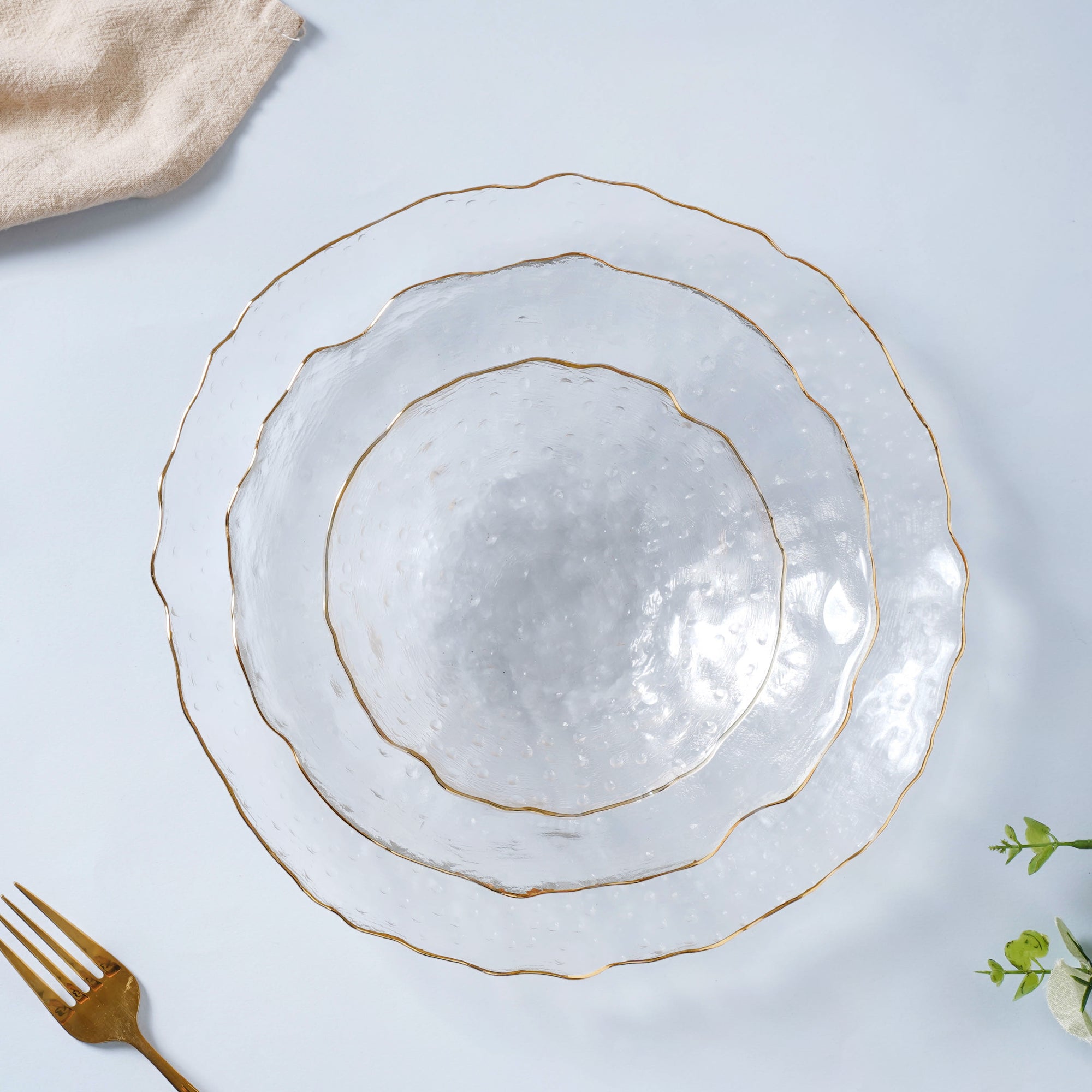 The 3 piece glass plate set has an asymmetric rim that features a lustrous gold coating. With an interplay of textures with a gorgeous transparent glaze, the plates will amp up the table setting. The largest plate may be used to present the main course, the medium plate is ideal for a snack-time fest while the small plate may be used to present desserts such as pastries and ice cream.