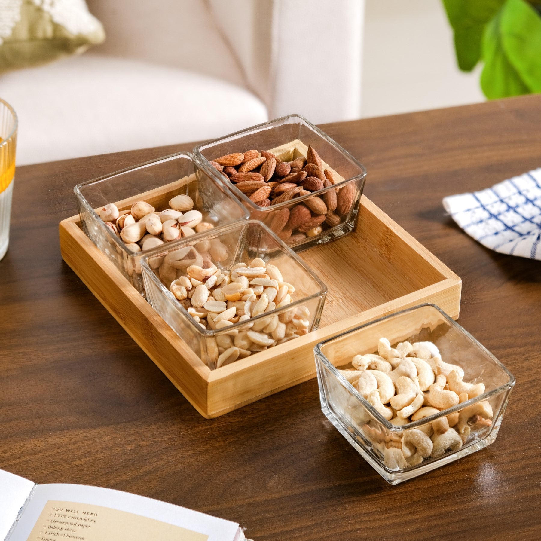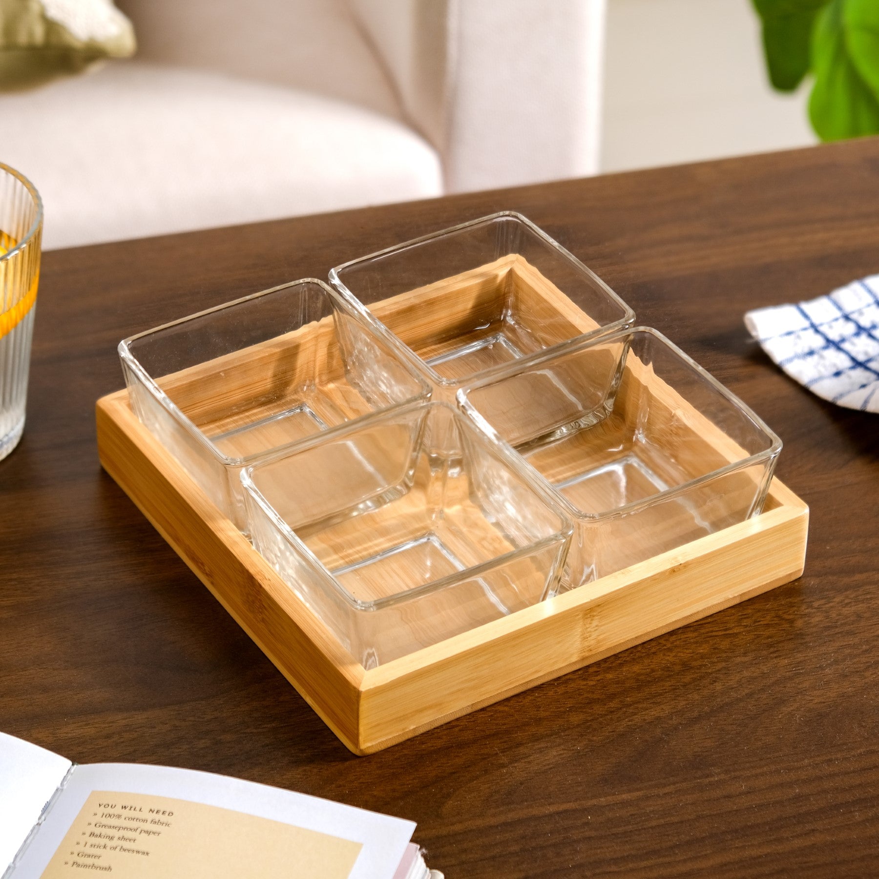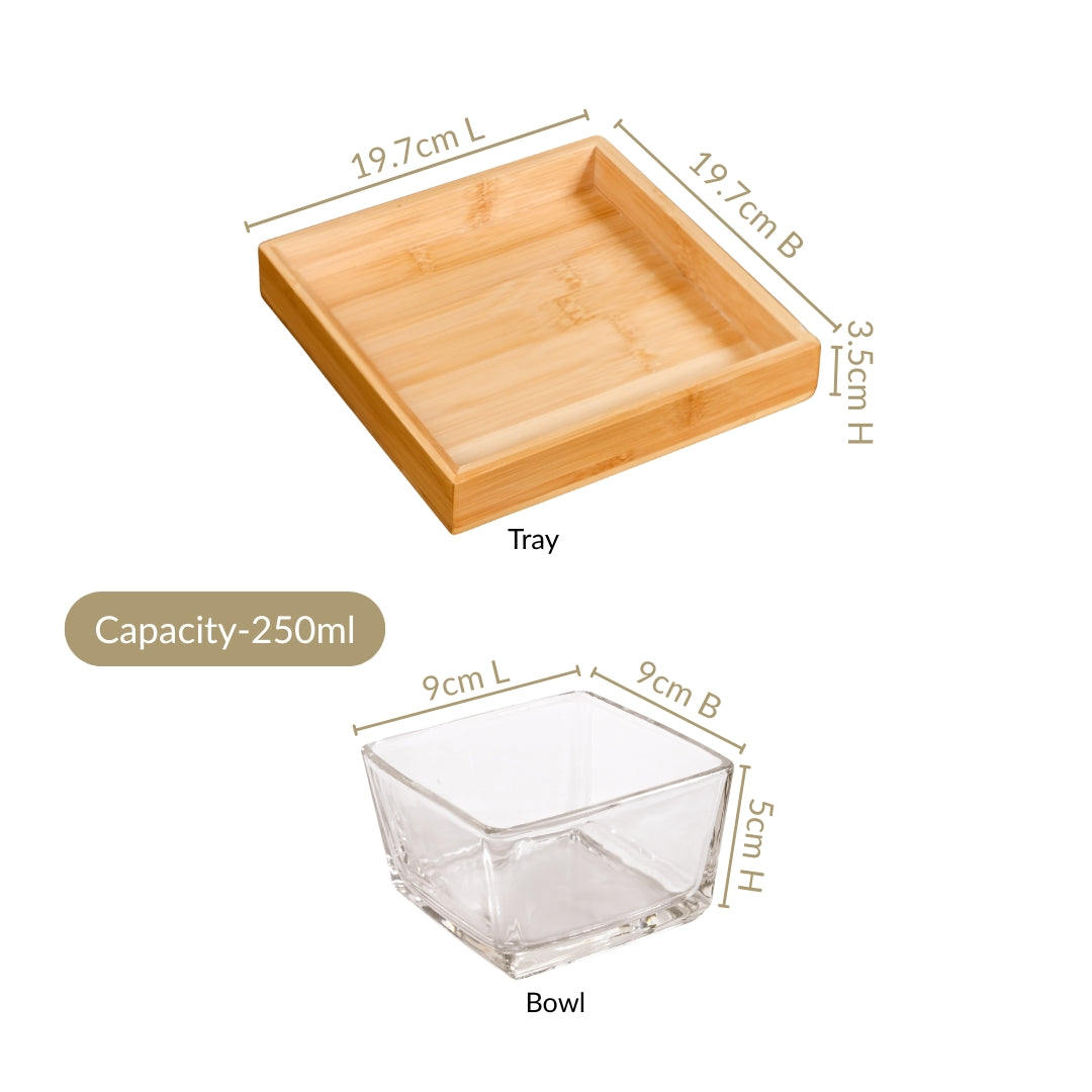 Design: Serve in style with this elegant wooden tray set, featuring four clear glass bowls that is perfectly arranged in a compact 2x2 layout. Crafted from eco-friendly bamboo, the square tray showcases a warm, natural grain and smooth finish, adding charm to any table setting. Each glass bowl is made from thick, durable glass with a gently flared design, ideal for serving dips, nuts, condiments, or small treats and snacks. It is perfect for both everyday use and entertaining. This versatile set combines functionality with minimalist elegance, making it a beautiful addition to your kitchen or dining area. For long-lasting use, wipe with a damp cloth and let it air dry.