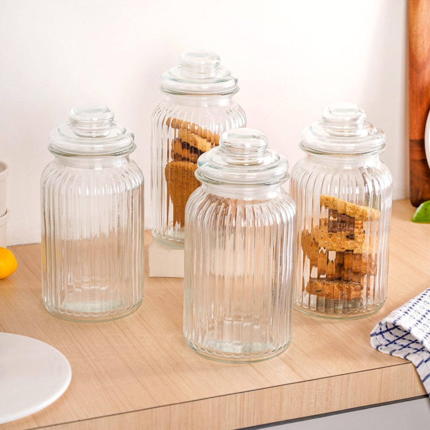 These airtight glass jars offer several advantages for food storage. First and foremost, they preserve the freshness of your dried fruits, snacks, and nuts by creating an airtight seal that prevents exposure to moisture and air. This helps maintain the crunchiness and flavour of your stored items for a longer time. The stylish glass airtight lid not only ensures a secure closure but also adds an elegant touch to your kitchen decor. The ribbed textured surface enhances the overall aesthetic, making it suitable for various kitchen settings. Their durability and transparency also make it easy to identify the contents and quantities, helping you stay organized and efficient in the kitchen.