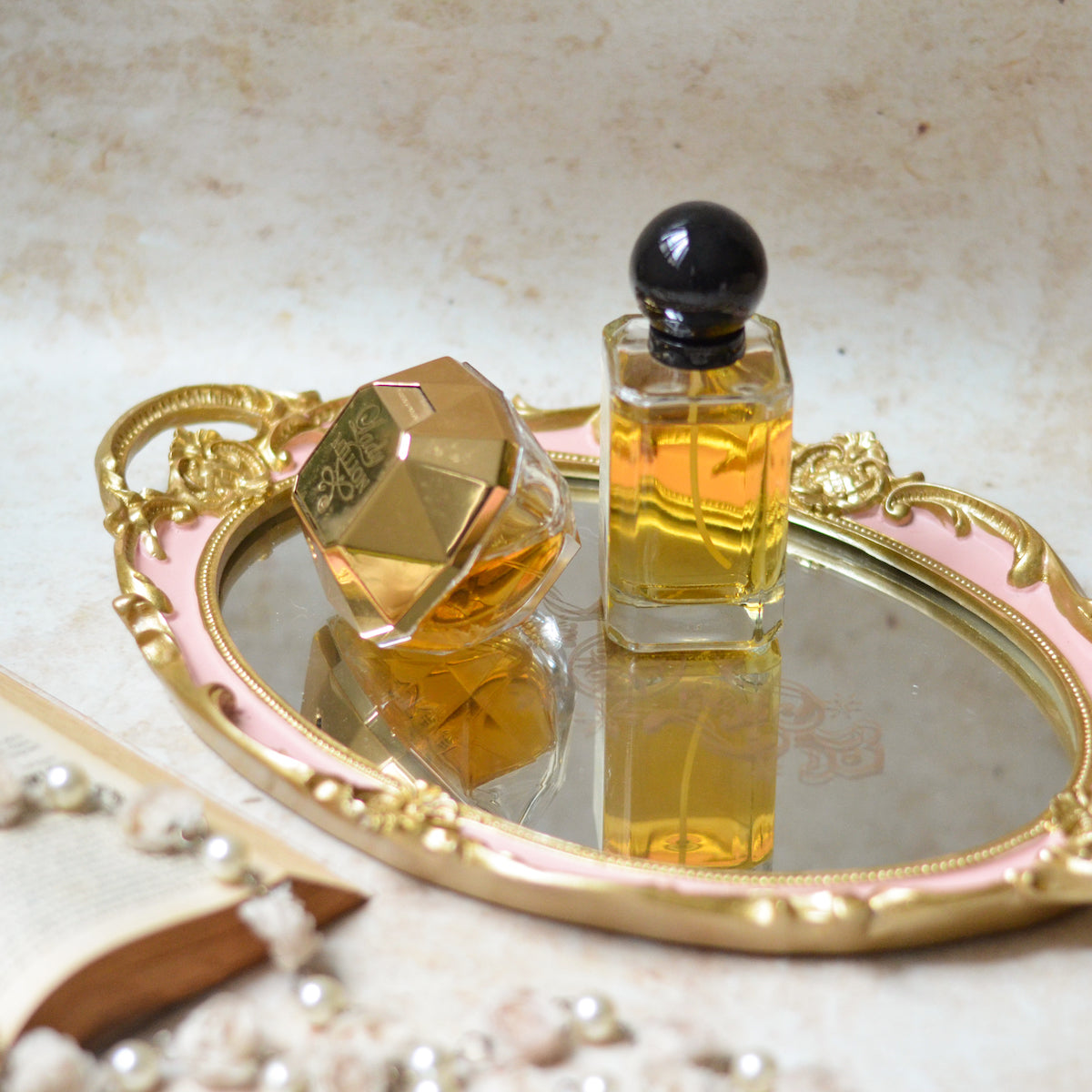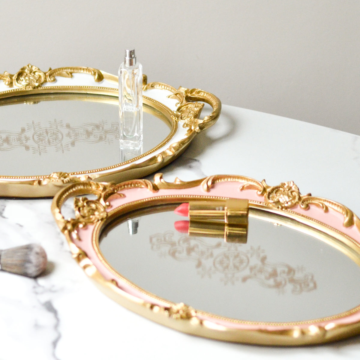 The elegant oval tray with gold rimmed edges and a mirrored base is an eye catching display item. It can be added to the vanity table to display jewellery and perfumes. The tray compliments a contemporary or vintage style home decor.