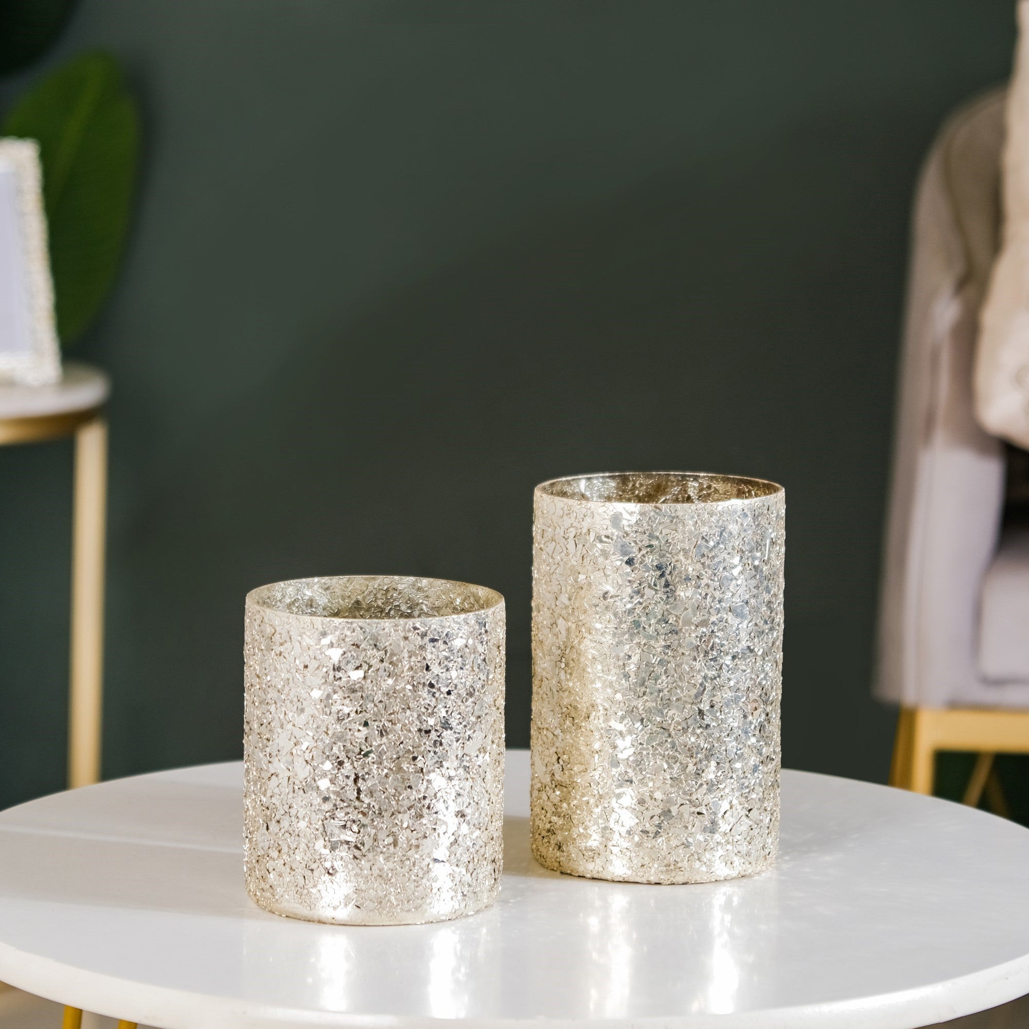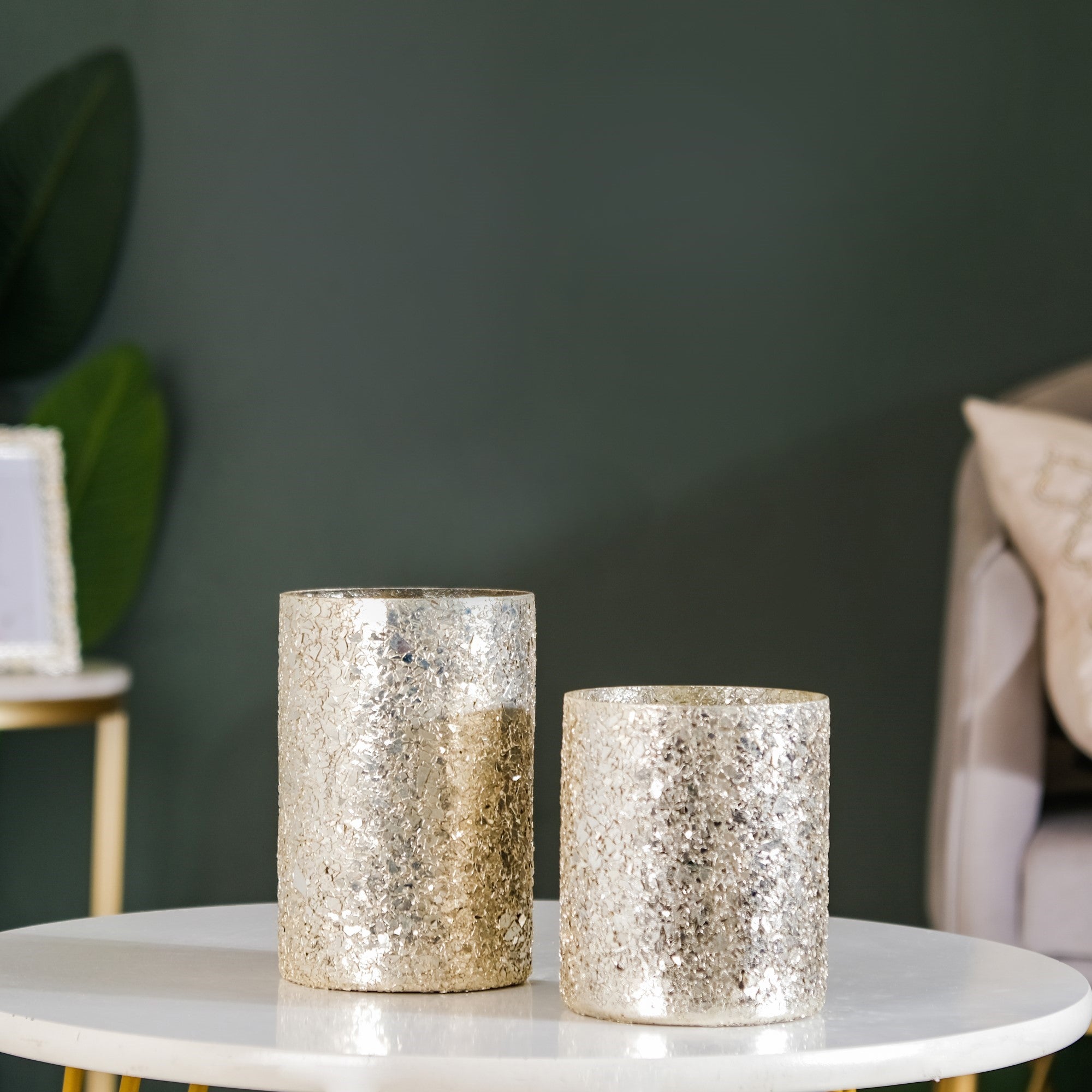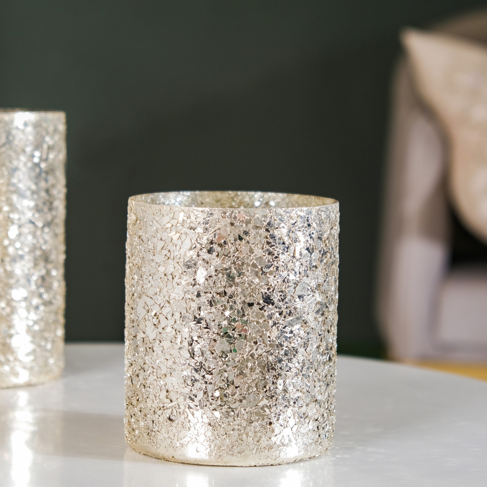 Introducing the perfect addition to your home decor collection- a set of 2 glass votives (one big and one small), beautifully crafted to adorn your living space. The glass ball structure gives it a luxurious touch, making it an ideal decor item for special occasions like festivals and ceremonies. Made with high-quality glass, these candle votives are highly durable and perfect for everyday use as well as for special occasions that call for a grand celebration. You can use them to light up scented candles or simply as decoration pieces to enhance your room design. These votives are also great for gifting to your cherished ones, whether it's for their home interior design, coffee table decor, living room decor, or pooja room design. Use them as table centerpieces, or anywhere in your home to add a touch of elegance and aesthetic appeal. Bring home these stunning decoration items and elevate your house decor with their exquisite charm and beauty. Features: -Premium quality -Handmade, artisanal -Excellent craftsmanship -Unique design -Luxurious -Set of 2 -Anti-tarnish -Perfect for gifting -Perfect for coffee table, pooja room, living room decor Nestip: The set of 2 glass votives can be an outstanding Diwali gift for your sibling. Size: Large- 10cm D x 16cm H Small- 10cm D x 12cm H Colour: Silver Material: Glass Products included: Set of 2 glass votives Style: GL46NSI03