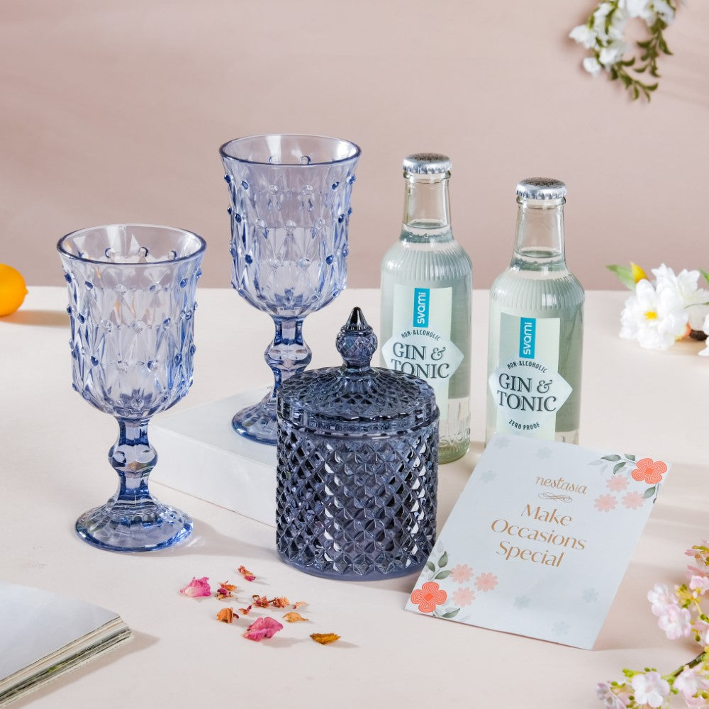 A grand affair like a wedding calls for a grander bachelor night with a luxe cocktail party. The wedding hamper set features 1 set of crystal wine glasses and can be an ideal gift to the hosts, adding some more glitz and glamour to the wedding extravaganza. The hamper also contains 1 diamond glass jar with a lid for a vintage charm amidst all the wedding grandeur.