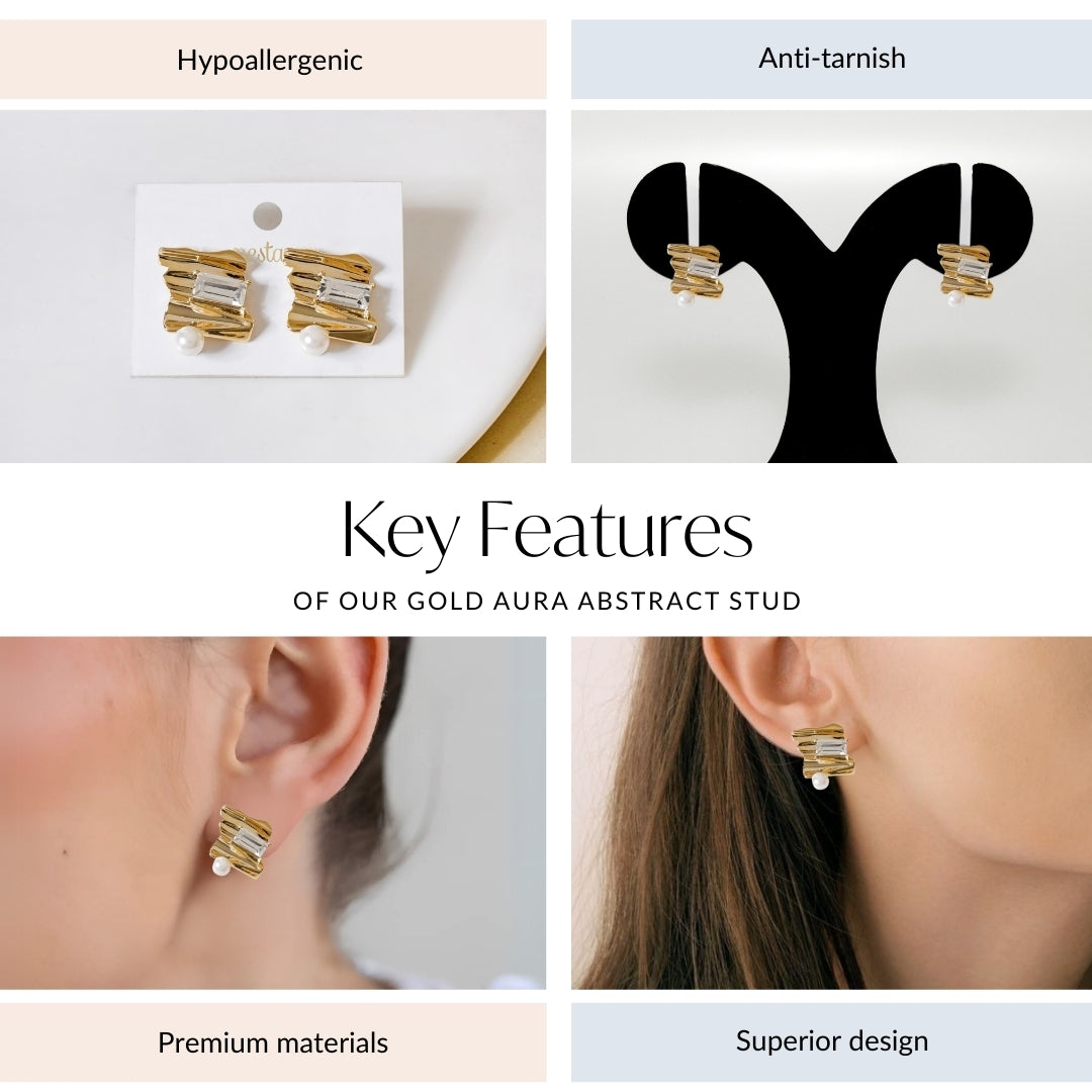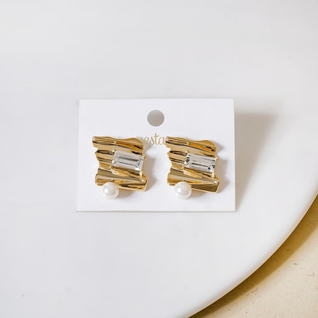 Crafted to perfection, this textured gold-plated stud is a striking blend of elegance and artistry. The hammered finish creates a raw, organic texture that catches the light with every angle, adding a modern edge to a classic design. On the right side, a transparent stone adds a touch of ethereal sparkle, while a lustrous pearl rests at the bottom, radiating timeless beauty. This stud is a harmonious fusion of bold geometry and soft femininity, making it a perfect statement piece for all occasions.