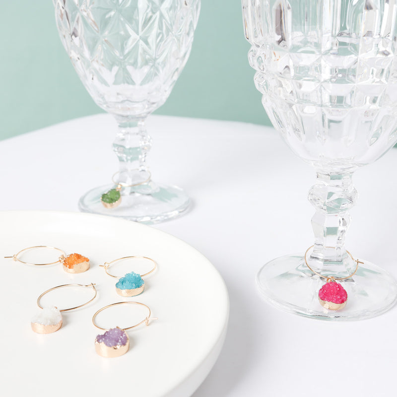 When one is in no mood to go overboard with a lavish table arrangement but needs the perfect set up, the little bejeweled wonders are to be brought out. Handcrafted to perfection, the set of wine glass charms in assorted colors add personality and appeal to the dining table. The small accessories are usually attached to the stem of wine glasses to personalise and decorate them according to preference so that it's easy to identify the glasses during parties. The stone wine charms are provided with a clasp for easy use.