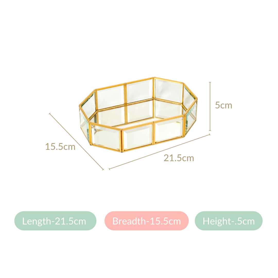 Design: Crafted from premium-quality tempered glass and enclosed by rust-resistant metal borders that have been set by hand, the octagon-shaped tray is here to level up your vanity organization game. Endowed with bevelled glass on all sides and an anti-glare mirrored base for a crystal-clear reflection, this vanity tray is a great blend of form and function. To pull it all off, the trinket tray comes with an anti-skid foam padding at the bottom for added protection.