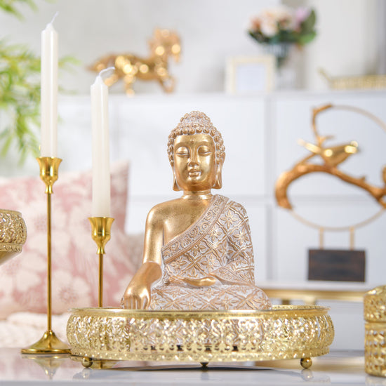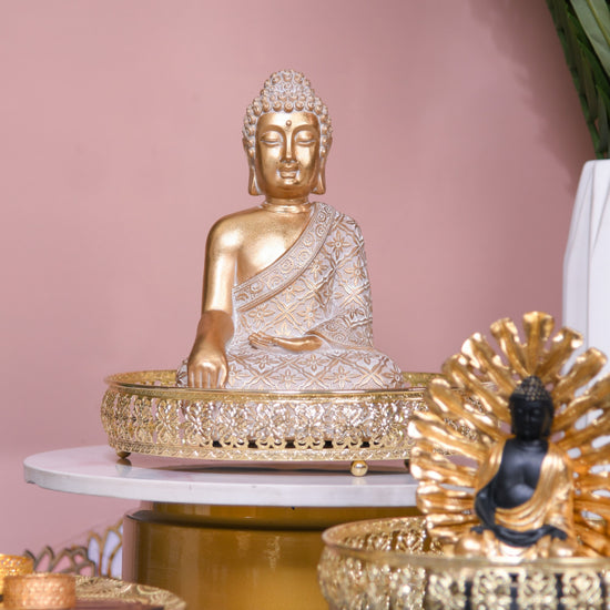 The Gold Buddha Statue, an epitome of wealth and grandeur, exudes a sophisticated aura that melds well with its flawless craftsmanship. With its exquisite design, this magnificent statue honours Lord Buddha and conveys a deep understanding of craftsmanship. The statue showpiece would be a top choice for anyone looking for opulent home decor because of its appealing gold finish, which draws attention and makes for a conversation starter. This showpiece is elegantly embellished with intricate features that show the precise attention to detail that went into this showpiece. The Gold Buddha Statue stands as a perfect accent, destined to heighten the appeal of any living room decor.