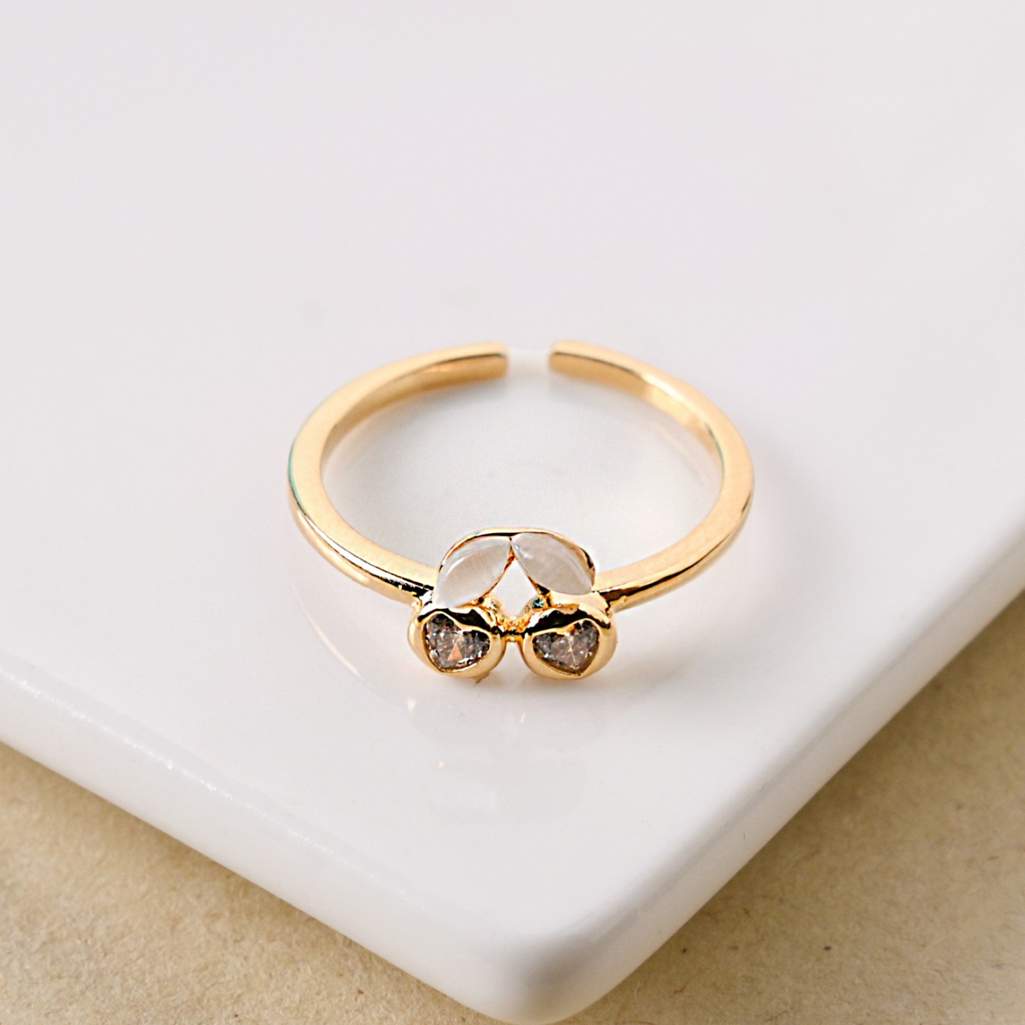 Sweet, stylish, and effortlessly unique, this gold-toned ring brings a whimsical charm to your jewellery collection. At its center, two radiant cherries take the spotlight, each crafted from a single iridescent stone that shimmers beautifully with every move. Delicate white PVC leaves add a modern contrast, making the design pop with freshness. Whether paired with casual outfits or dressed up for a night out, this ring is the perfect blend of playful allure and refined elegance.