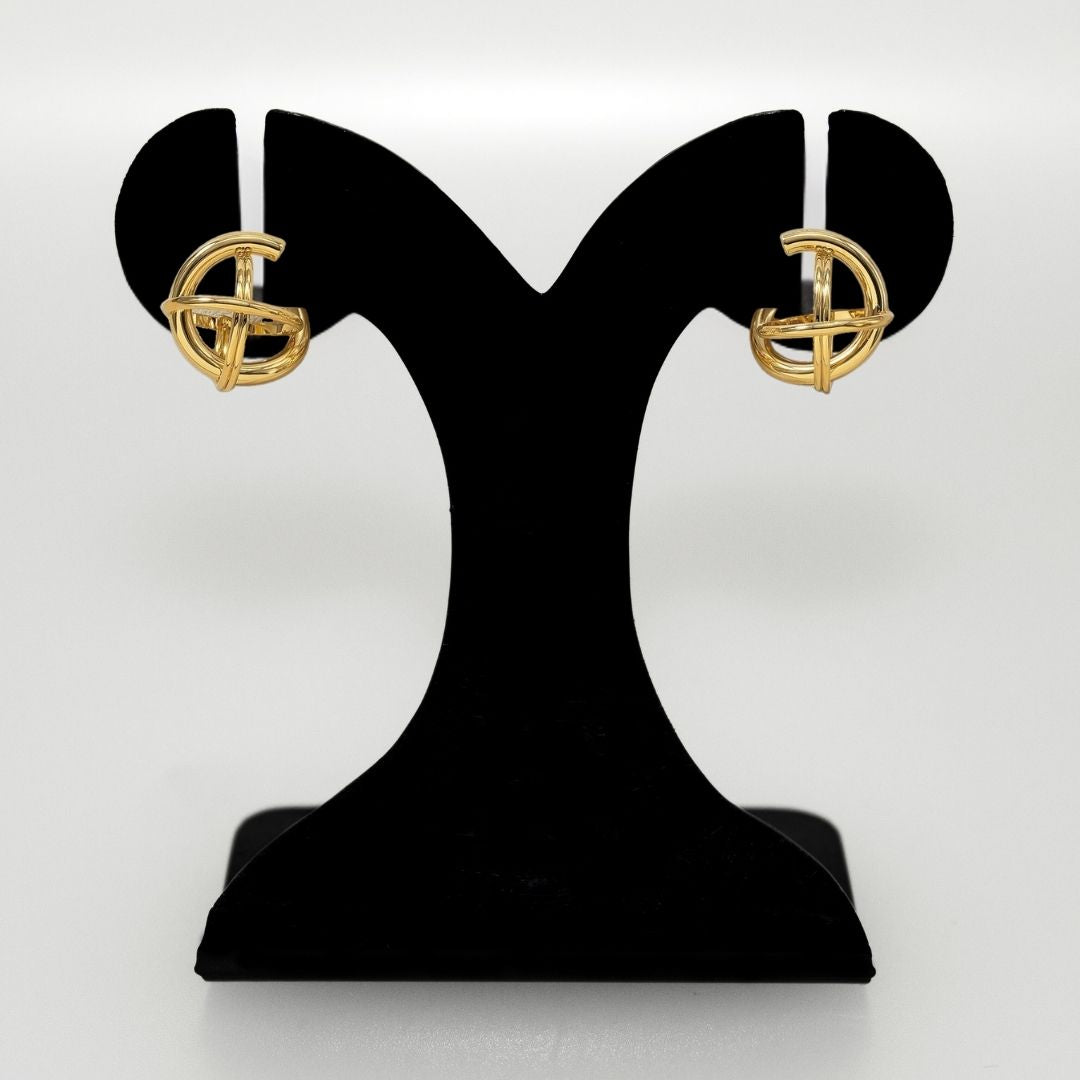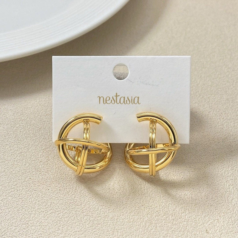 The metallic circle drop earrings offer a striking geometric design that commands attention. At the heart of the piece lies a bold, larger circle, with two smaller circles placed thoughtfully within—one vertically and the other horizontally—creating a captivating layered effect.