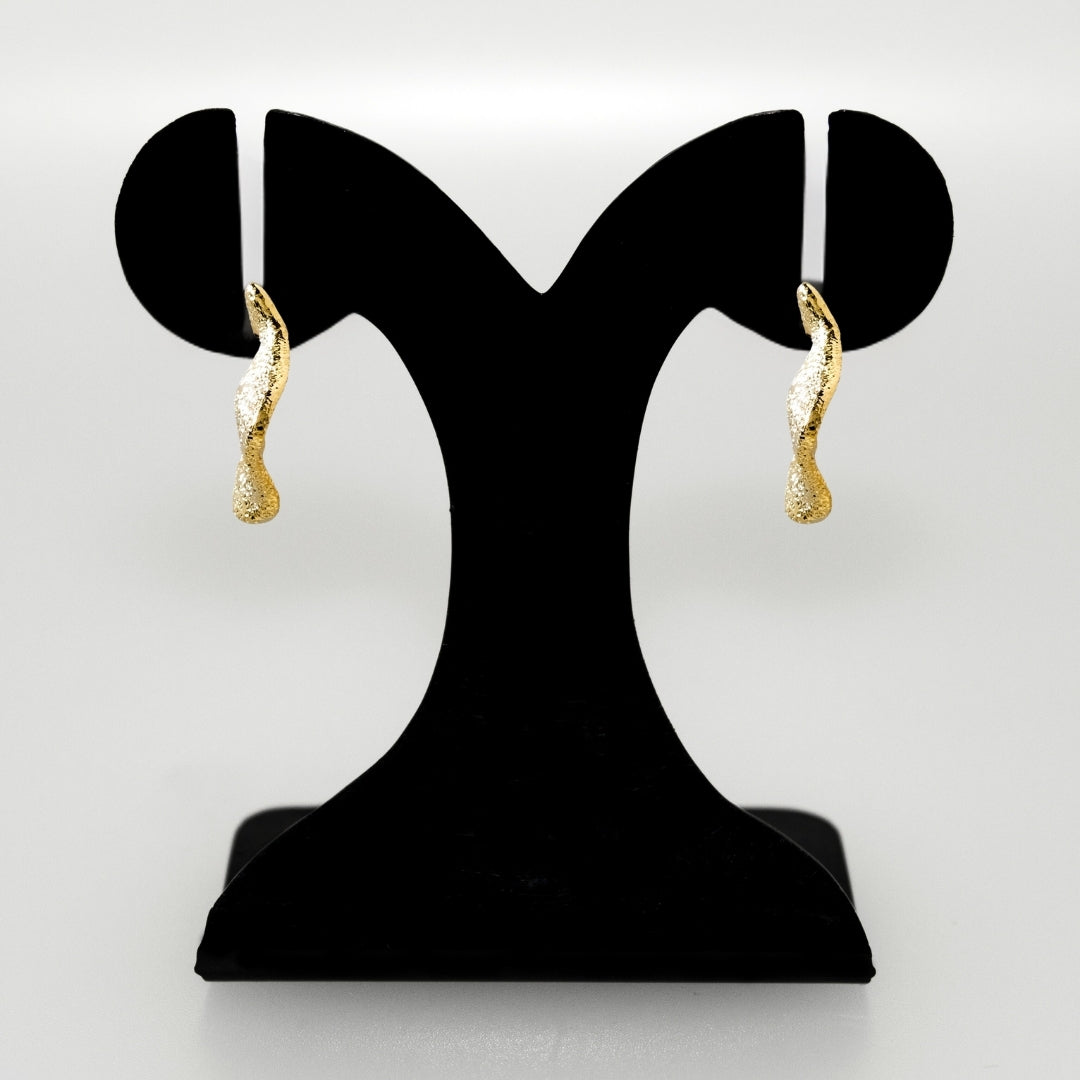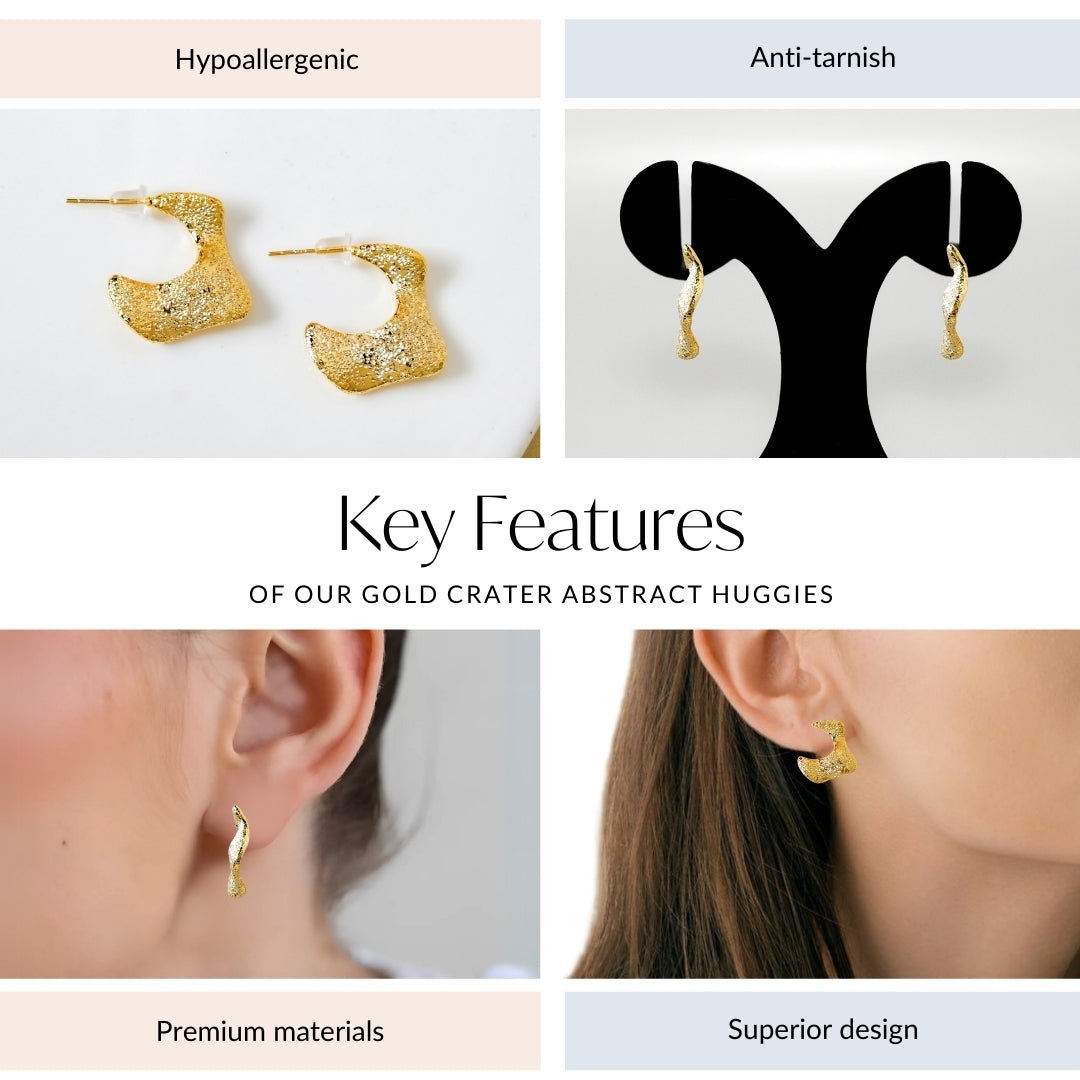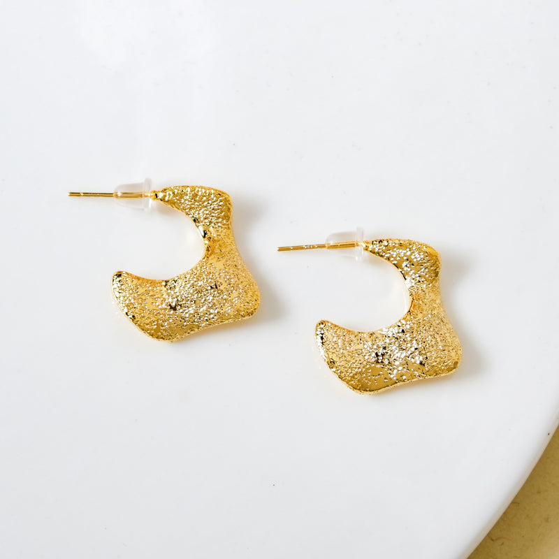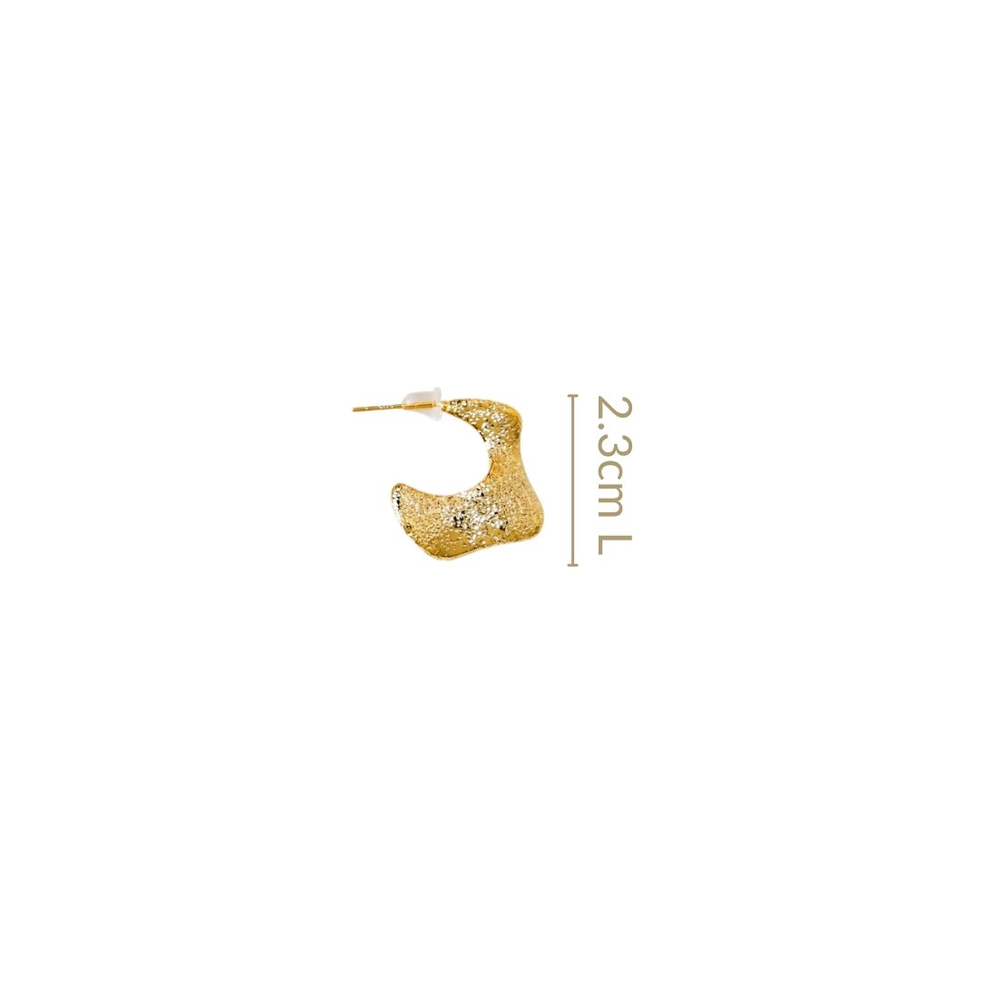 Unearth the beauty of imperfection with these abstract gold huggies, where raw texture meets refined artistry. Sculpted in an organic, freeform shape, their gold foil-like finish shimmers with an effortless glow, while minute pores etched into the surface add a depth that feels both ancient and modern. Evoking the essence of molten metal cooled by time, these huggies are more than just jewellery, they are fragments of untamed elegance.