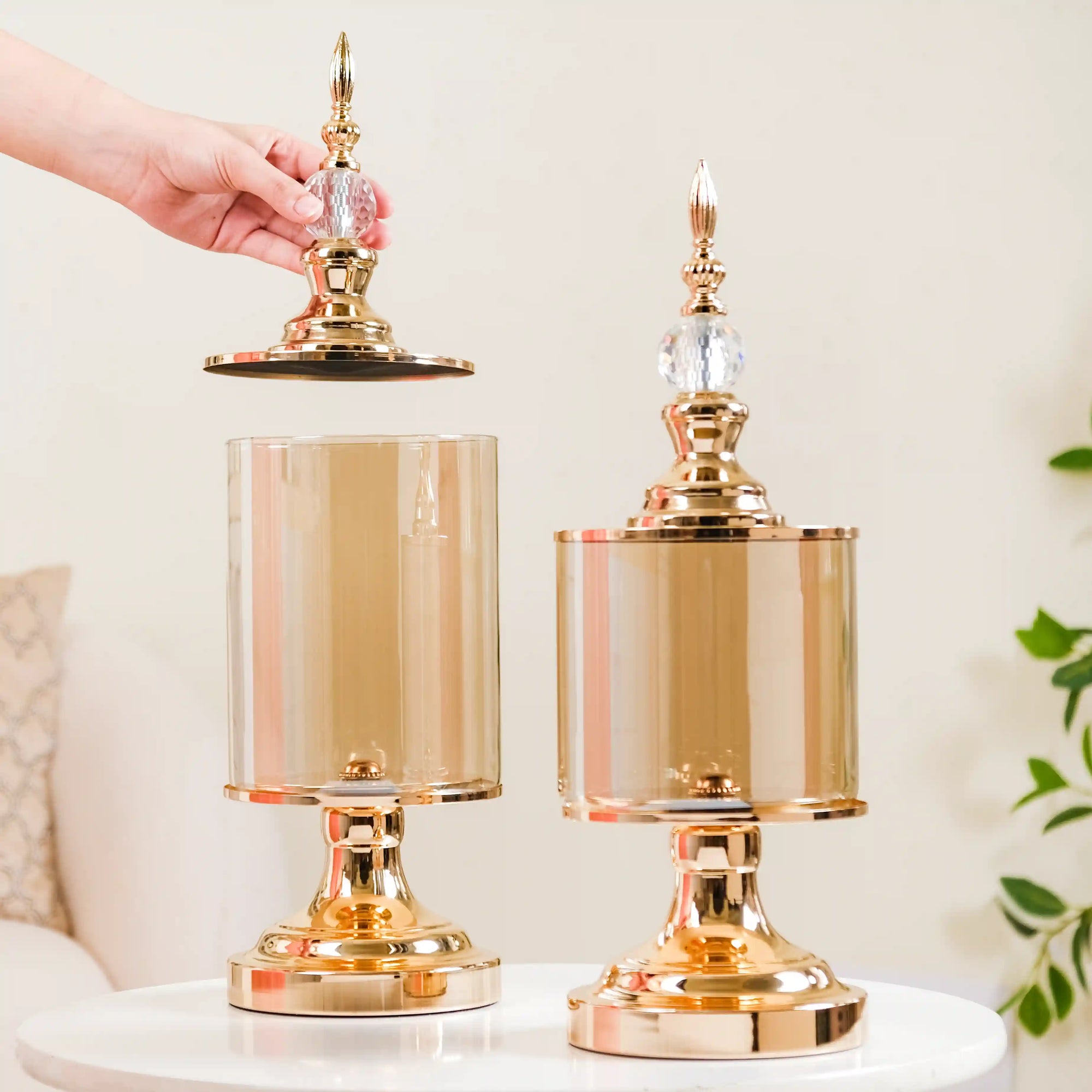 Create an enchanting aura with our majestic candle holders. A beautiful amalgamation of glass tops sitting delicately on a metal base which can be a perfect accessory for your home's decor. When lighted these elegant decorative hurricane-style candle holders uplift the ambiance of any room. With its natural glow in candlelight, it is sure to be a head-turner.