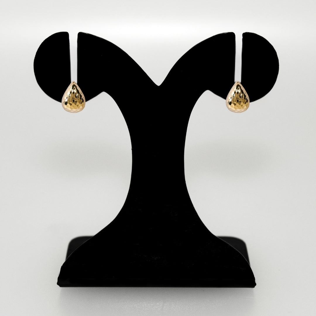 Upgrade your style with these gold drop-shaped stud earrings, a timeless symbol of effortless elegance. Crafted from radiant metal, the surface is adorned with intricately etched geometric patterns that catch the light with every movement. The delicate water-drop silhouette embodies fluidity and grace, while the textured detailing adds depth and character in a rich, golden hue.