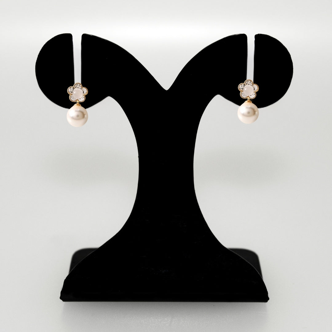 Delicate yet captivating, these drop dangler earrings feature a floral-inspired stud adorned with sparkling stone petals. At the heart of the flower, a pristine white PVC bead adds an ethereal touch, while a lustrous pearl drop sways gracefully, creating a soft, mesmerizing movement. These earrings beautifully blend elegance with a touch of playfulness, making them the perfect accessory for a refined, yet enchanting look.