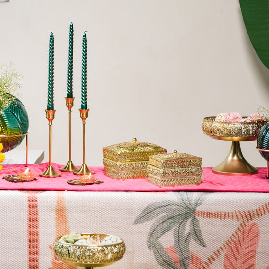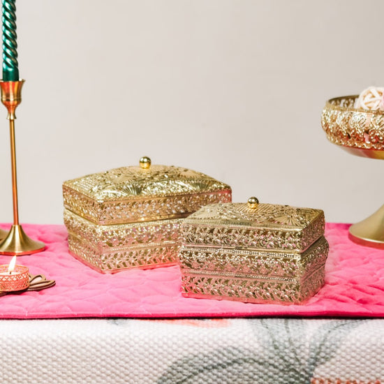 These jewellery boxes help to maintain a well-organised vanity table. By providing designated spaces for different types of jewellery, they prevent tangling, scratching, and misplacement. The sturdy top lid with a knob ensures quick access, saving you time while getting ready. Their harmonious blend of antique filigree metalwork and high-sheen gold finish elevates the visual appeal of your vanity setup.