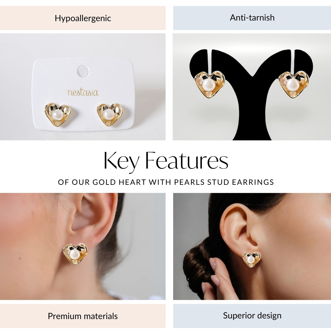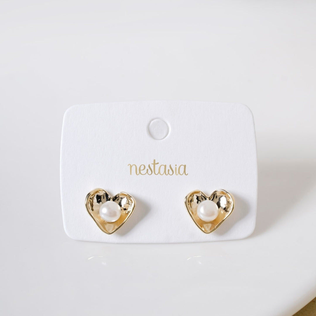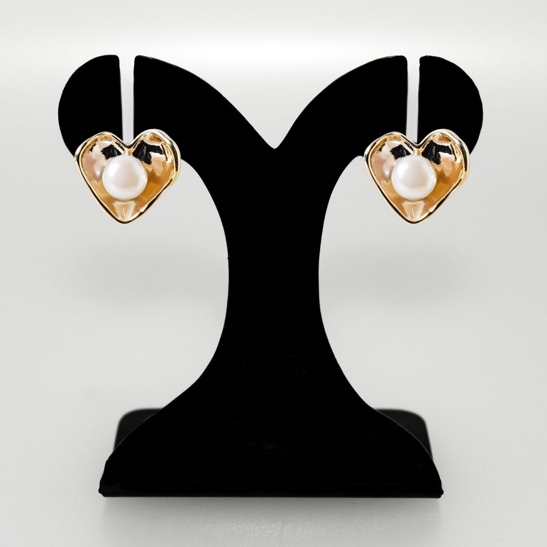 Capturing the beauty of simplicity, these stud earrings embody subtle elegance. Inspired by the elegance of timeless love and delicate beauty, these heart-shaped earrings radiate a sense of quiet sophistication. The gentle curves, paired with a hammered texture, evoke a sense of organic grace, while the faux pearl at the center adds a soft, luminous touch. Perfect for those who appreciate understated elegance, these earrings bring a refined, graceful finish to any look, effortlessly elevating your style with a subtle hint of charm.