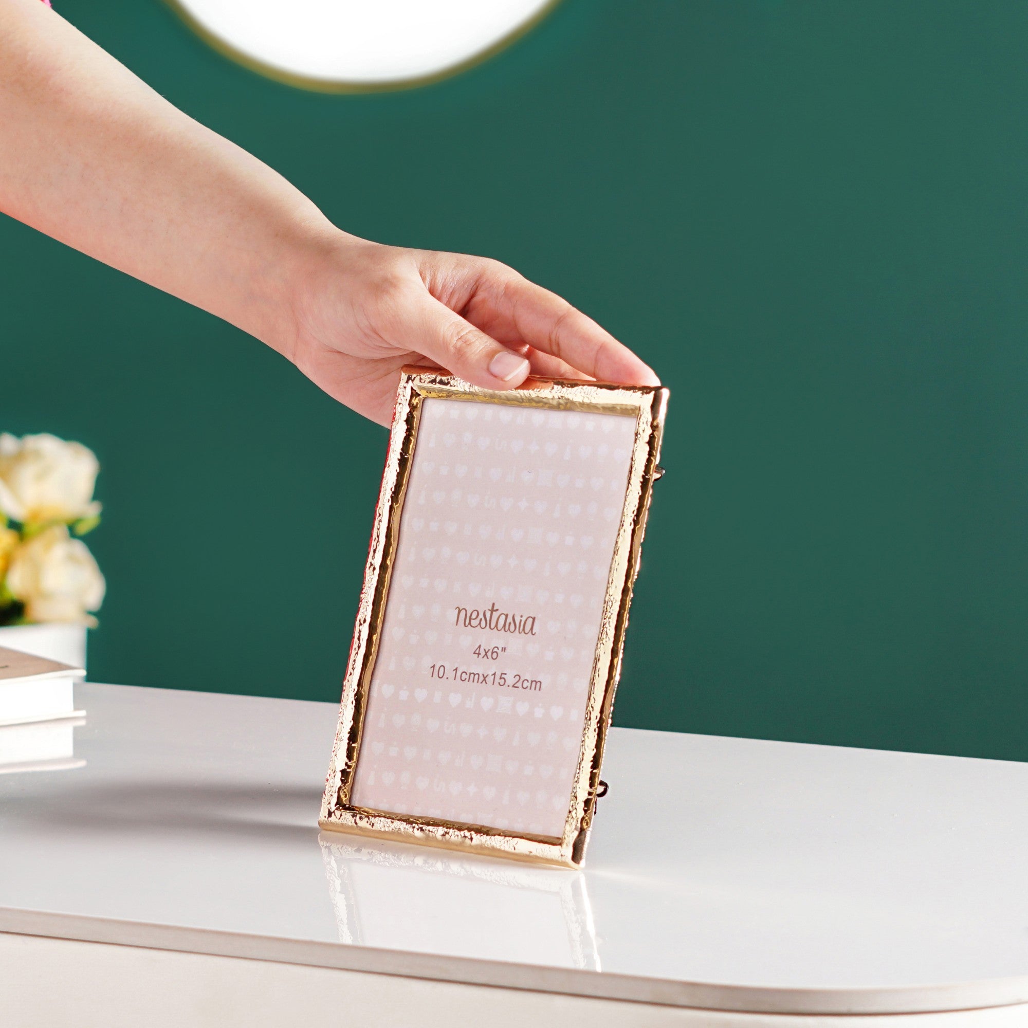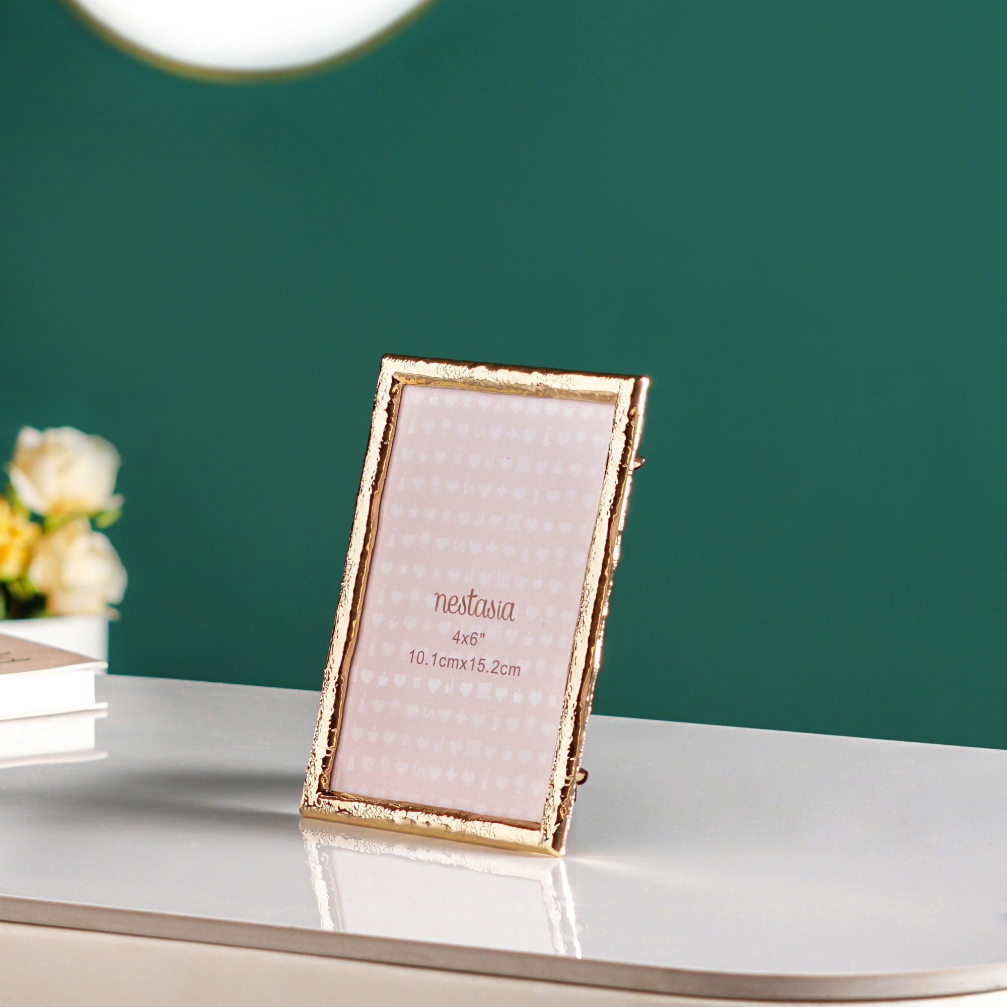 Give your favourite memories a glamorous home. This stunning gold textured frame is a luxury accent piece, perfect for displaying cherished 4×6" photos with style and sophistication.