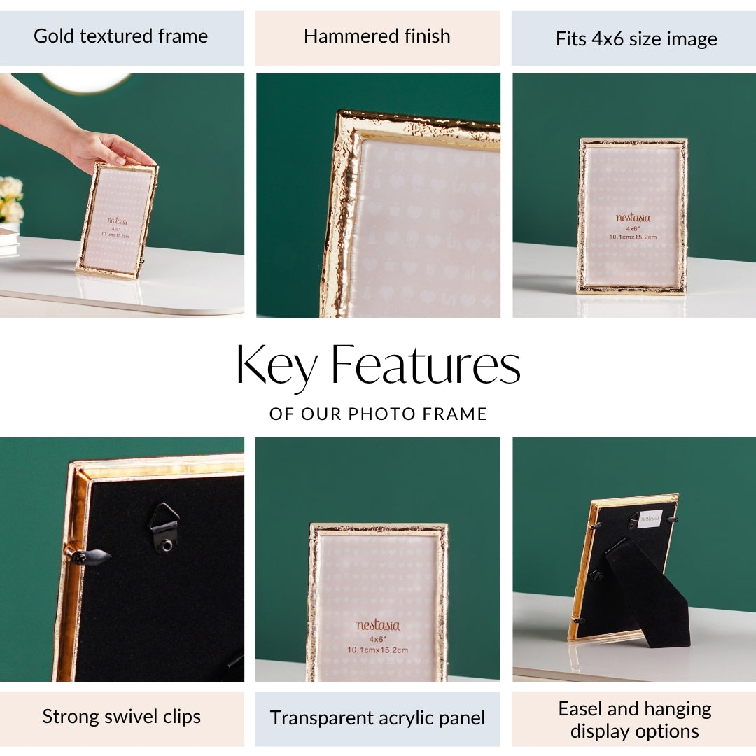 Design: This frame showcases a unique hammered texture on its surface, giving it a modern, eye-catching appeal. The bright, polished gold finish reflects light beautifully. Constructed from durable materials, the frame has thick, substantial edges. It fits standard 4×6 inch photographs and includes protective glass, while the back features a stand and hooks for versatile tabletop or wall display.