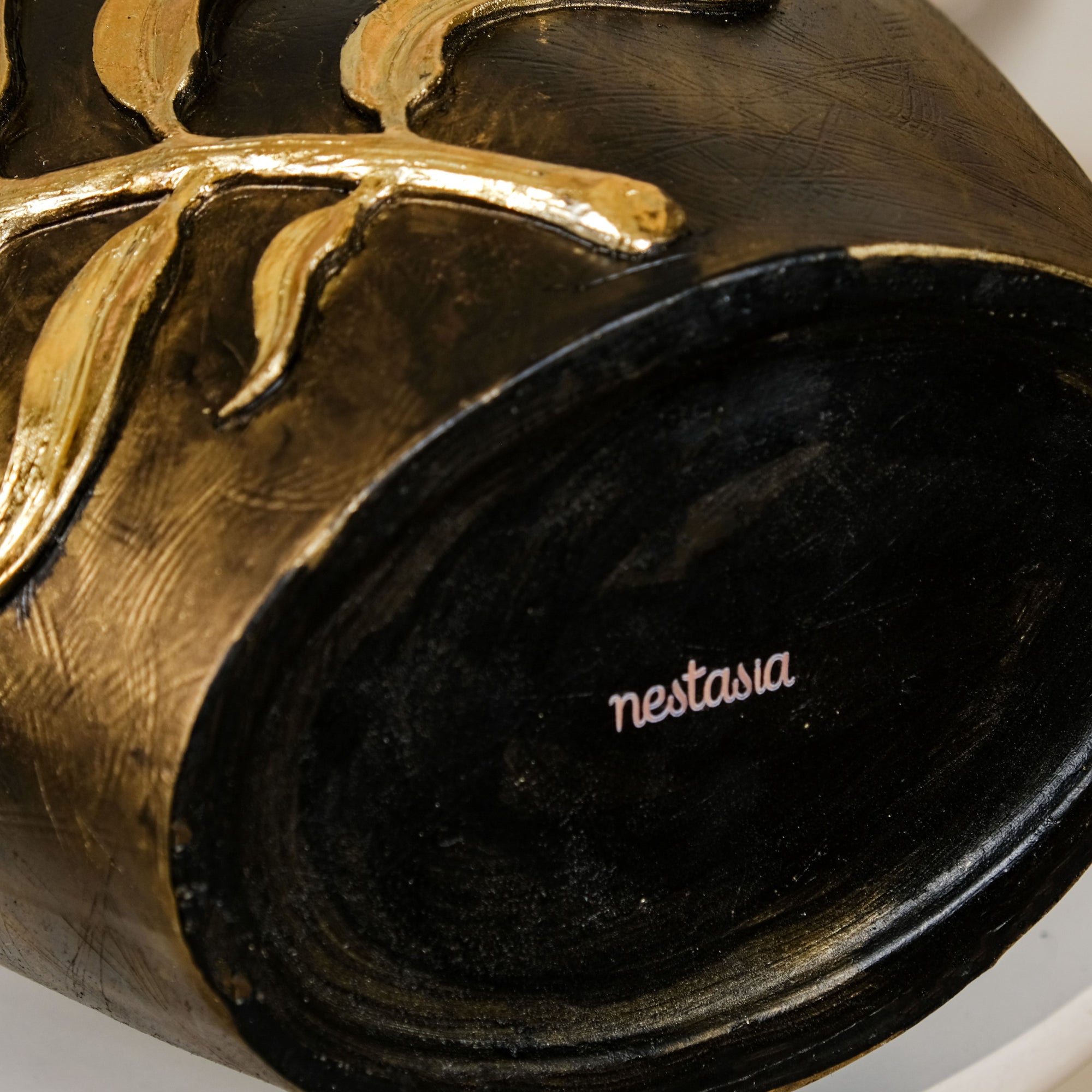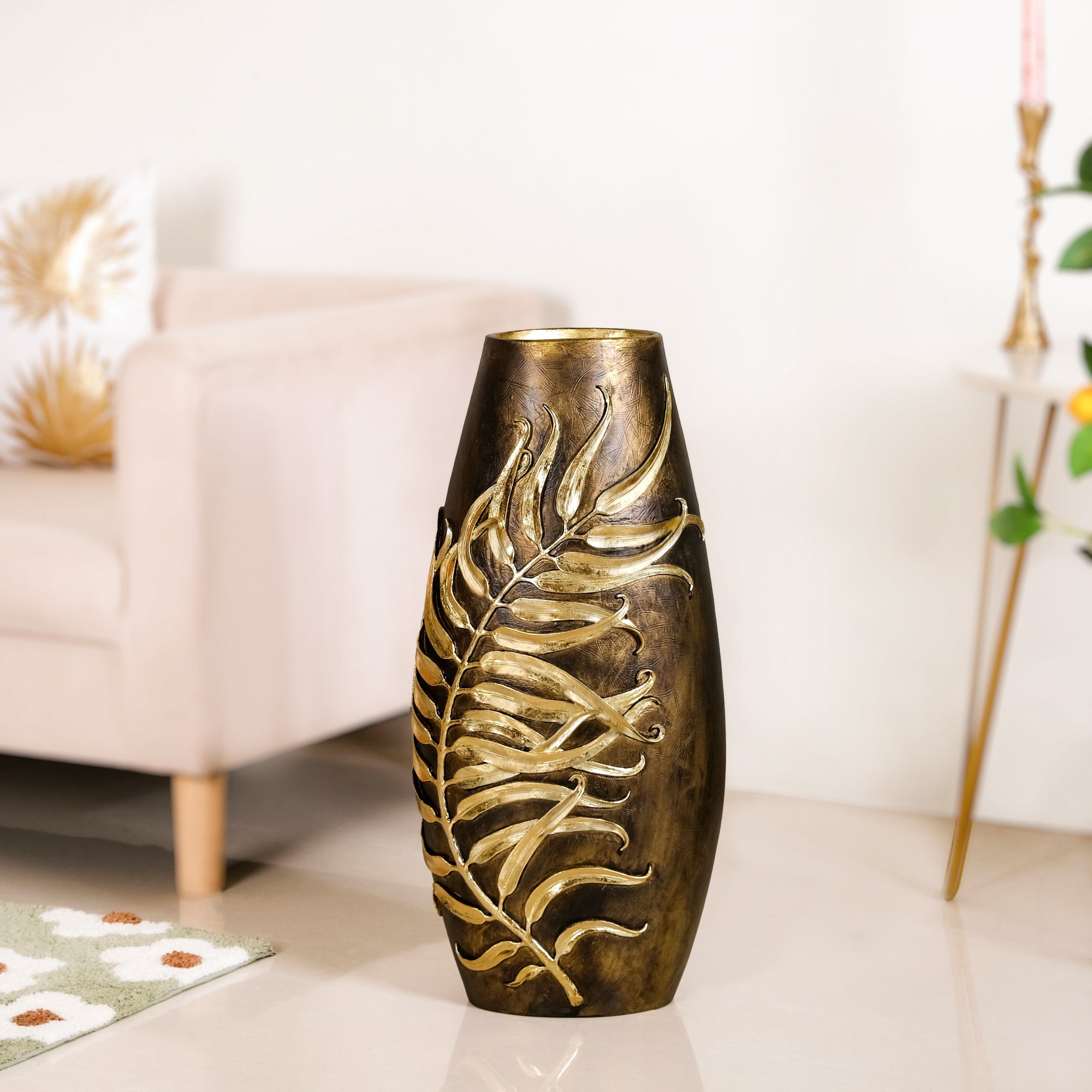 Design: This long flower vase showcases an embossed gold botanical design, featuring a beautifully sculpted fern across its surface. The contrasting two-tone finish is a hallmark of this piece: a shimmering gold leaf effect on the leaves stands out dramatically against the vase’s deep, textured black body. Its tall, elegant silhouette provides a commanding presence, while the sturdy structure ensures a stable display on any surface.