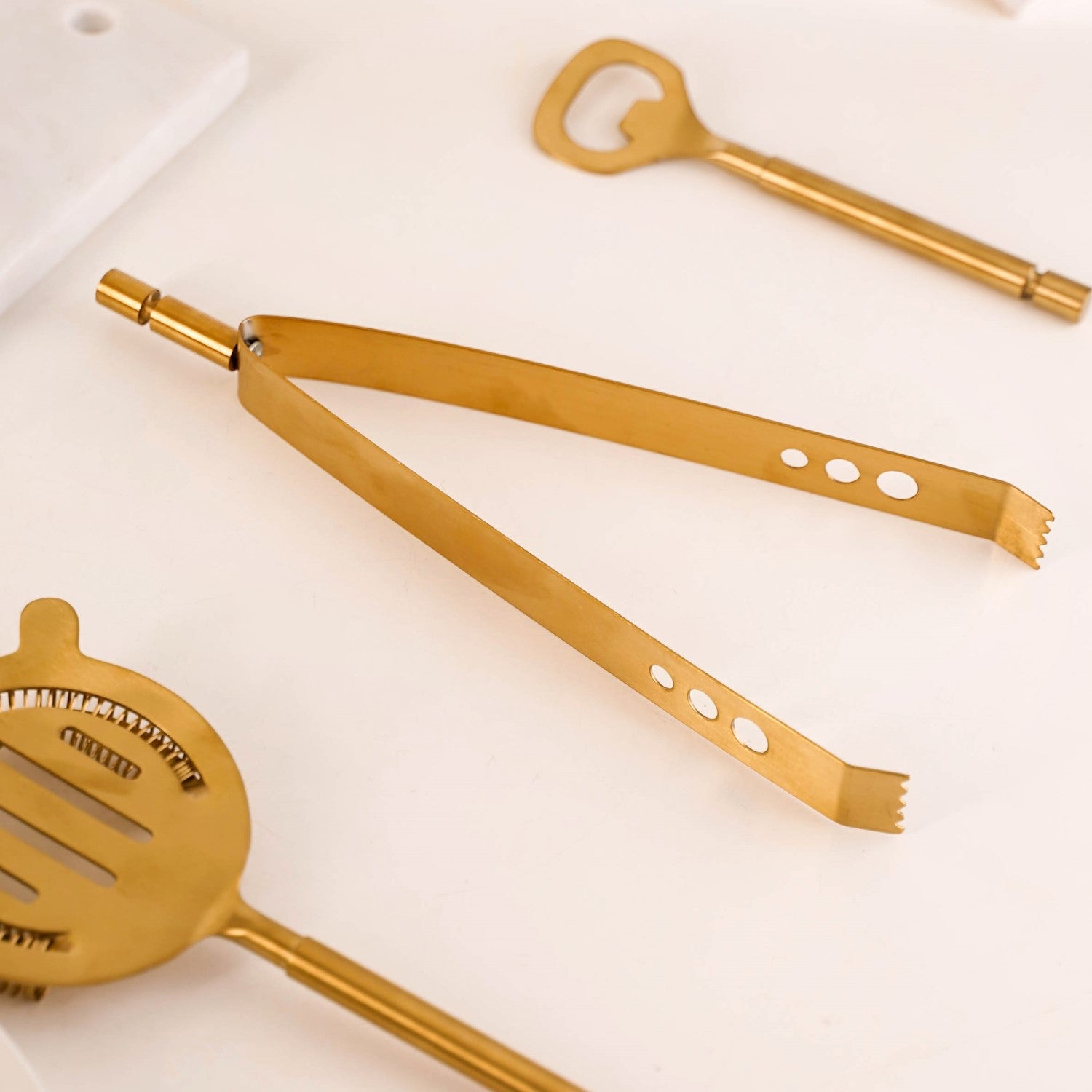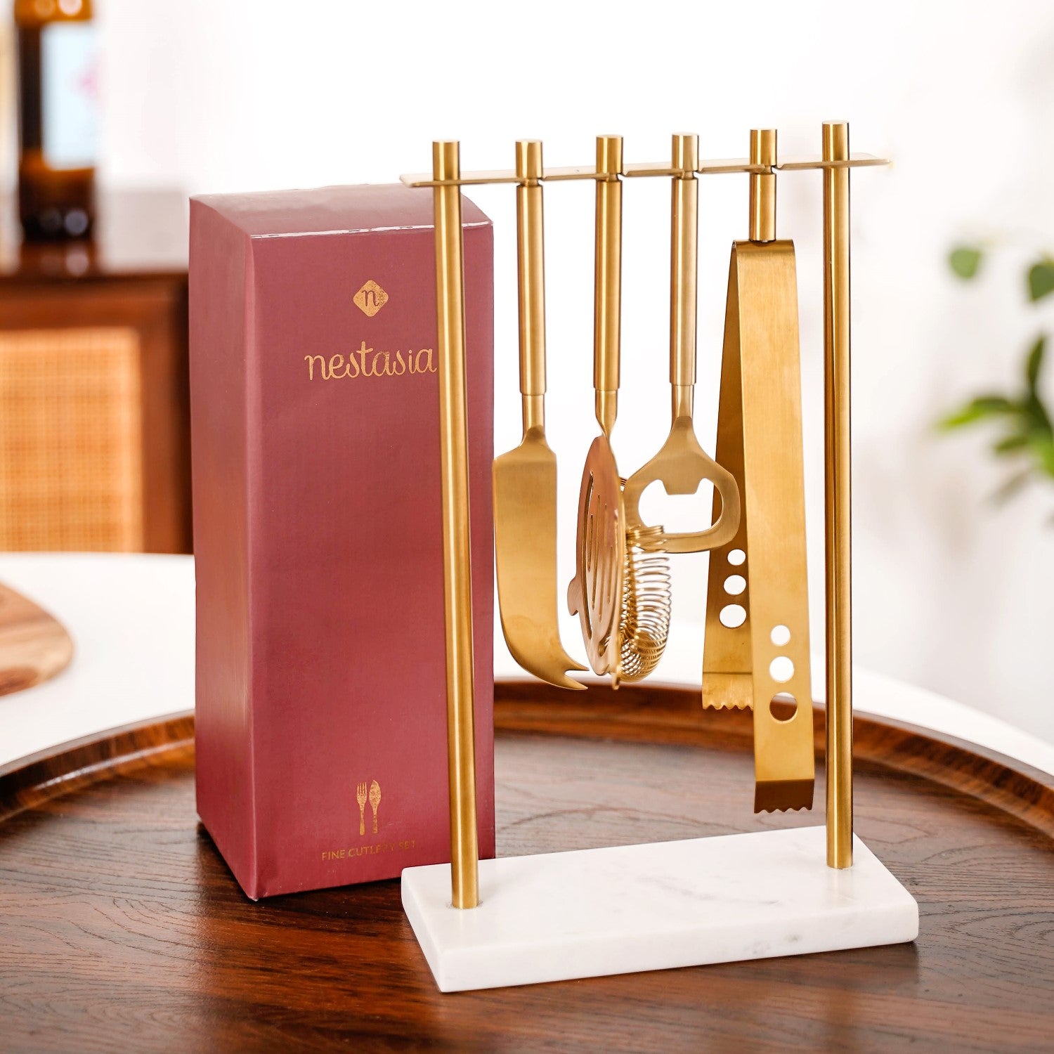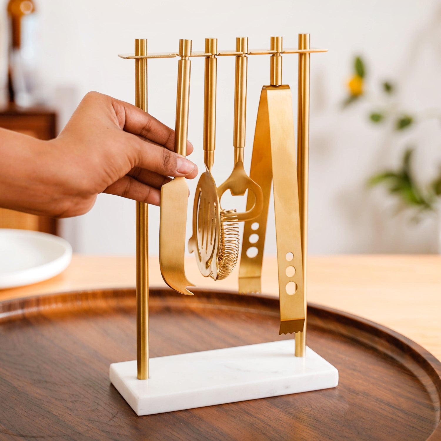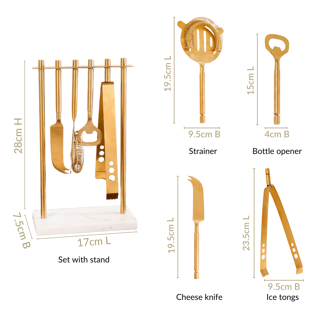 Design: Each tool in this set is thoughtfully designed to meet bartending needs, with a sleek PVD-coated metallic gold finish that exudes luxury. The stand features a sturdy marble base and metal rods, creating a striking centrepiece. The top rod includes distinct slots to neatly hang each bar tool, offering easy access and a visually appealing arrangement.