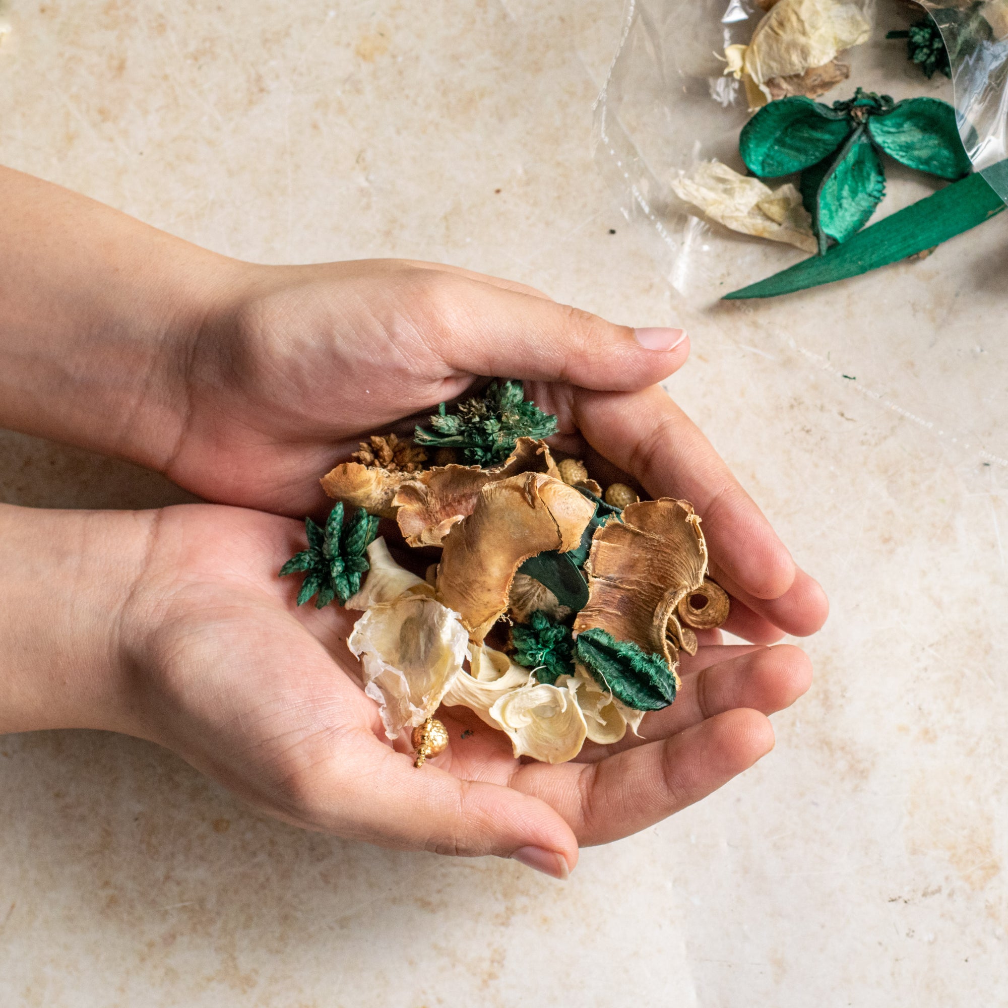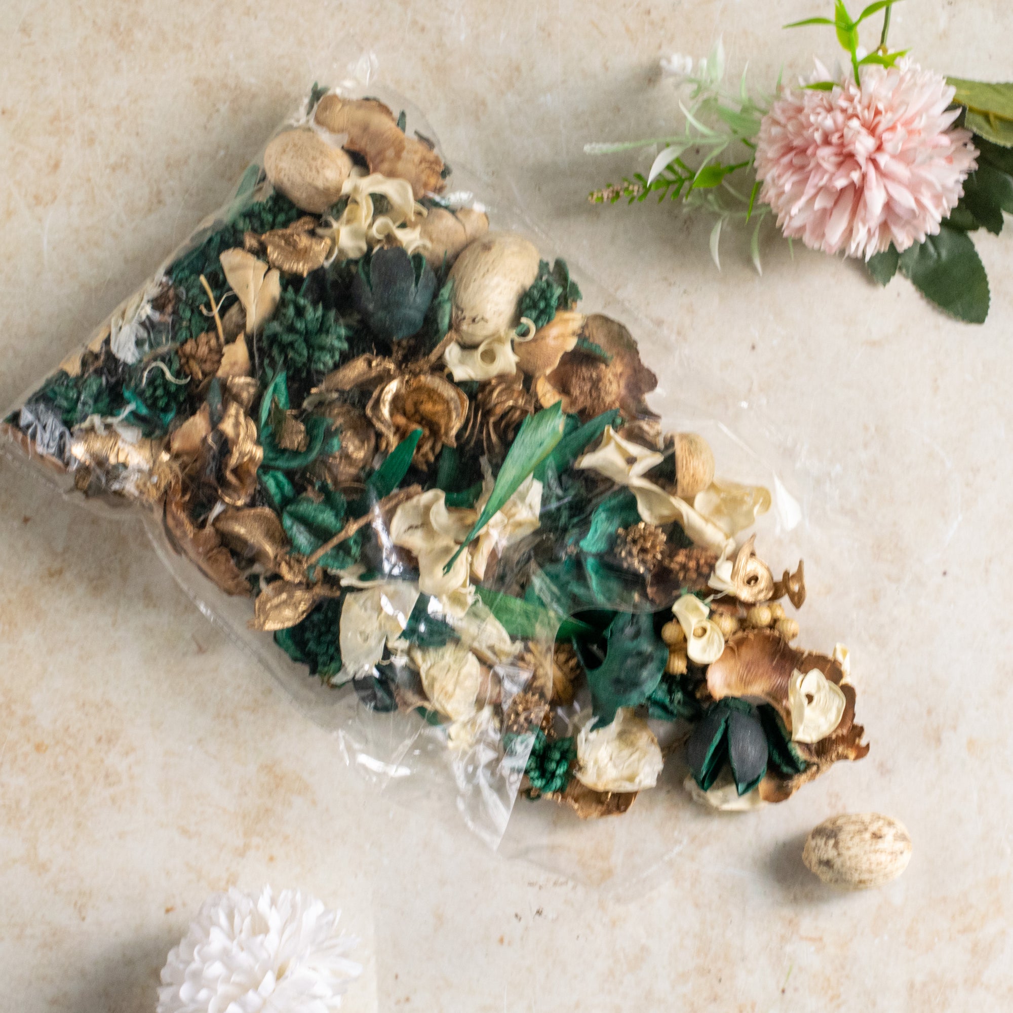 Nothing beats a pleasant scent while sipping that perfect cup of coffee or eating a delectable meal. Also, it is very pleasing for the eyes! The hues that have been chosen for the potpourri mix consist of subdued tones of garden green, golden and natural ivory white. The dried flower petals have been picked and sifted through a meticulous process of handpicking by artisans who dye the decorations naturally without any use of chemicals or other inorganic substances. Create a soothing vibe at home on special occasions such as festivals and get-togethers by placing the decoration in a glass jar or wooden bowl and spraying it with fragrant essential oils.