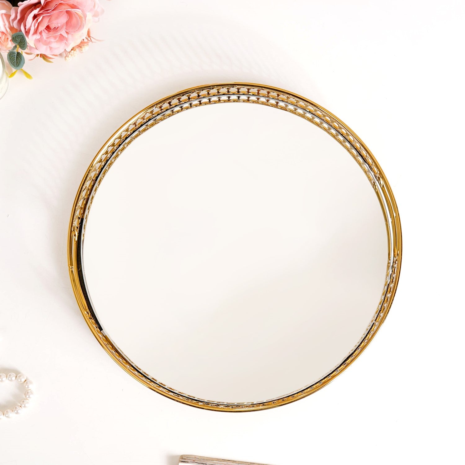 Design: The decorative tray boasts an intricate rim design with a metallic gold finish, adding a luxurious touch that catches the light beautifully. The crystal-clear mirror base amplifies its elegance, while the easy-grip handles ensure convenient handling. Sturdy metal legs provide reliable support, keeping the tray stable and secure.