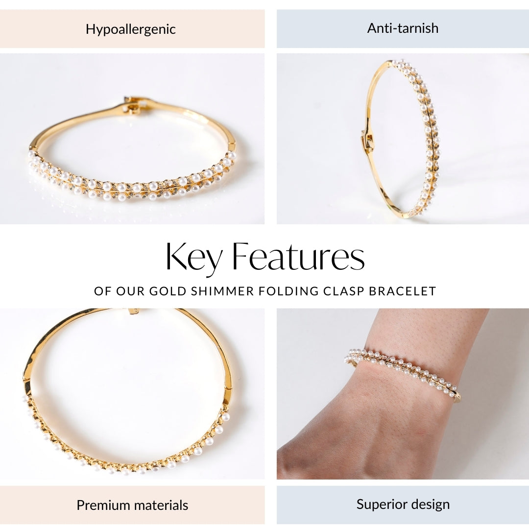 This exquisite gold bracelet draws inspiration from the graceful veins of a leaf, intertwining elegance and nature's beauty. Alternating lustrous pearl beads and shimmering stones are meticulously arranged on either side, with a sleek gold metal line running through the center, emulating the natural symmetry of a leaf's structure. The bracelet is secured with a foldable clasp, ensuring both comfort and a secure fit.