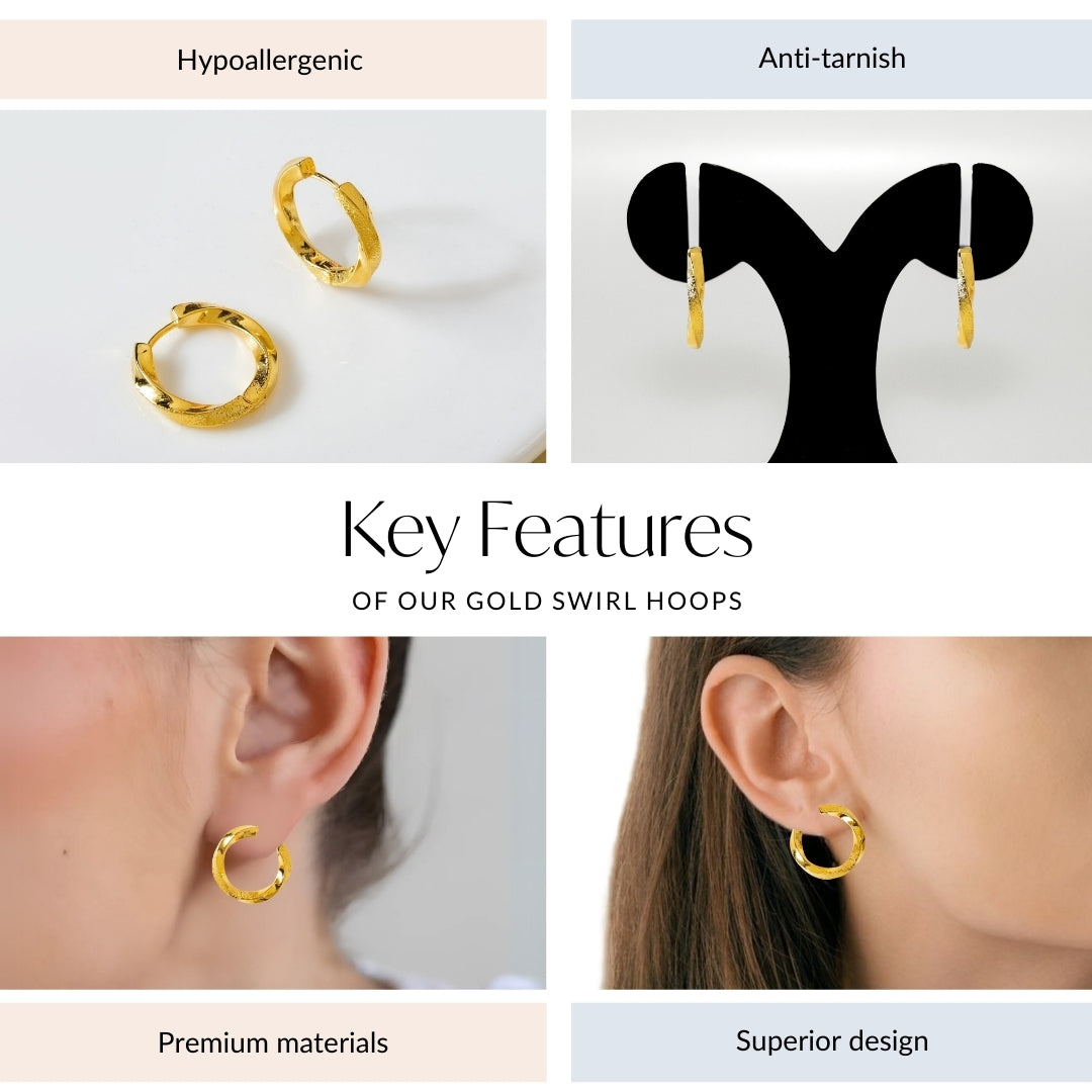 These hoops offer a unique twist on classic hoop earrings with their swirling design, blending modern sophistication with subtle artistry. Shaped like small hoops, the earrings feature a dynamic swirl pattern—one side textured with a rich, intricate finish, while the other remains smooth and polished, creating a beautiful contrast. This thoughtful balance of textures adds a fluid, yet refined movement to the design, making these huggies an effortlessly chic choice for any occasion.