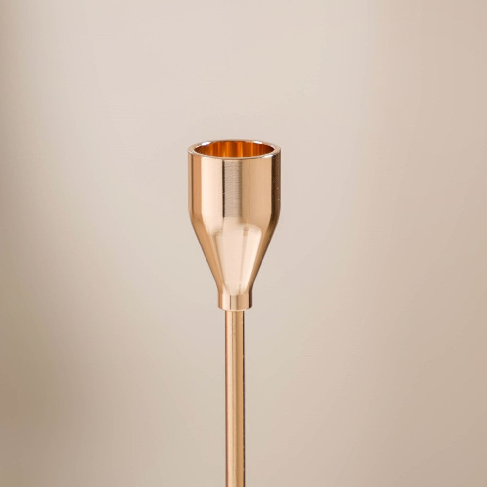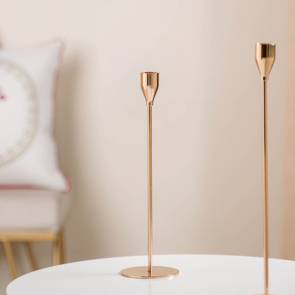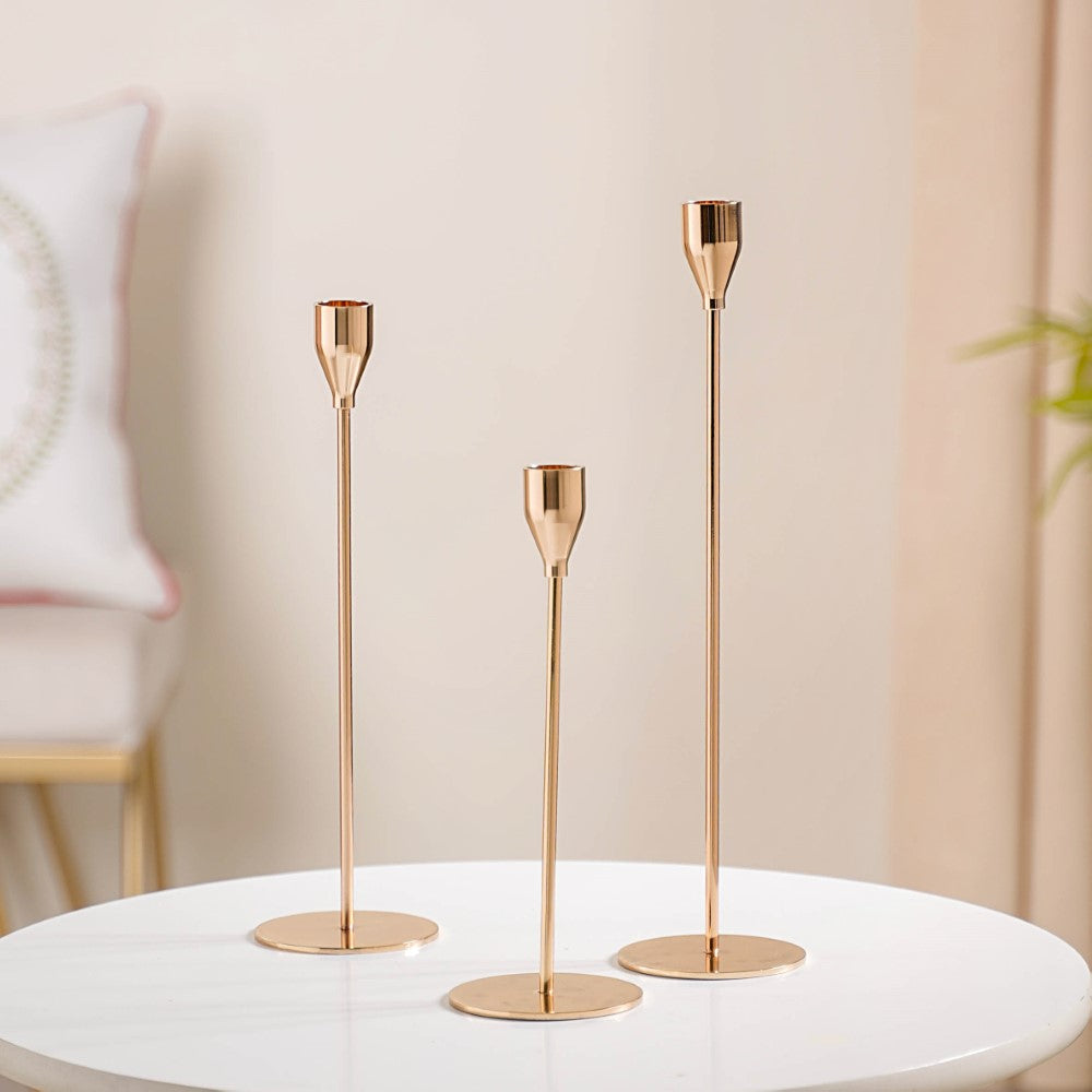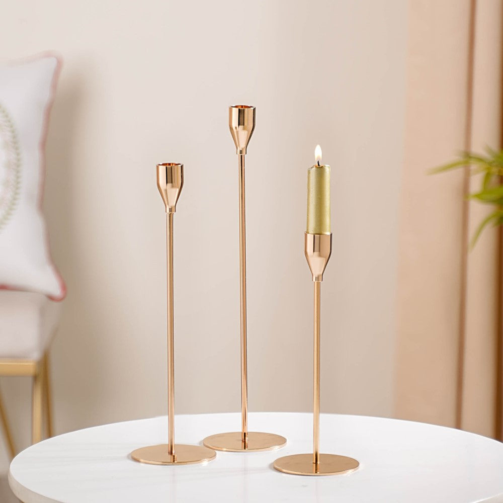 The metal candle holder set beautifully blends functionality and Nordic style and design that can go well with any modern and minimalistic room decor. The candle stand set includes 3 taper candle holders of different sizes having a lustrous gold finish. The candle holders are expertly crafted from high-quality metal and come with a sturdy round base to offer stability and prevent the candle stands from toppling off the surface. The high-sheen metal exterior of the candle holders reflects candlelight to create a shimmering visual effect for a romantic ambience. Pair the candle stands to create a stunning dining table set up for a romantic candlelight dinner date.