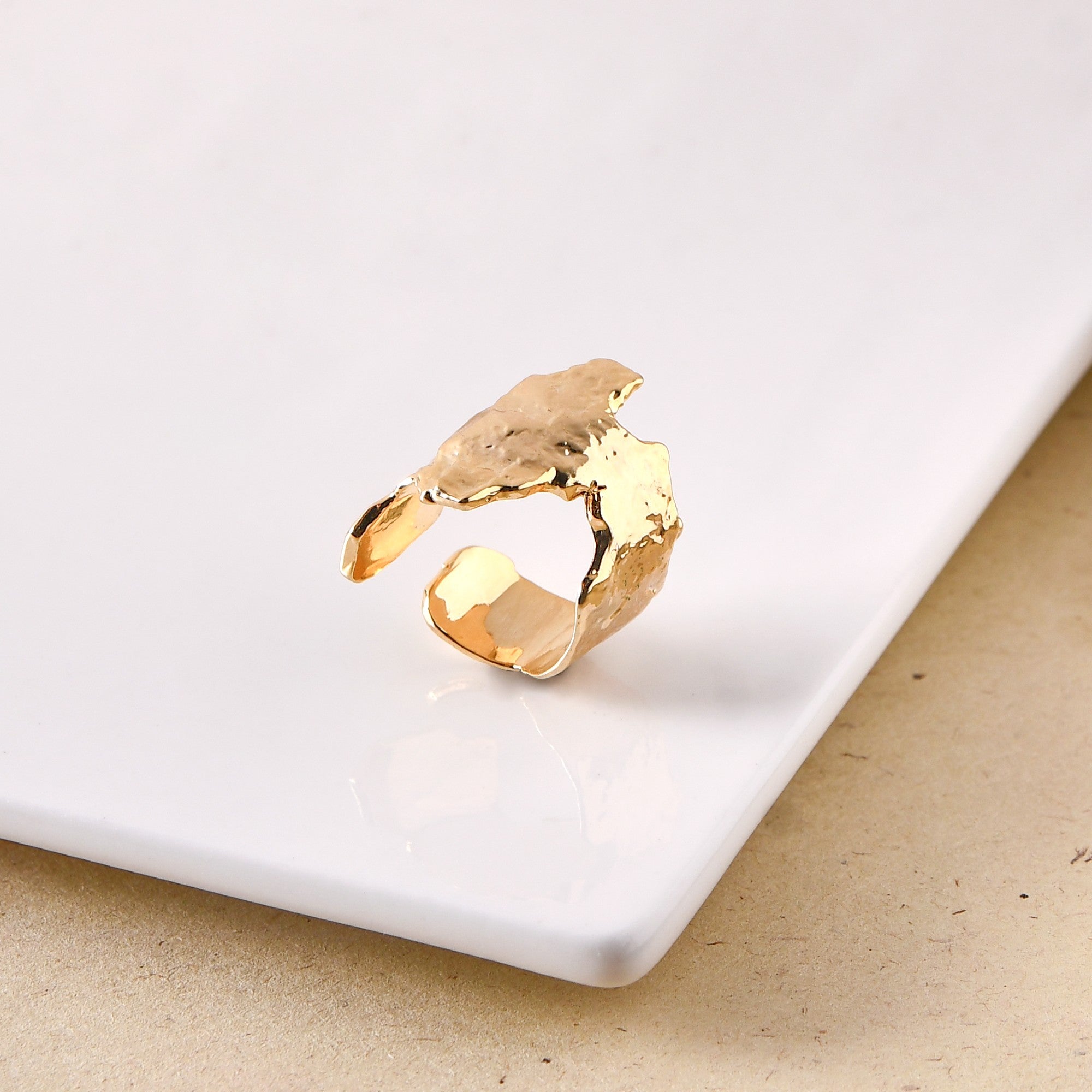 This bold and artistic statement ring is a true embodiment of raw elegance. Crafted in a rugged, organic shape with a rich gold-tone finish, it exudes a striking, sculptural appeal. The textured surface adds depth and character, making it a perfect accessory for those who love unconventional, avant-garde designs.