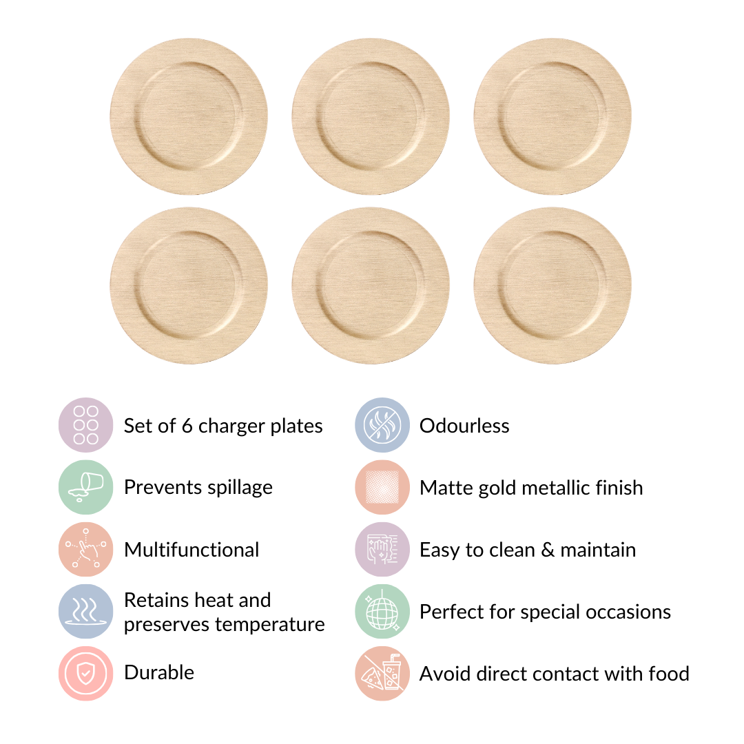 Our powder gold charger plate stands out due to its premium quality and elegant appearance. It is crafted with precise attention to detail using top-notch materials. The matte metallic gold finish is subtle and sophisticated, making it a versatile choice for various table settings. The quality of the charger plate ensures it can withstand daily use, and its durability means it will remain an integral part of your tableware for years to come. The attention to detail in its design, such as the smooth edges and fine craftsmanship, adds a touch of luxury to your dining experience. This charger plate exudes timeless elegance, making it a valuable addition to your collection of dinnerware.