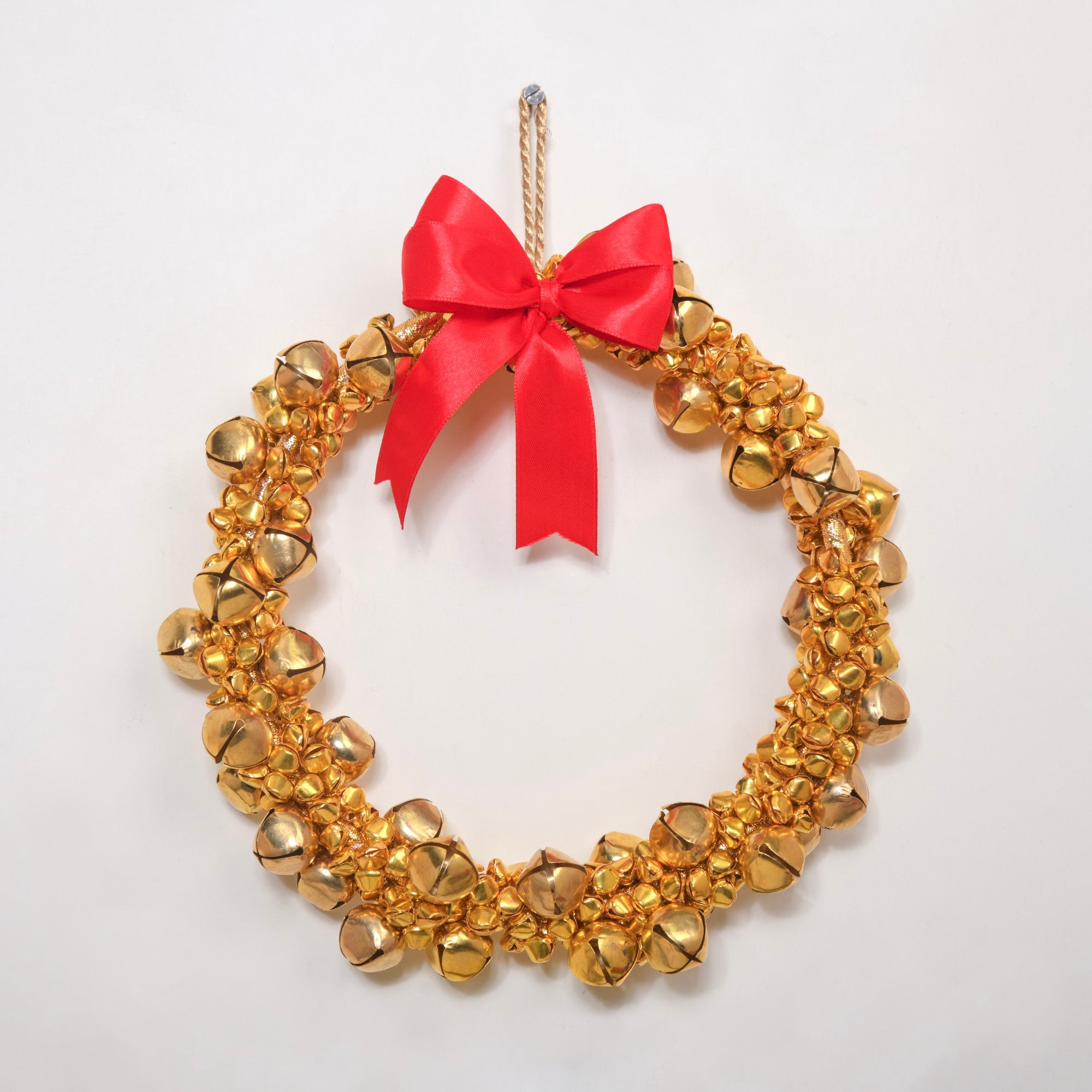 Our golden Christmas wreath stands out with its combination of elegance and tradition. The carefully crafted design incorporates golden bells, creating an intriguing visual appeal. The wreath is bound securely to a gota-wrapped frame with sturdy golden coils, ensuring durability and a distinctive look that sets it apart from ordinary wreaths.