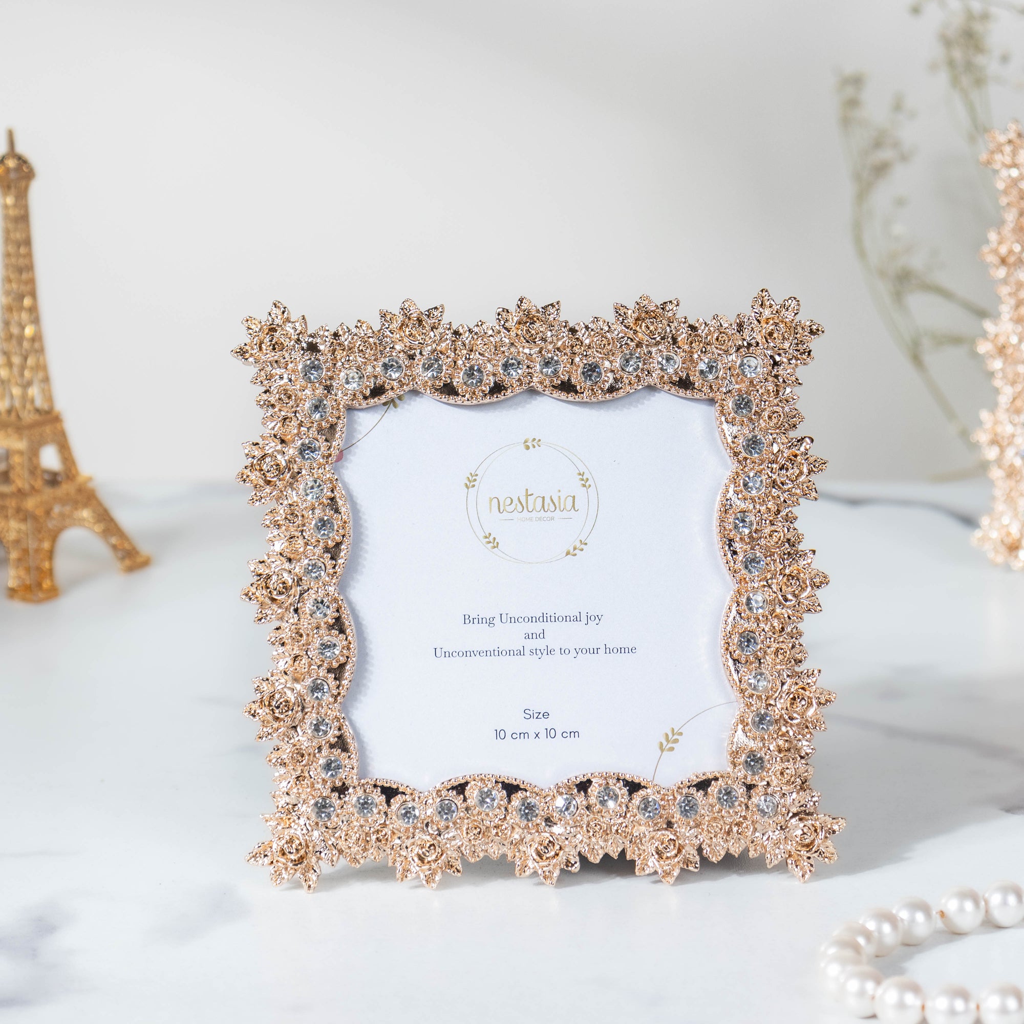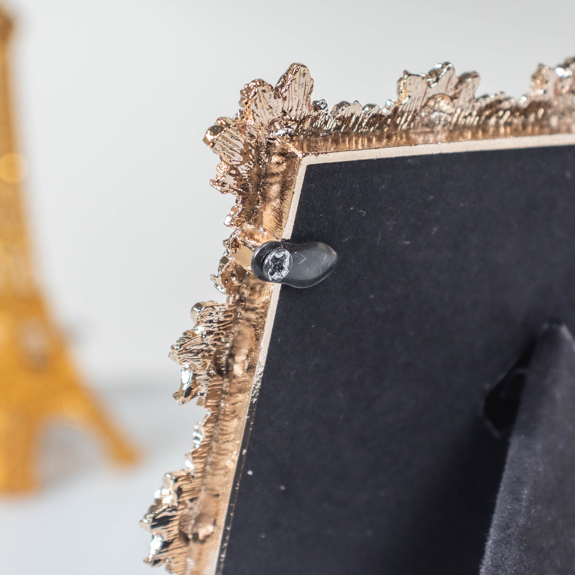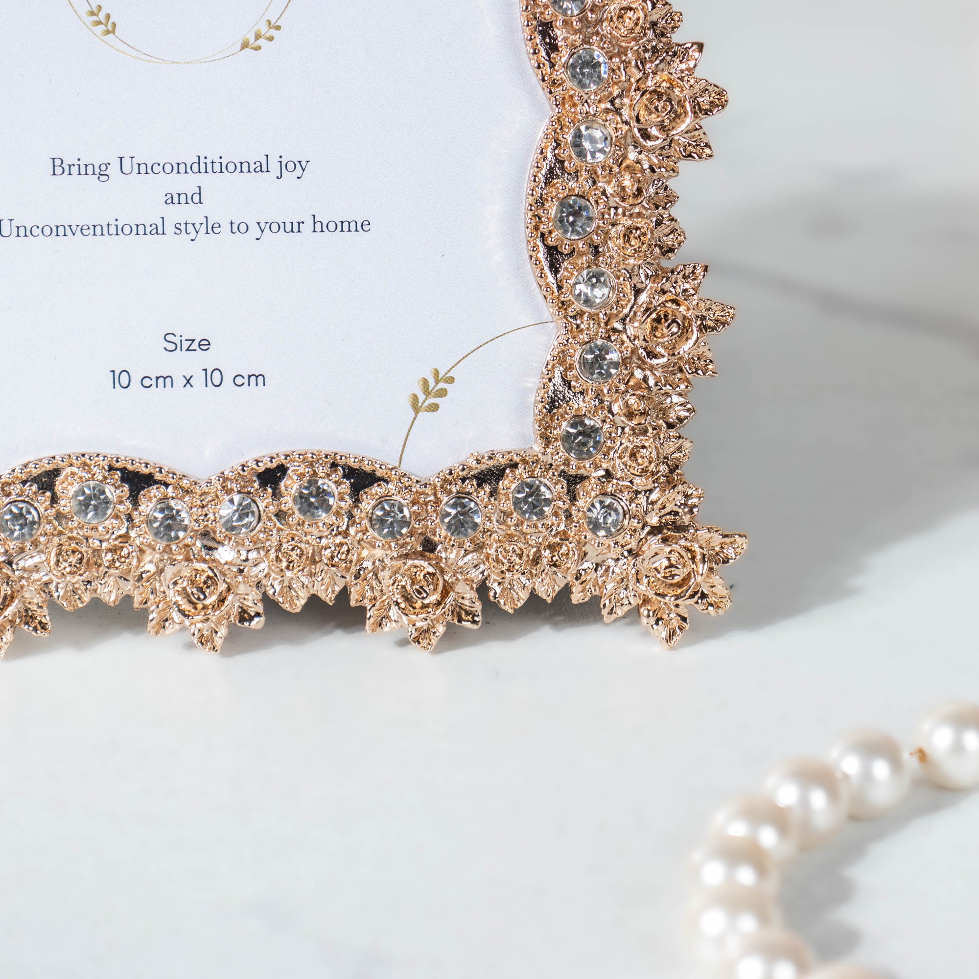 The small-sized photo frame comes with industriously articulated floral motifs in golden that form the outermost edge. Iridescent silver beads sit on the inner wavy edge, making the picture frame look like a sophisticated case to bracket all memories that can empower one with hope.