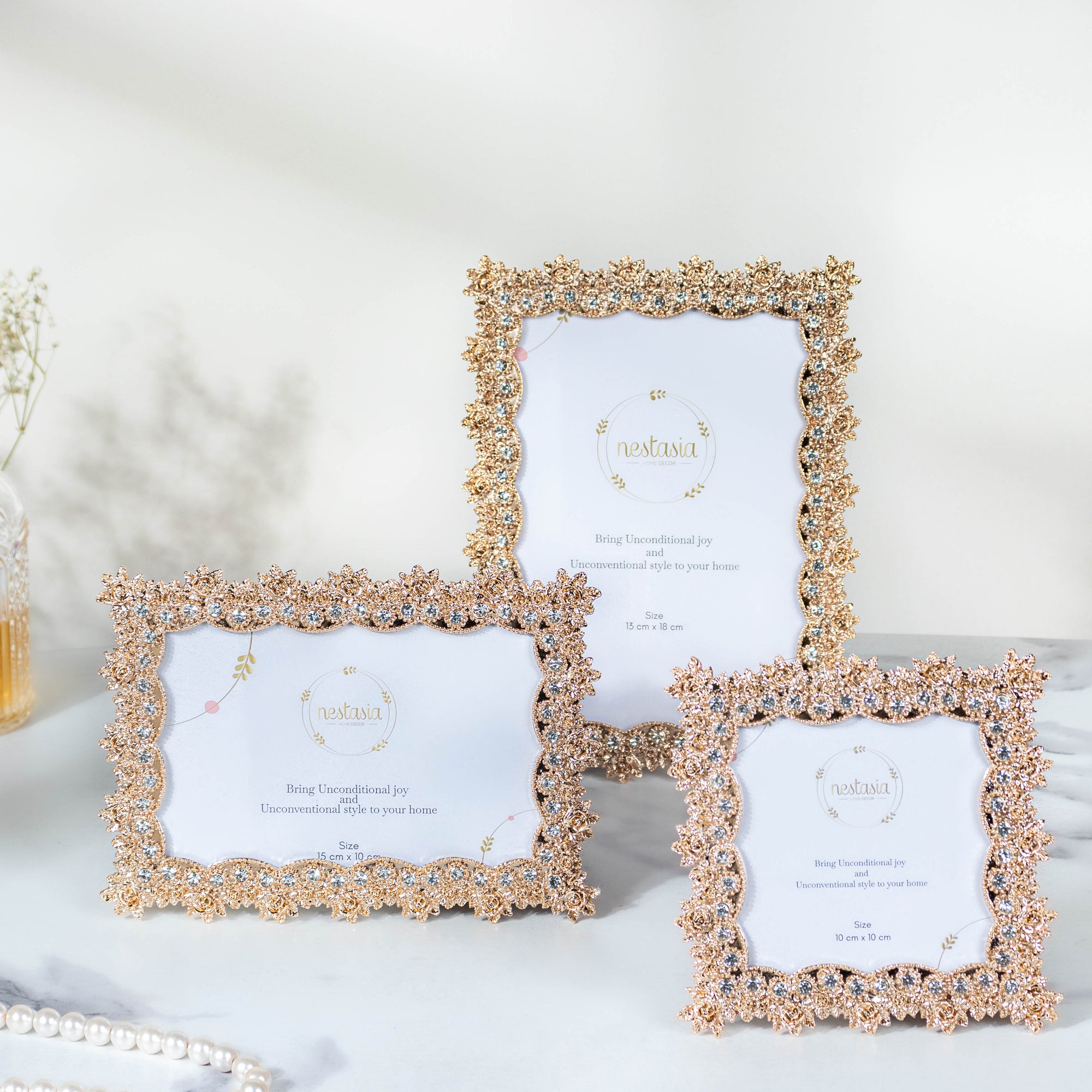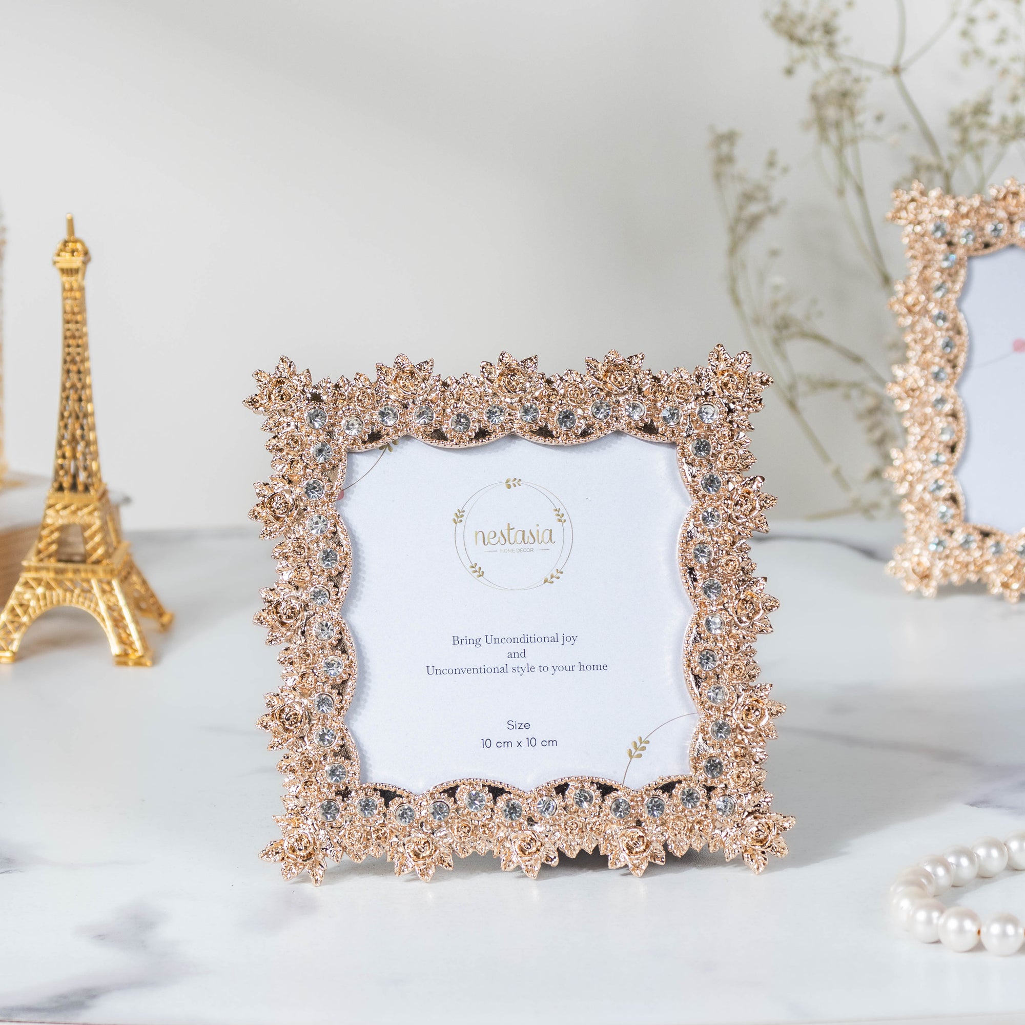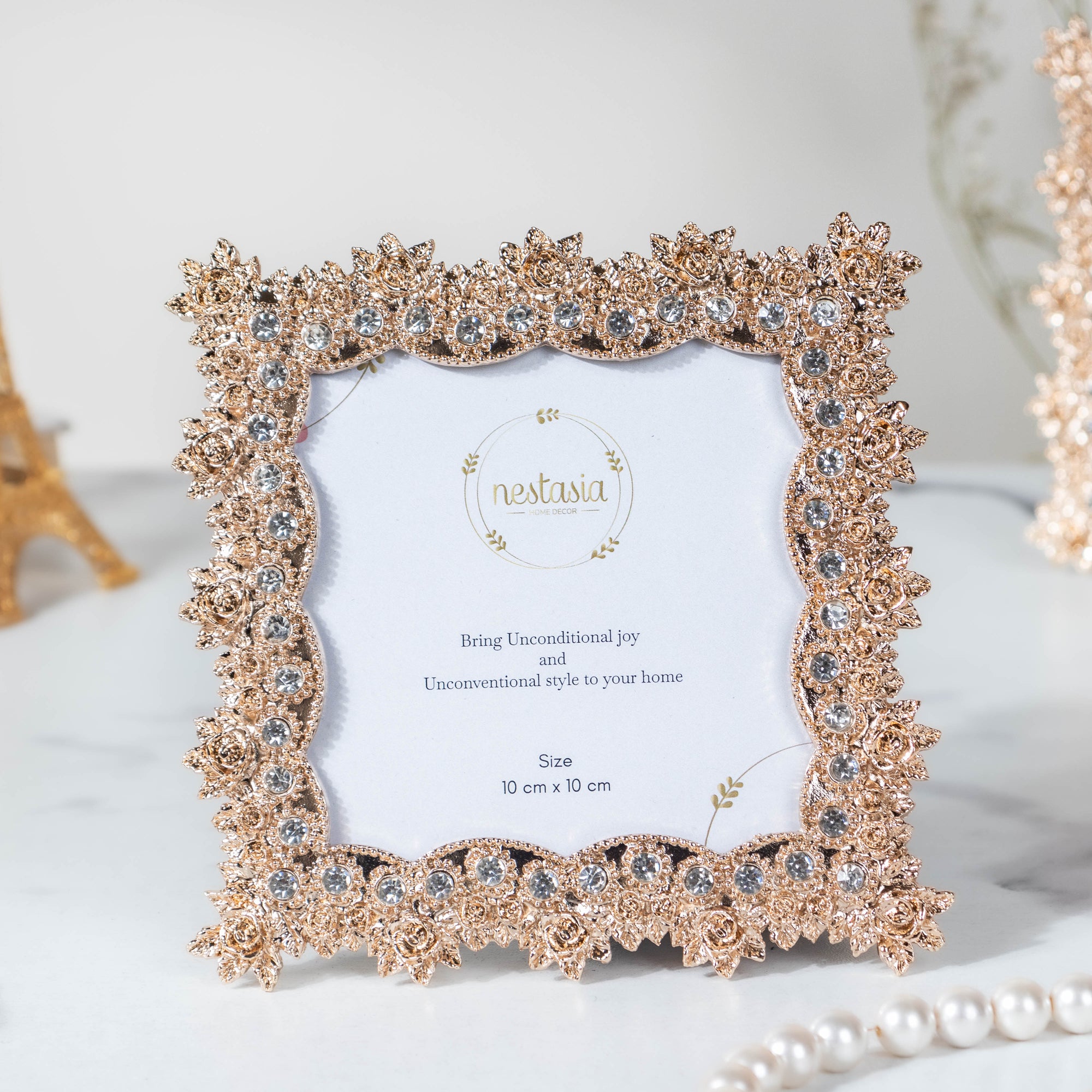 The small-sized photo frame comes with industriously articulated floral motifs in golden that form the outermost edge. Iridescent silver beads sit on the inner wavy edge, making the picture frame look like a sophisticated case to bracket all memories that can empower one with hope.